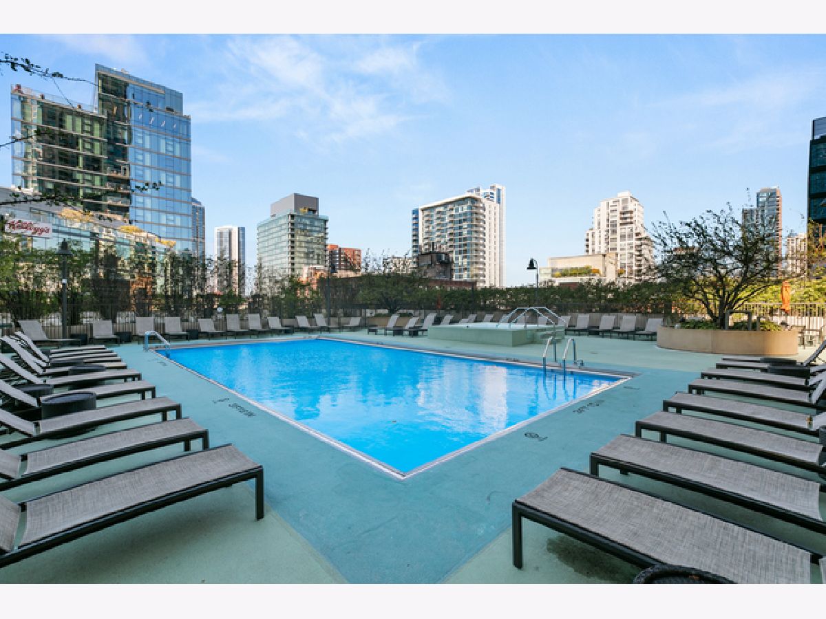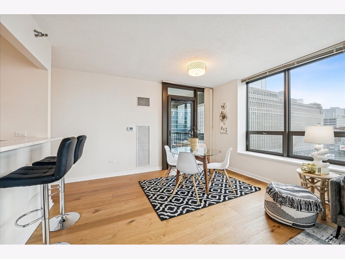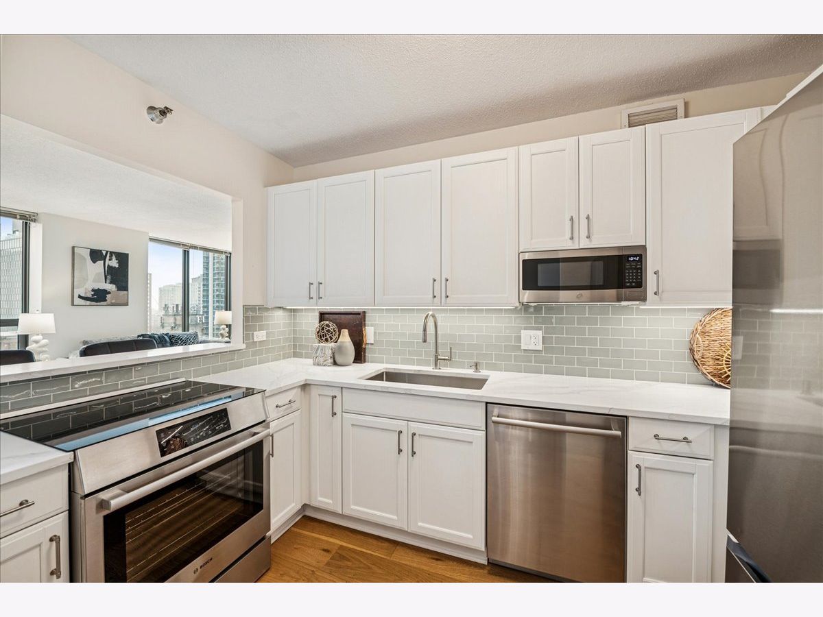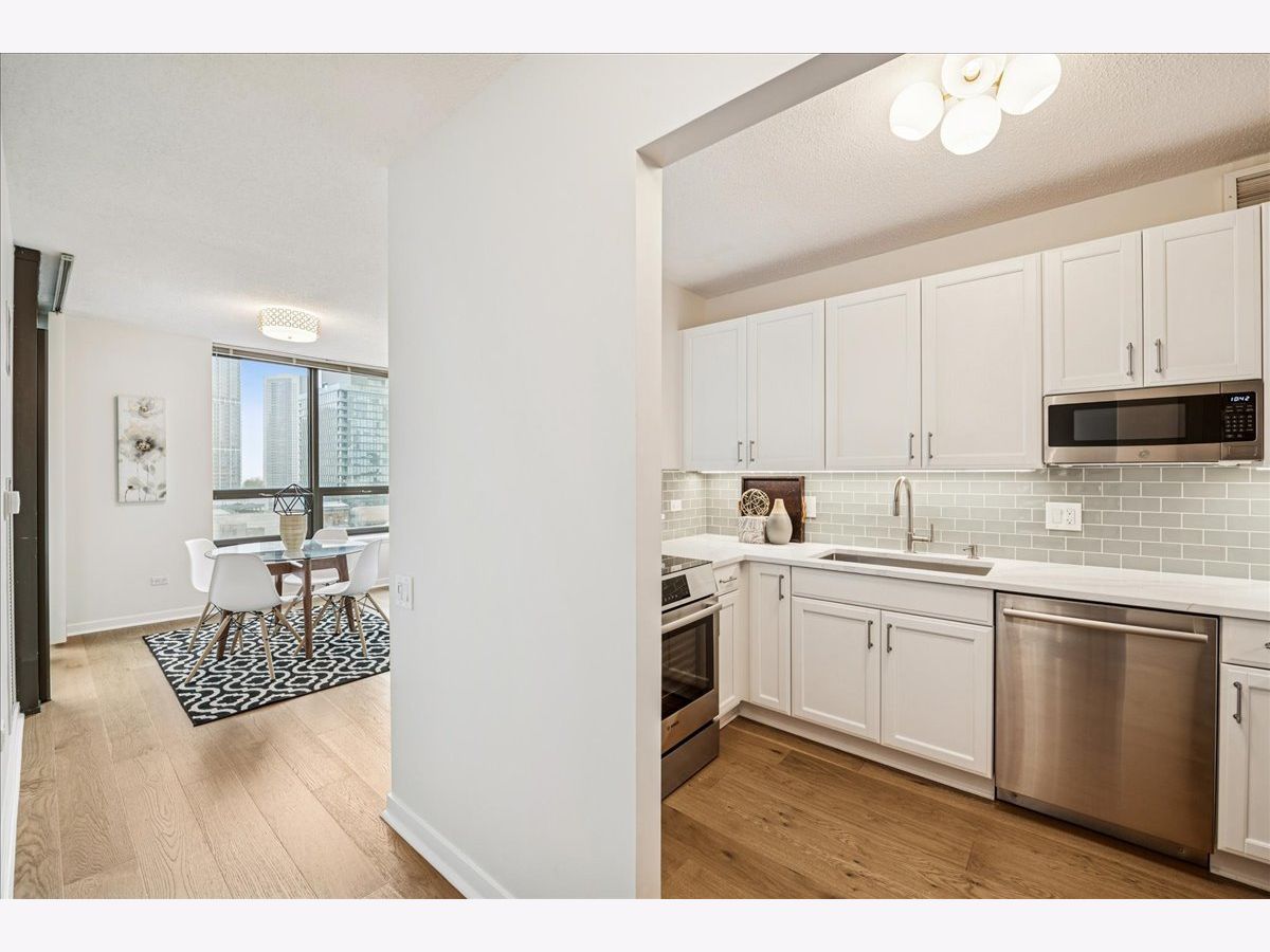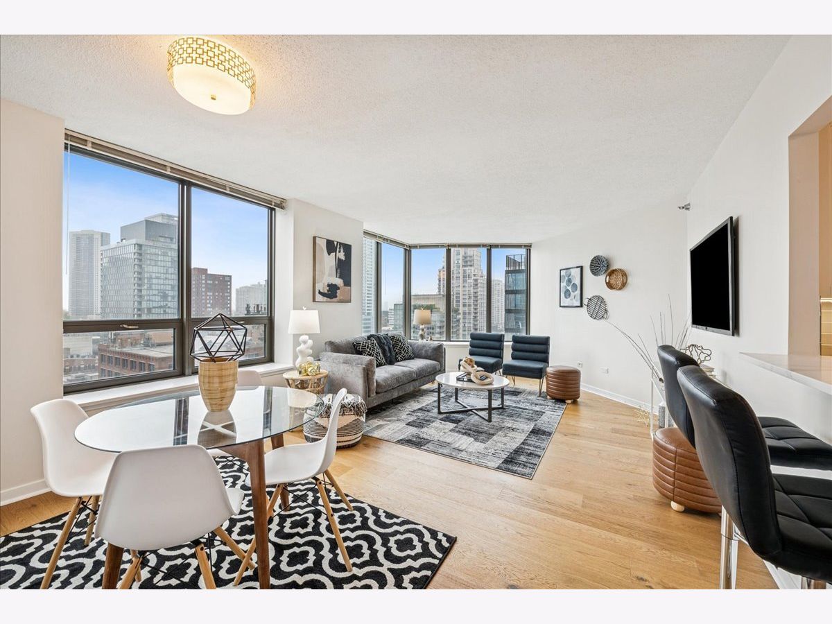 This beautifully remodeled 1-bedroom, 1-bathroom corner condo offers the perfect blend of style, comfort, and convenience in one of Chicago's most desirable neighborhoods: River North. Step into the formal foyer with a tucked-away walk-in closet. Continue down the hallway to the show-stopping, fully renovated kitchen (2024) with new cabinetry, white quartz countertops, a sleek tile backsplash, under-cabinet lighting, deep undermount sink, and high-end appliances including a Bosch induction range/oven, Bosch dishwasher, Samsung refrigerator, and GE microwave. The kitchen island seats 2-3 and opens seamlessly to a spacious dining area that accommodates 6-8 guests, with direct access to your private balcony overlooking the pool deck. The expansive corner living room is framed by oversized windows offering breathtaking city views and dramatic sunsets. The generous primary bedroom easily accommodates a king-size bed and includes a large walk-in closet. The fully renovated bathroom showcases a walk-in shower with Kohler fixtures, a modern Kohler vanity, and a built-in medicine cabinet with front lighting. The laundry features an LG washer/dryer (less than 3 years old). Additional updates include new hardwood floors, fresh paint, modern light fixtures, and new baseboards throughout-truly move-in ready. Building Amenities: Newly renovated 8th-floor fitness center (2023), Resort-style pool deck with pergolas, fire pit, lush landscaping, and four new commercial-grade Weber grills (2025), expansive social/party room with TV, foosball, and ping pong, 24-hour door staff, on-site maintenance, and receiving/dry-cleaning services, secure bike storage, private storage lockers, and dedicated pet relief area, and an active social club hosting regular resident events. Parking is available for lease in the attached garage (approx. $300/month). Perfectly situated just steps from the Riverwalk, East Bank Club, top-rated restaurants, and the Brown & Purple Lines at Merchandise Mart, this home places the very best of Chicago at your doorstep.