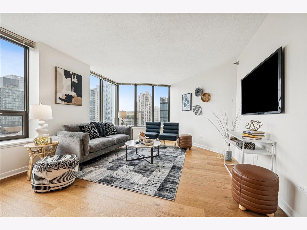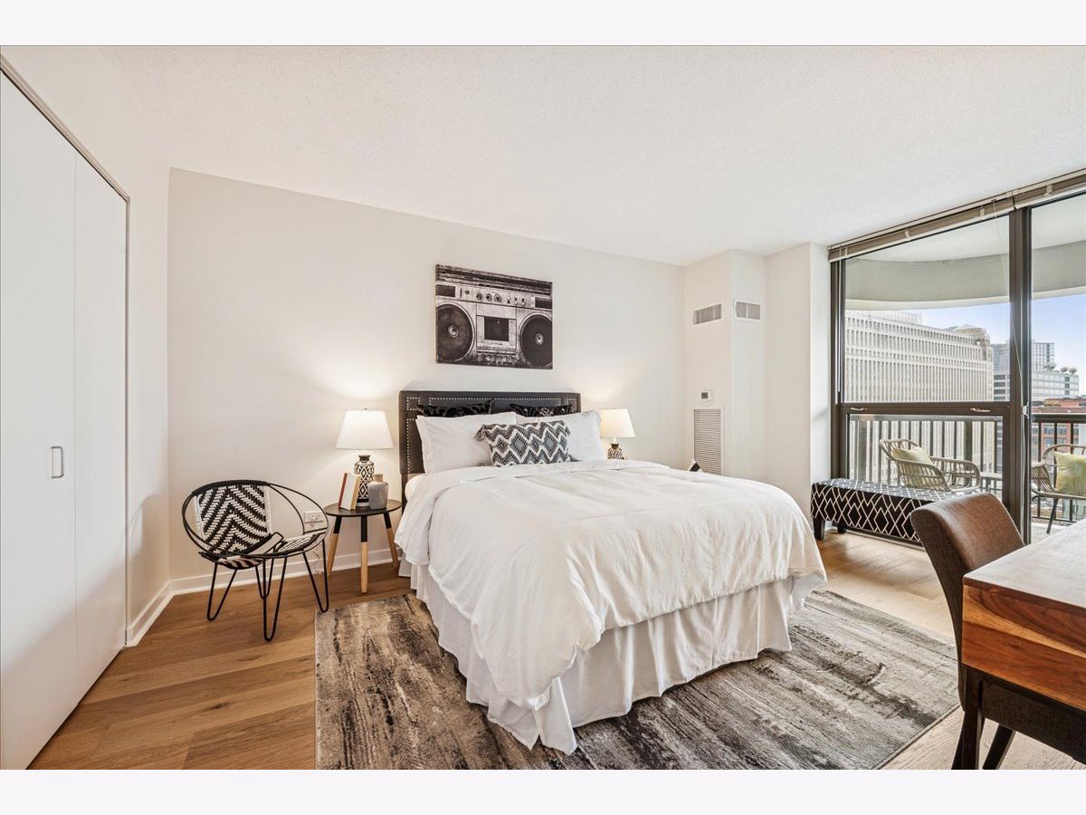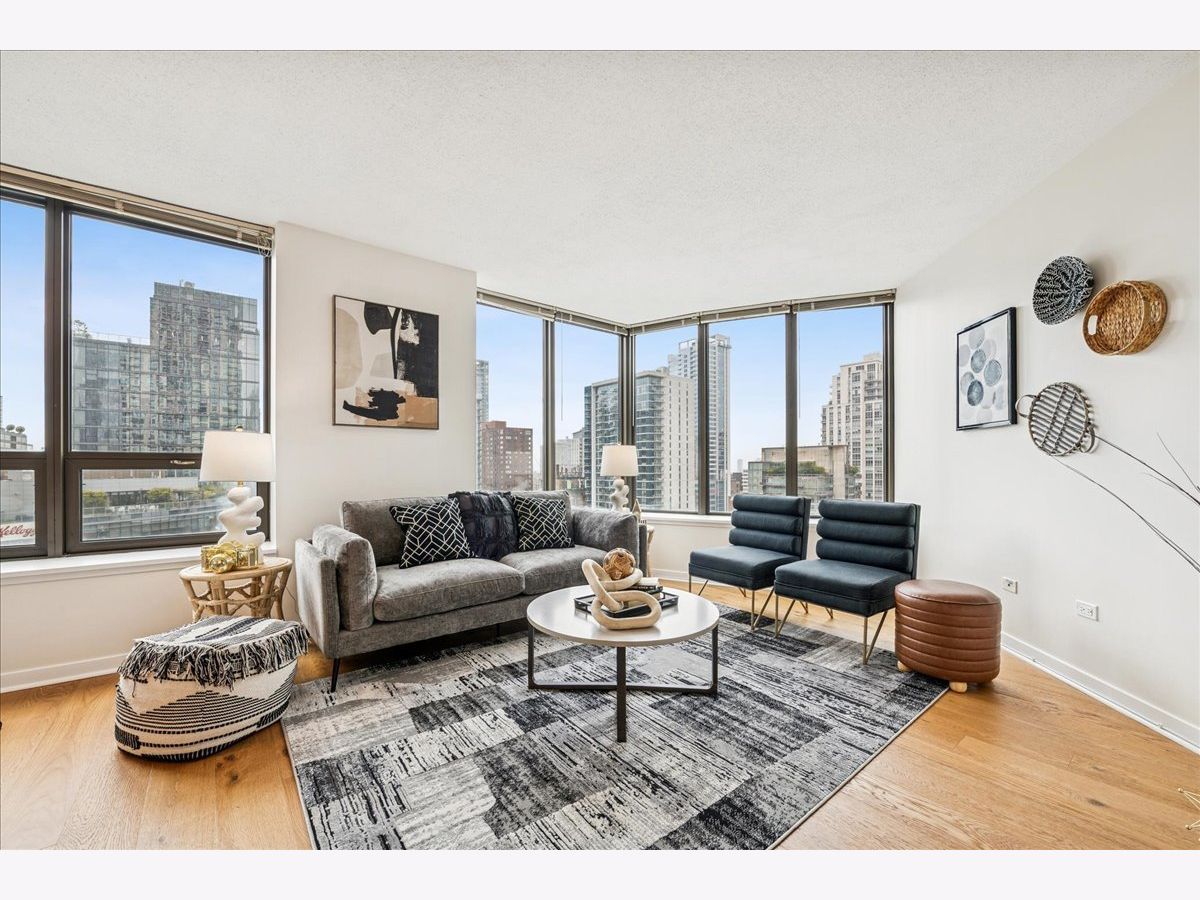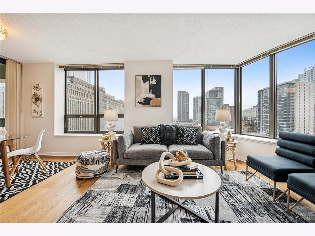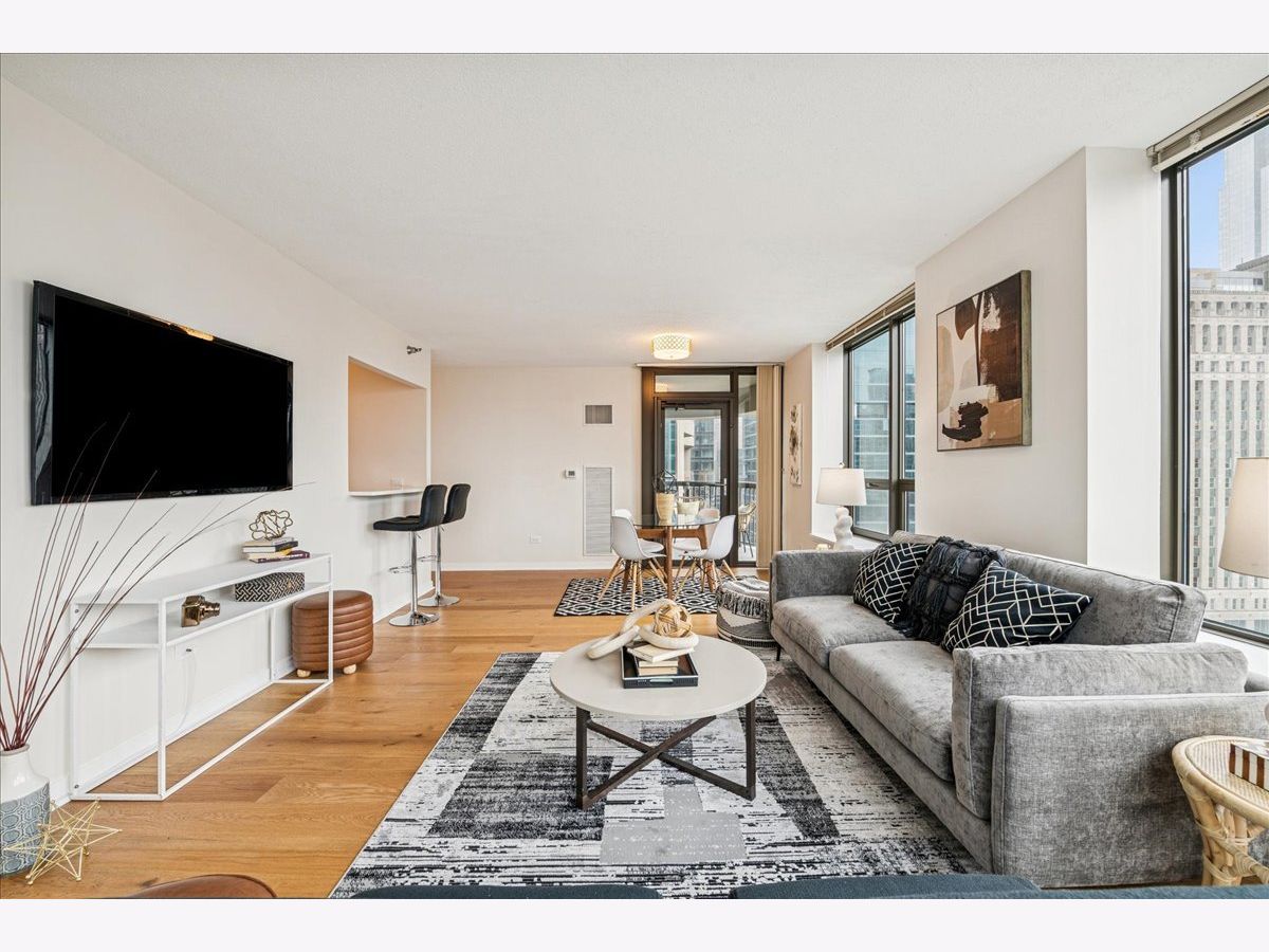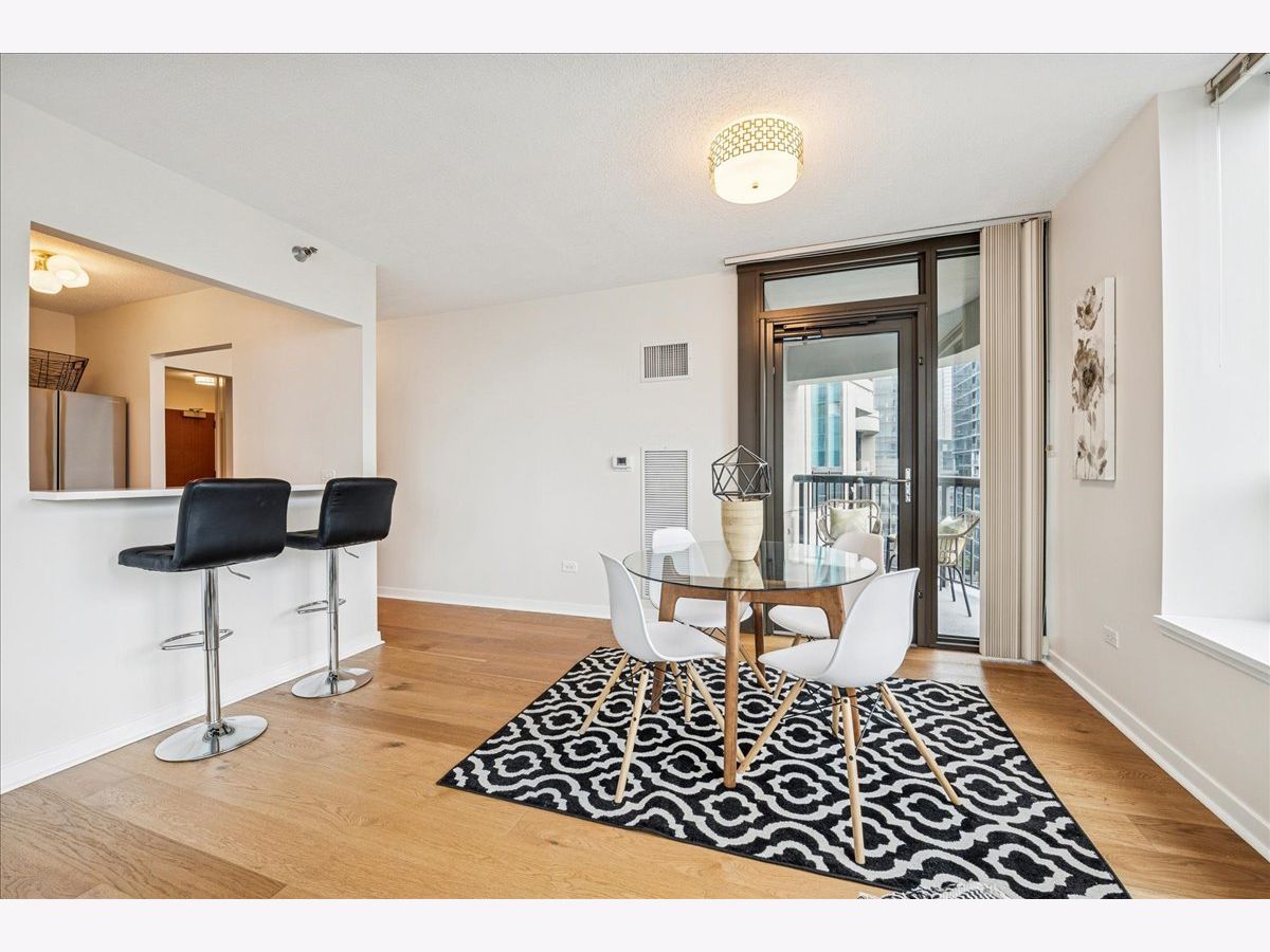 This beautifully remodeled 1-bedroom, 1-bathroom corner condo offers the perfect blend of style, comfort, and convenience in one of Chicago's most desirable neighborhoods: River North. Step into the formal foyer with a tucked-away walk-in closet. Continue down the hallway to the show-stopping, fully renovated kitchen (2024) with new cabinetry, white quartz countertops, a sleek tile backsplash, under-cabinet lighting, deep undermount sink, and high-end appliances including a Bosch induction range/oven, Bosch dishwasher, Samsung refrigerator, and GE microwave. The kitchen island seats 2-3 and opens seamlessly to a spacious dining area that accommodates 6-8 guests, with direct access to your private balcony overlooking the pool deck. The expansive corner living room is framed by oversized windows offering breathtaking city views and dramatic sunsets. The generous primary bedroom easily accommodates a king-size bed and includes a large walk-in closet. The fully renovated bathroom showcases a walk-in shower with Kohler fixtures, a modern Kohler vanity, and a built-in medicine cabinet with front lighting. The laundry features an LG washer/dryer (less than 3 years old). Additional updates include new hardwood floors, fresh paint, modern light fixtures, and new baseboards throughout-truly move-in ready. Building Amenities: Newly renovated 8th-floor fitness center (2023), Resort-style pool deck with pergolas, fire pit, lush landscaping, and four new commercial-grade Weber grills (2025), expansive social/party room with TV, foosball, and ping pong, 24-hour door staff, on-site maintenance, and receiving/dry-cleaning services, secure bike storage, private storage lockers, and dedicated pet relief area, and an active social club hosting regular resident events. Parking is available for lease in the attached garage (approx. $300/month). Perfectly situated just steps from the Riverwalk, East Bank Club, top-rated restaurants, and the Brown & Purple Lines at Merchandise Mart, this home places the very best of Chicago at your doorstep.