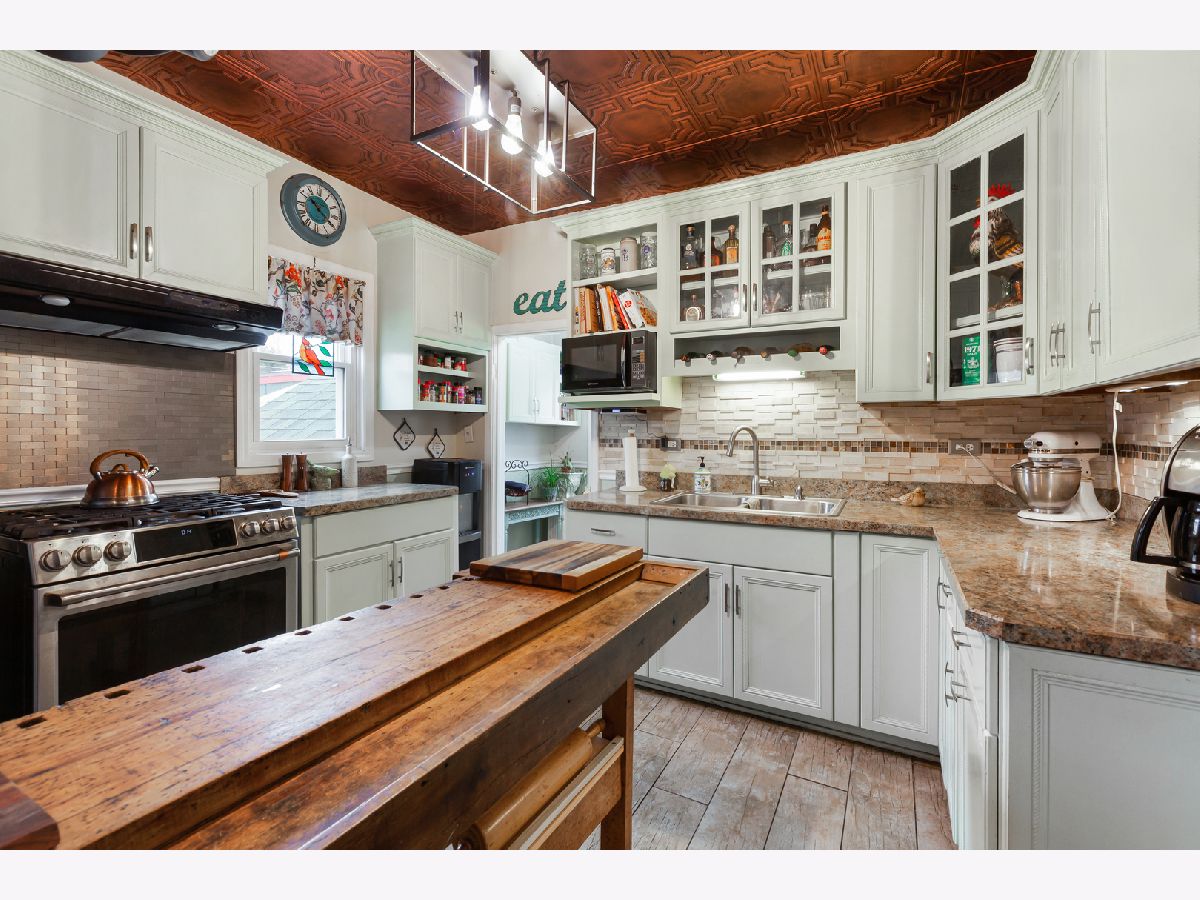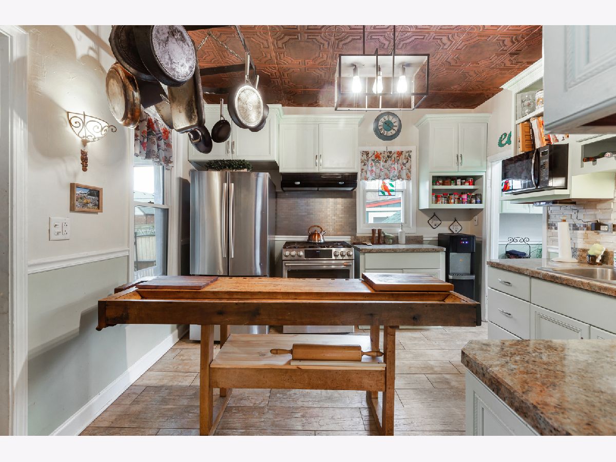 This home is a true standout, overflowing with character, creativity, and thoughtful design you simply won't find anywhere else. Every detail has been carefully curated by the sellers, blending artistic expression with everyday functionality. It truly must be seen to be fully appreciated. The living and dining rooms immediately impress with whitewashed wood plank ceilings, creating warmth and architectural charm. The main-level bedroom, currently used as a cozy sitting room, features a stunning French Provincial tile ceiling, while the kitchen showcases a striking copper-look ceiling that adds depth and personality. Shiplap accents the living room, and crisp white crown molding and baseboards tie everything together beautifully. Designed for someone who truly loves to cook, the kitchen offers custom cabinetry, a tiled backsplash, and a stainless steel backsplash behind the six-burner stove for easy maintenance. (The baker's rack stays!) This home offers two full bathrooms, including one conveniently located on the main level. Upstairs, notice the charming accent window along the staircase that fills the space with natural light. The primary and second bedrooms both feature double closets, while the third bedroom, currently used as an office, includes an extra closet creatively repurposed as an entertainment nook. Engineered hardwood flooring runs throughout this level. Important updates provide peace of mind, including new attic wiring and insulation, hard-wired smoke and CO detectors, new copper plumbing, and a waterproofed basement complete with plastic barrier and sump pump. And then... there's the backyard. Step through the enclosed back porch to a 23x12 deck that leads to your own private retreat. Enjoy the enclosed hot tub room, a separate "beer garden" gathering space, and an above-ground pool, the ultimate setup for entertaining or relaxing at home. The fenced yard offers privacy, and a shed provides additional storage. This is more than a house - it's an experience. If you're looking for something truly unique with incredible entertaining space, this is the one.