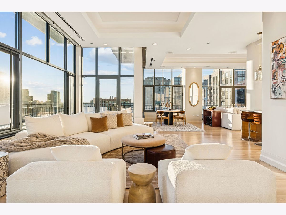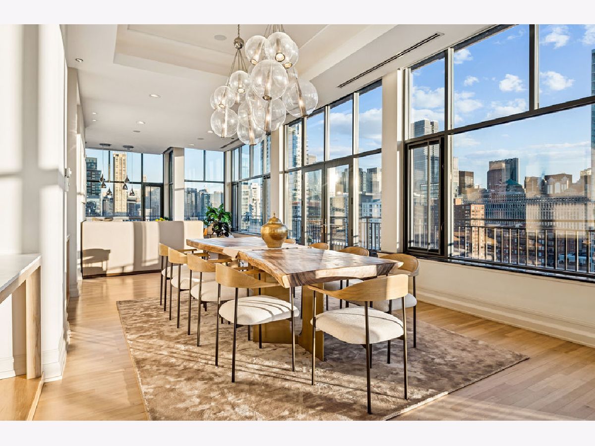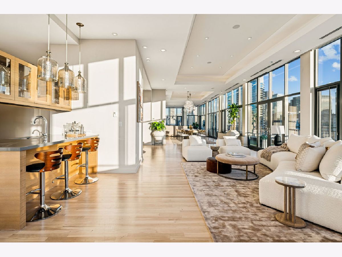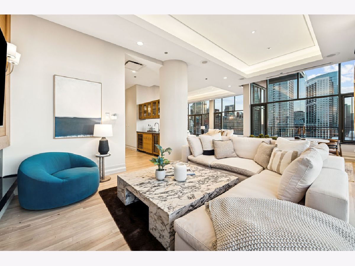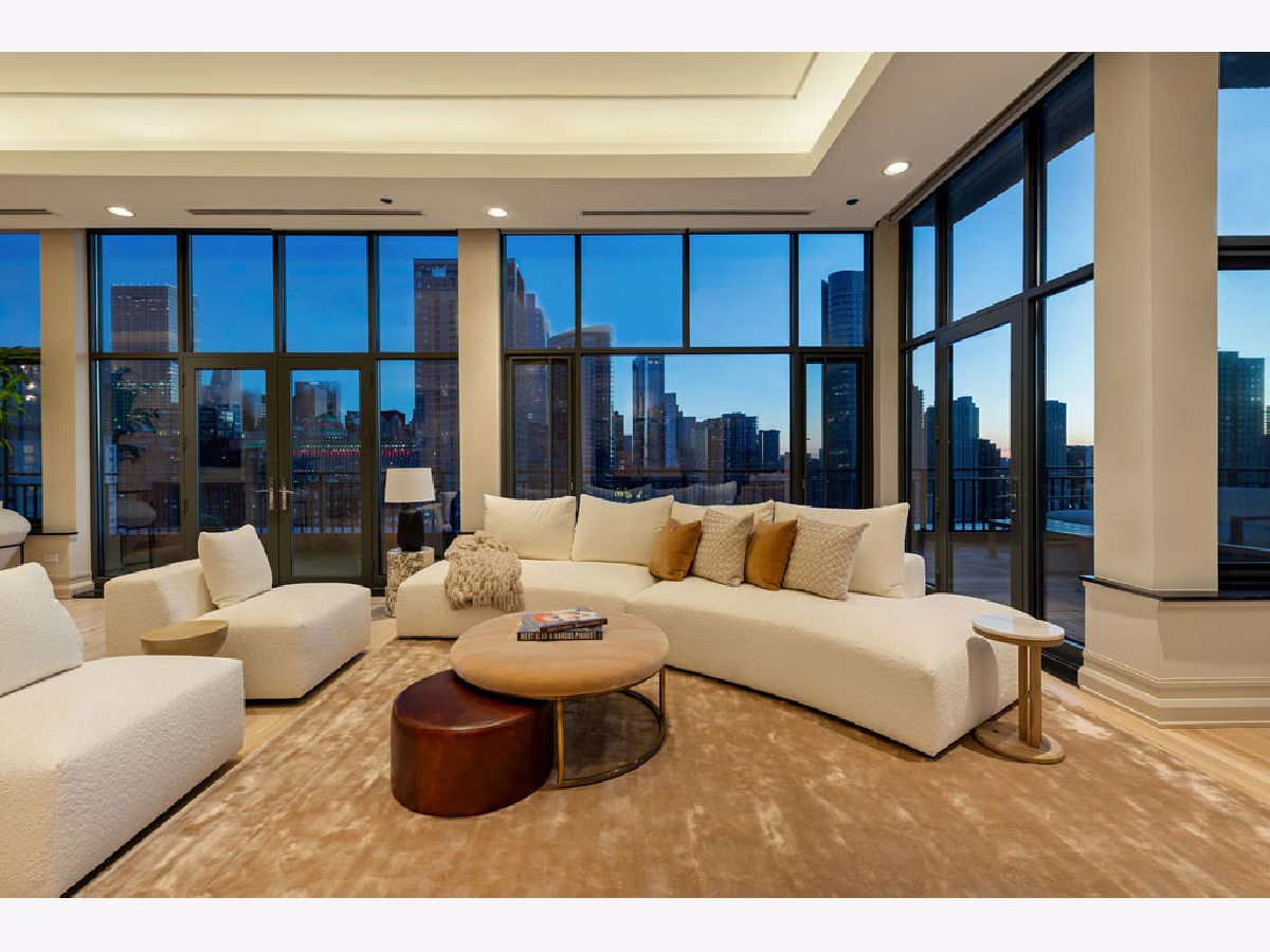 Fully furnished, turn-key full-floor penthouse in the heart of River North. Occupying the entire 18th floor of Gallery 400, this 6,800 SF, 4BD/4BA+1HB residence offers private elevator entry, sweeping open living spaces, and 2,400 SF of wraparound terrace with 360 skyline views. A gallery-style reception hall with herringbone hardwood floors leads to an expansive great room with coffered ceilings, design-forward lighting, and a living area anchored by a low-profile gas fireplace. The chef's kitchen features an oversized island with dine-up seating, seamless backsplash, custom cabinetry, and top-tier appliances. A chic wet bar with counter seating, glass display shelves, and wine fridge enhances the home's exceptional entertaining flow. World-class fixtures and finishes are showcased throughout. The light-filled primary suite includes framed designer wallcoverings, a drop chandelier, two custom walk-in closets (one with styling/accessories island, one with an owner's suite wet bar), and a five-star-caliber bath with dual vanities, soaking tub, walk-in shower, and steam closet. A sizable in-unit laundry room adds convenience. Nearly every room opens directly to the private terrace for rare single-level indoor/outdoor living. Building amenities include 24-hour door staff, fitness center, on-site management, bike storage, pet-friendly living, and two heated garage spaces. Steps to River North dining, galleries, shopping, East Bank Club, BIAN, parks, transit, and the riverfront.