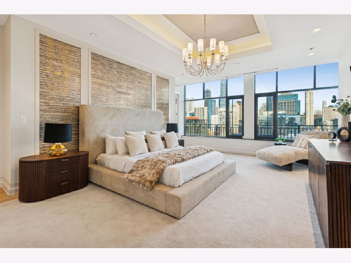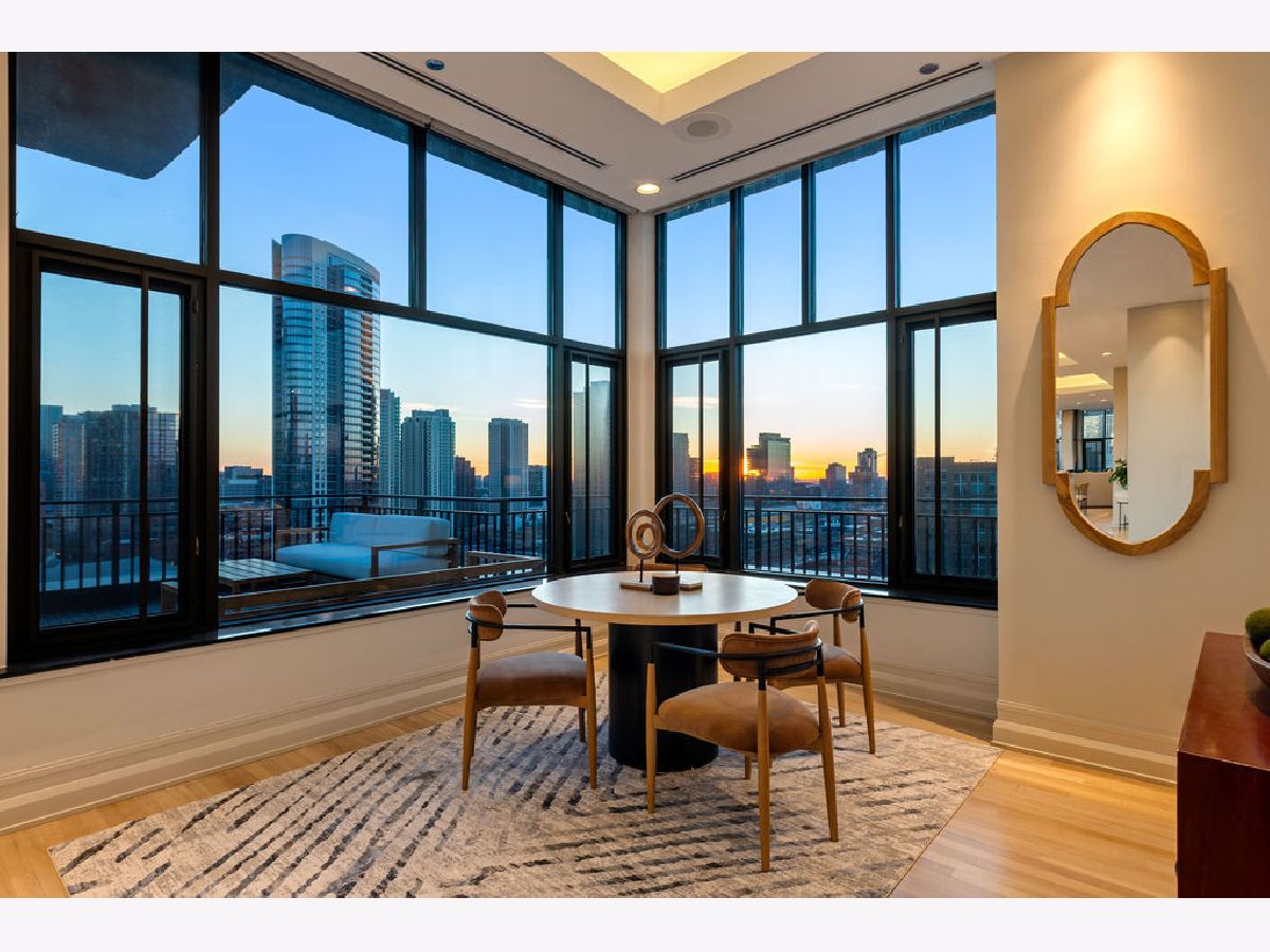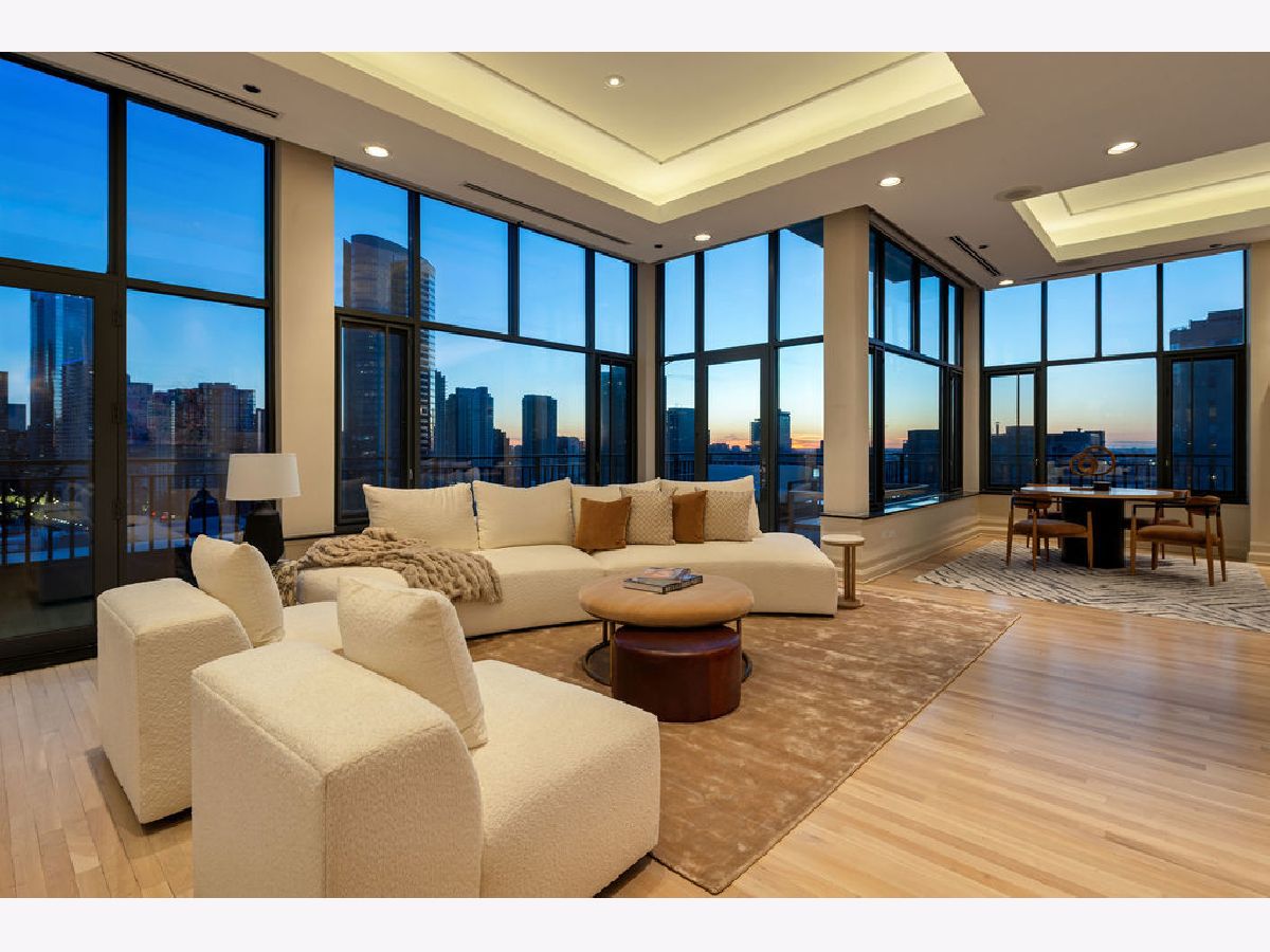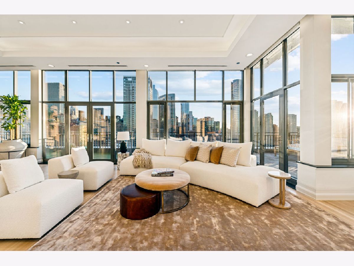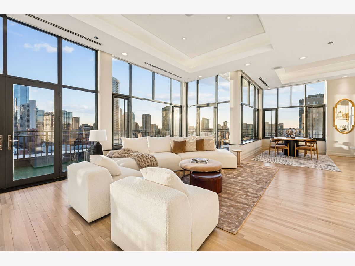 Fully furnished, turn-key full-floor penthouse in the heart of River North. Occupying the entire 18th floor of Gallery 400, this 6,800 SF, 4BD/4BA+1HB residence offers private elevator entry, sweeping open living spaces, and 2,400 SF of wraparound terrace with 360 skyline views. A gallery-style reception hall with herringbone hardwood floors leads to an expansive great room with coffered ceilings, design-forward lighting, and a living area anchored by a low-profile gas fireplace. The chef's kitchen features an oversized island with dine-up seating, seamless backsplash, custom cabinetry, and top-tier appliances. A chic wet bar with counter seating, glass display shelves, and wine fridge enhances the home's exceptional entertaining flow. World-class fixtures and finishes are showcased throughout. The light-filled primary suite includes framed designer wallcoverings, a drop chandelier, two custom walk-in closets (one with styling/accessories island, one with an owner's suite wet bar), and a five-star-caliber bath with dual vanities, soaking tub, walk-in shower, and steam closet. A sizable in-unit laundry room adds convenience. Nearly every room opens directly to the private terrace for rare single-level indoor/outdoor living. Building amenities include 24-hour door staff, fitness center, on-site management, bike storage, pet-friendly living, and two heated garage spaces. Steps to River North dining, galleries, shopping, East Bank Club, BIAN, parks, transit, and the riverfront.