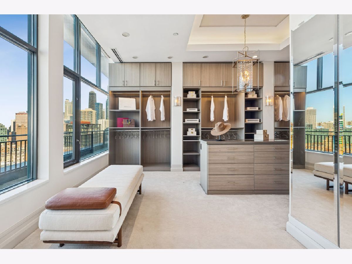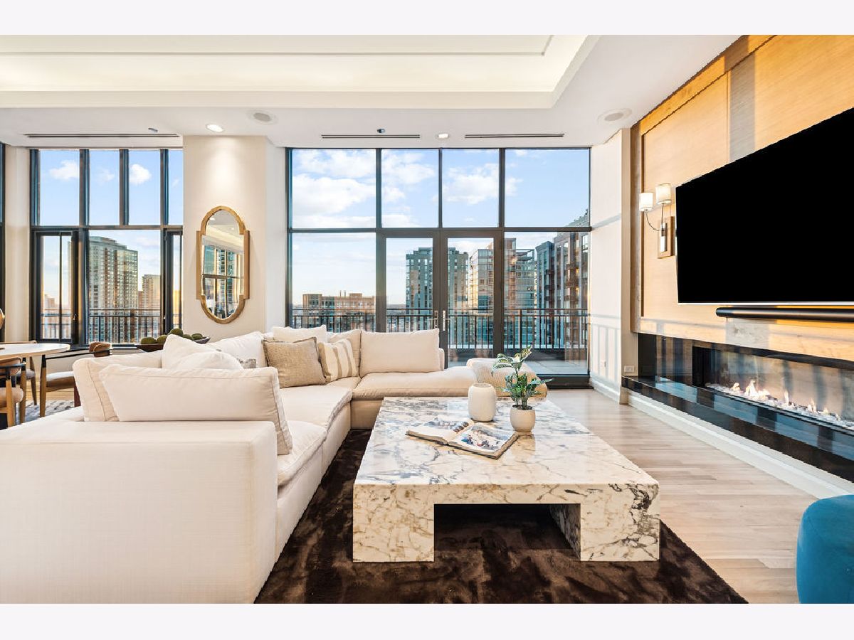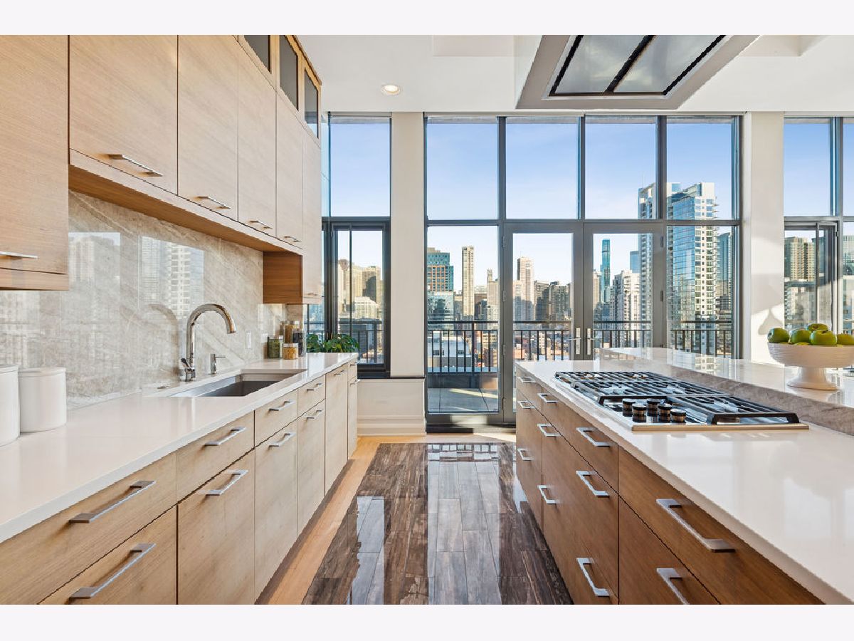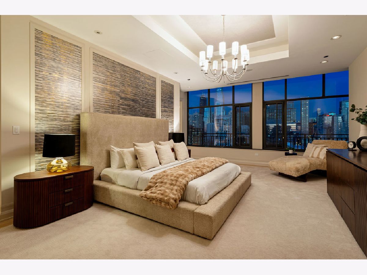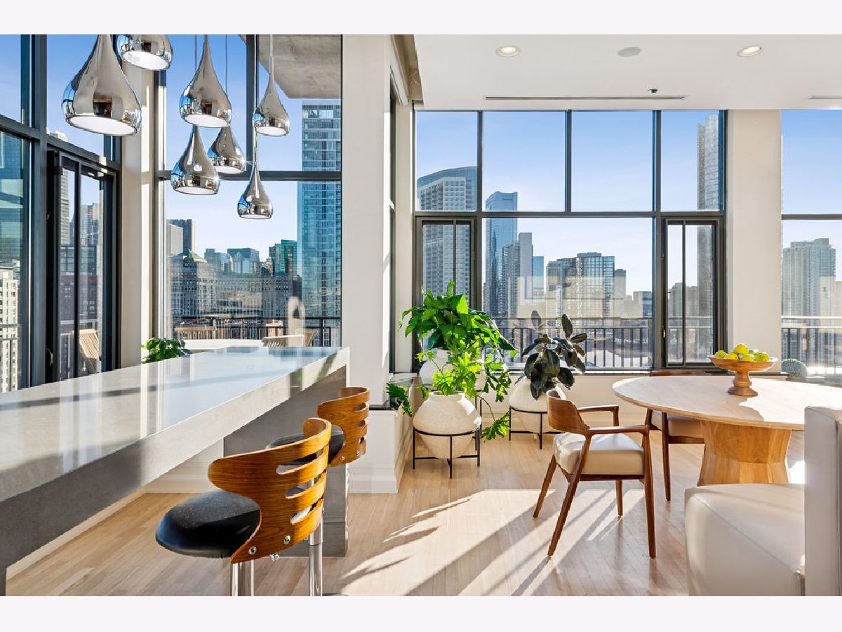 Fully furnished, turn-key full-floor penthouse in the heart of River North. Occupying the entire 18th floor of Gallery 400, this 6,800 SF, 4BD/4BA+1HB residence offers private elevator entry, sweeping open living spaces, and 2,400 SF of wraparound terrace with 360 skyline views. A gallery-style reception hall with herringbone hardwood floors leads to an expansive great room with coffered ceilings, design-forward lighting, and a living area anchored by a low-profile gas fireplace. The chef's kitchen features an oversized island with dine-up seating, seamless backsplash, custom cabinetry, and top-tier appliances. A chic wet bar with counter seating, glass display shelves, and wine fridge enhances the home's exceptional entertaining flow. World-class fixtures and finishes are showcased throughout. The light-filled primary suite includes framed designer wallcoverings, a drop chandelier, two custom walk-in closets (one with styling/accessories island, one with an owner's suite wet bar), and a five-star-caliber bath with dual vanities, soaking tub, walk-in shower, and steam closet. A sizable in-unit laundry room adds convenience. Nearly every room opens directly to the private terrace for rare single-level indoor/outdoor living. Building amenities include 24-hour door staff, fitness center, on-site management, bike storage, pet-friendly living, and two heated garage spaces. Steps to River North dining, galleries, shopping, East Bank Club, BIAN, parks, transit, and the riverfront.