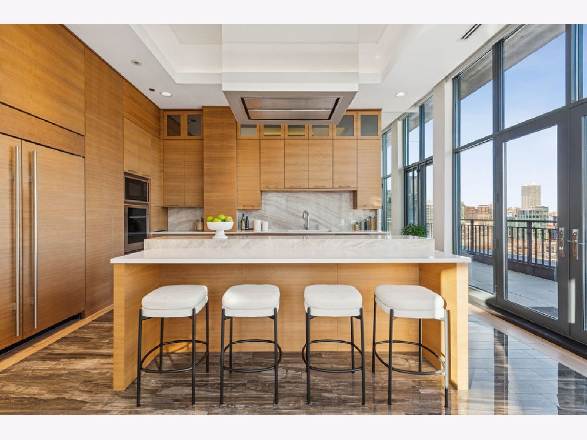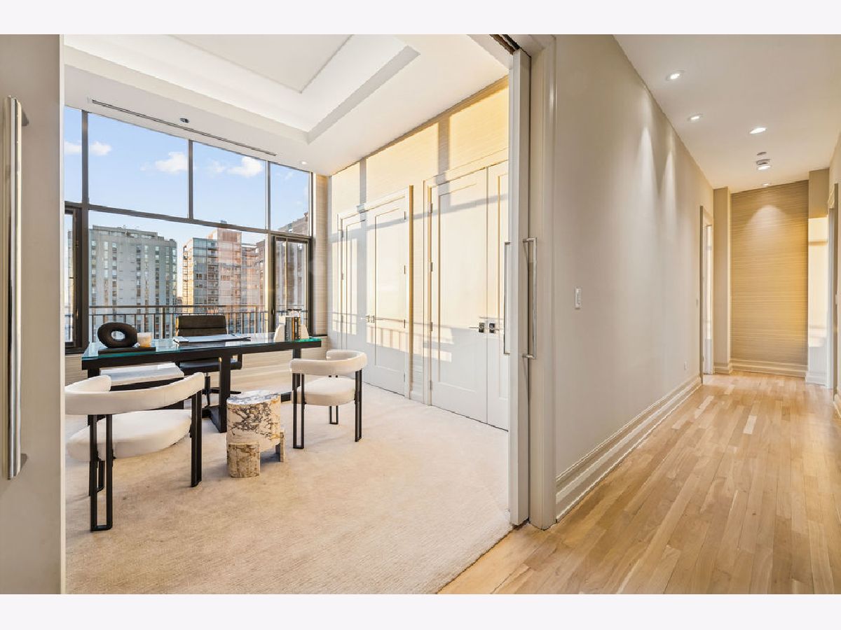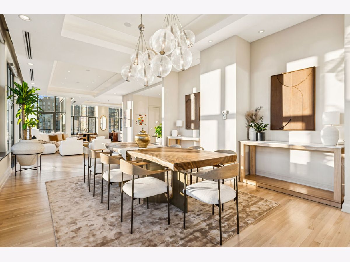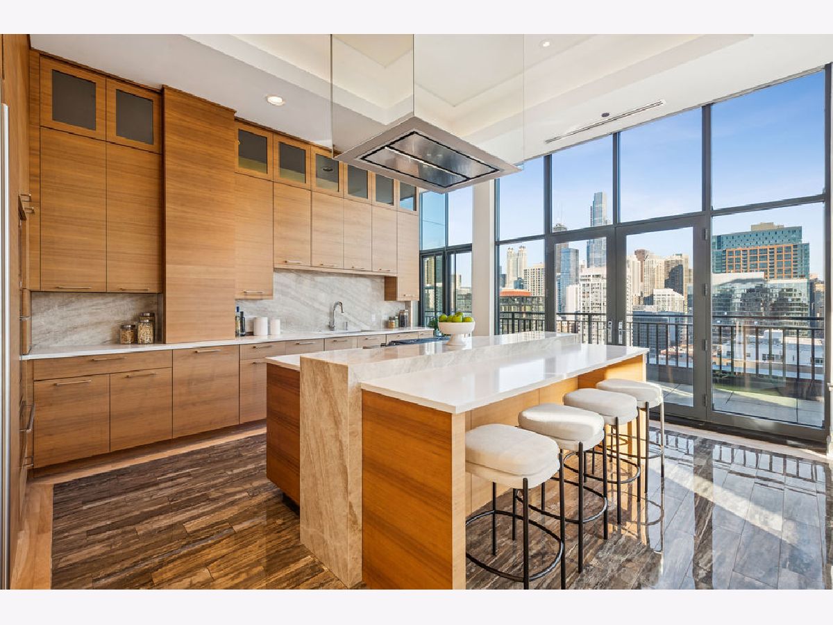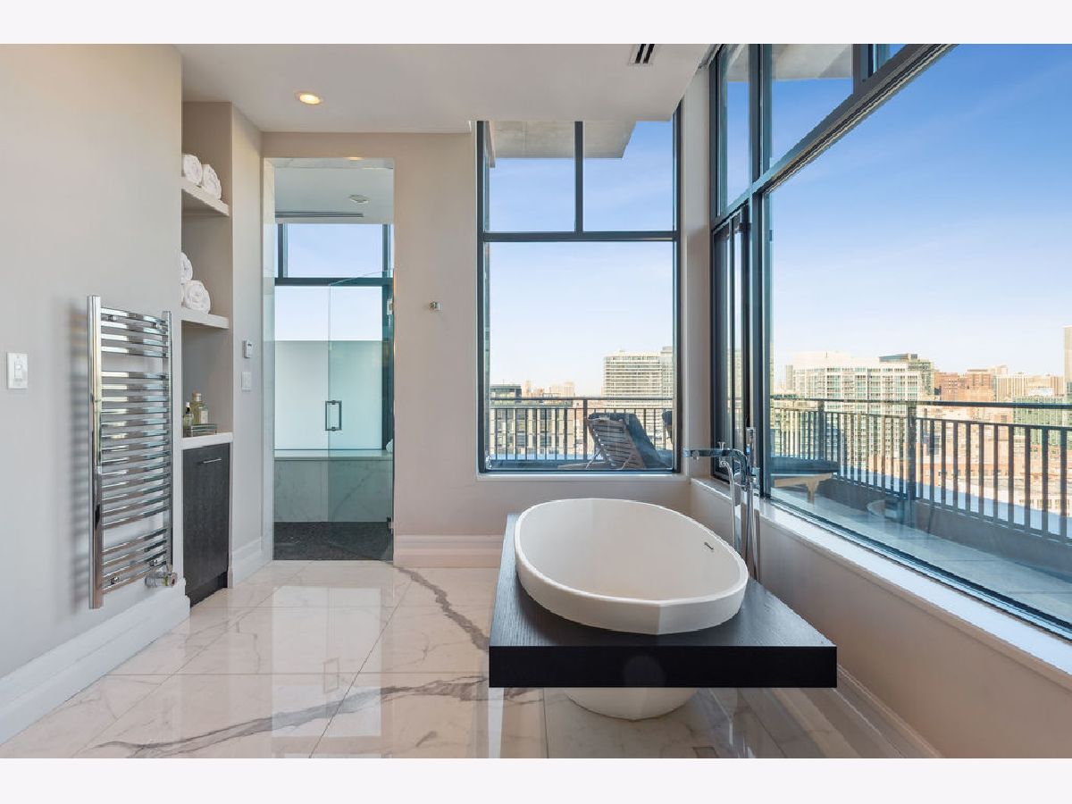 Fully furnished, turn-key full-floor penthouse in the heart of River North. Occupying the entire 18th floor of Gallery 400, this 6,800 SF, 4BD/4BA+1HB residence offers private elevator entry, sweeping open living spaces, and 2,400 SF of wraparound terrace with 360 skyline views. A gallery-style reception hall with herringbone hardwood floors leads to an expansive great room with coffered ceilings, design-forward lighting, and a living area anchored by a low-profile gas fireplace. The chef's kitchen features an oversized island with dine-up seating, seamless backsplash, custom cabinetry, and top-tier appliances. A chic wet bar with counter seating, glass display shelves, and wine fridge enhances the home's exceptional entertaining flow. World-class fixtures and finishes are showcased throughout. The light-filled primary suite includes framed designer wallcoverings, a drop chandelier, two custom walk-in closets (one with styling/accessories island, one with an owner's suite wet bar), and a five-star-caliber bath with dual vanities, soaking tub, walk-in shower, and steam closet. A sizable in-unit laundry room adds convenience. Nearly every room opens directly to the private terrace for rare single-level indoor/outdoor living. Building amenities include 24-hour door staff, fitness center, on-site management, bike storage, pet-friendly living, and two heated garage spaces. Steps to River North dining, galleries, shopping, East Bank Club, BIAN, parks, transit, and the riverfront.