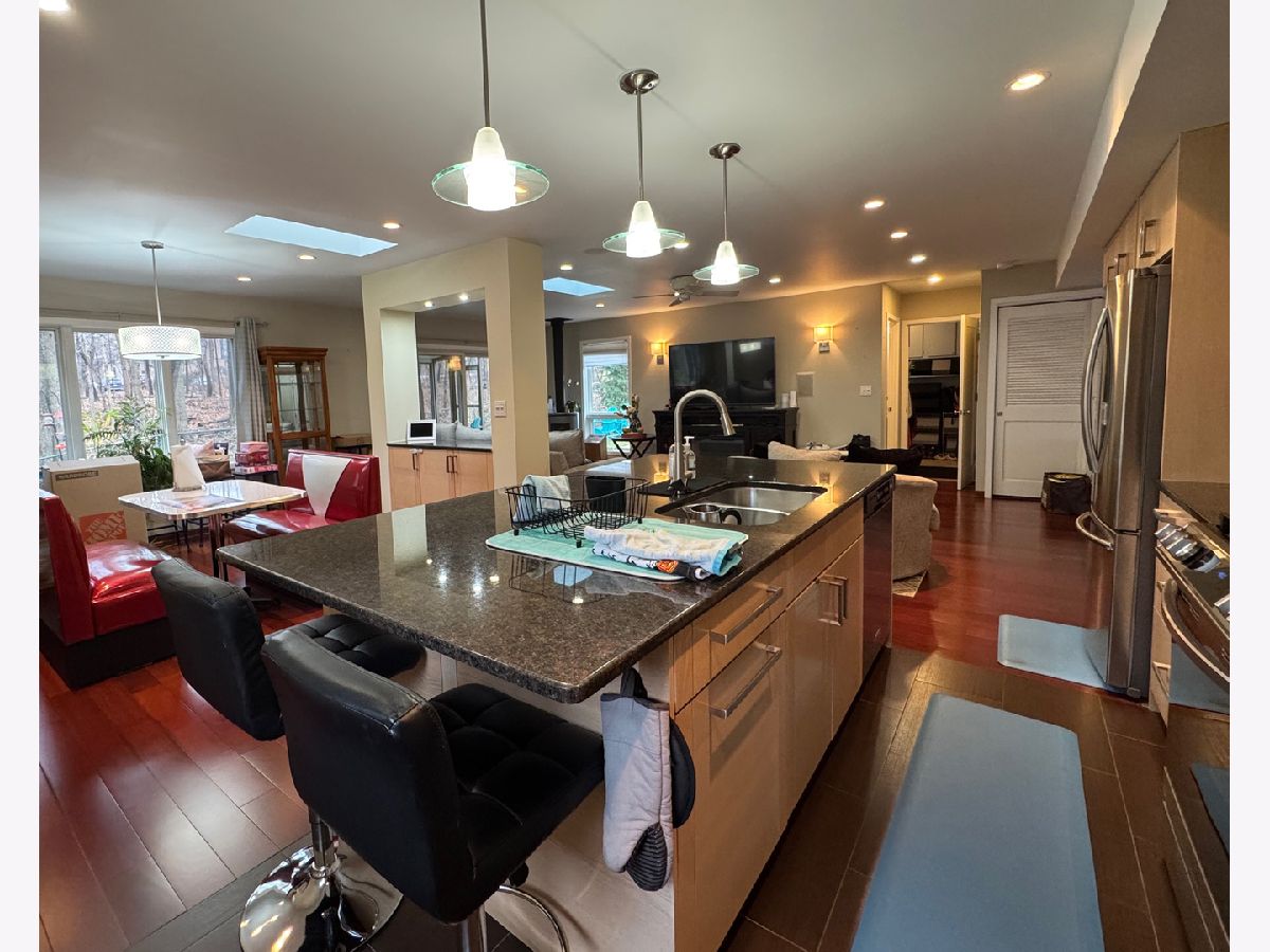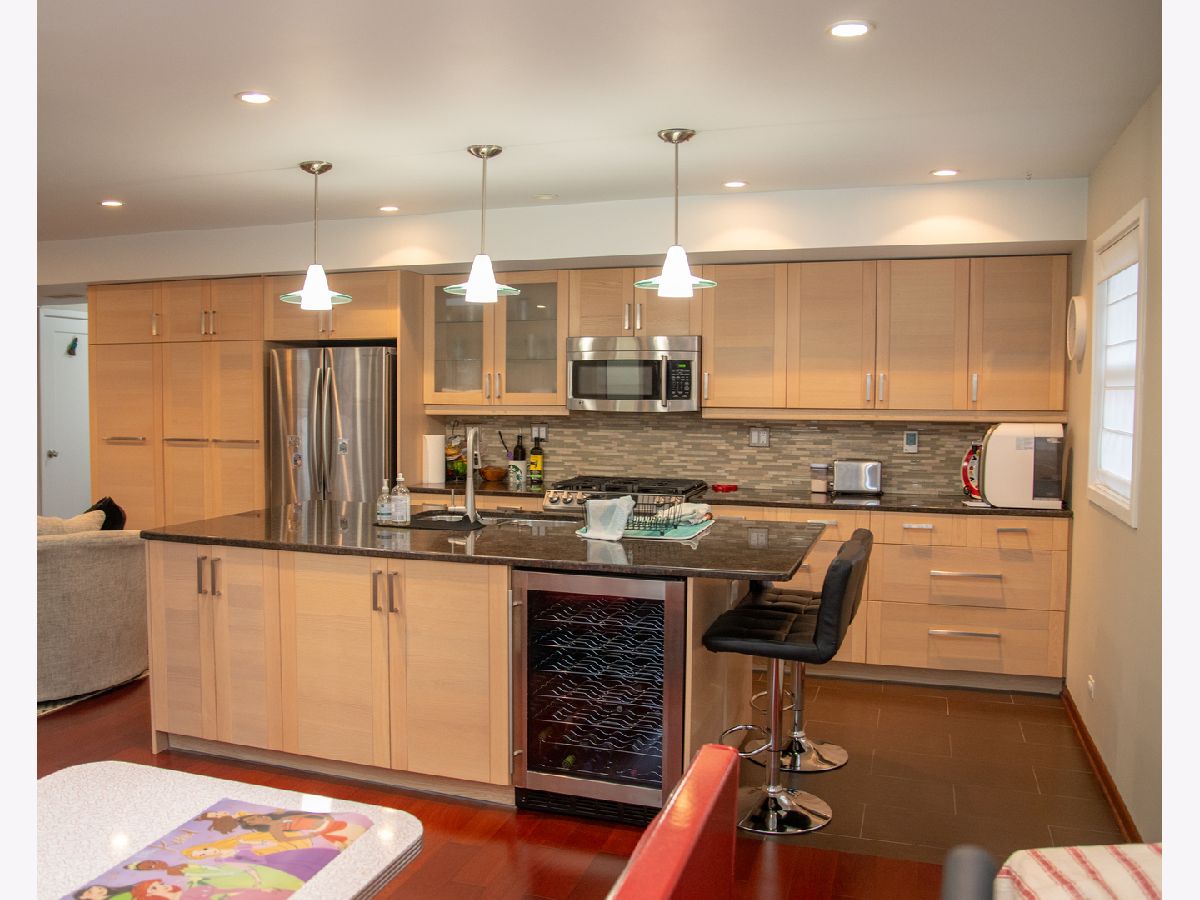 Small-town charm with a country feel. This home is within walking distance to the Commons, Metra, post office, library, park district, and the Old Plank Trail. A private, tree-lined backyard offers a peaceful retreat with a concrete patio and outdoor fire pit-perfect for relaxing and entertaining. Inside, Brazilian cherry floors enhance the foyer, family, and dining rooms, while cozy evenings are enjoyed by the Majestic gas fireplace or Danish wood-burning stove. The open-concept kitchen, dining, and family rooms are ideal for gatherings, featuring heated floors in the kitchen area, stainless steel appliances, modern lighting, a beverage cooler, and beechwood cabinetry. A screened-in porch adds another inviting space to unwind.