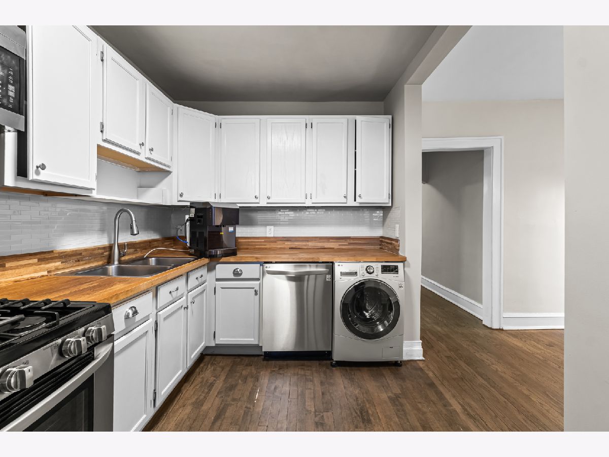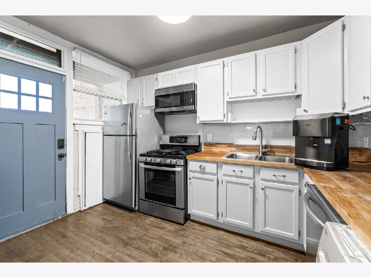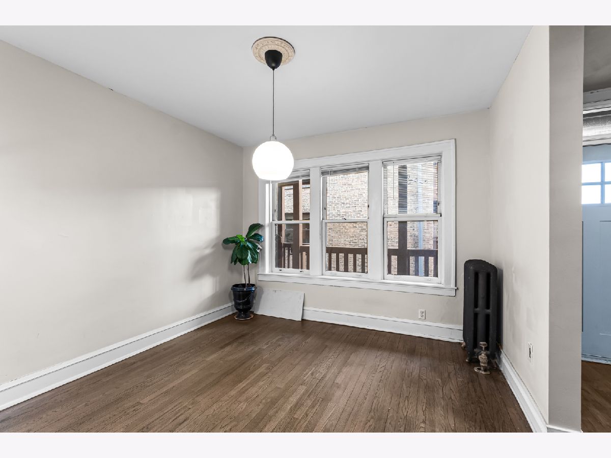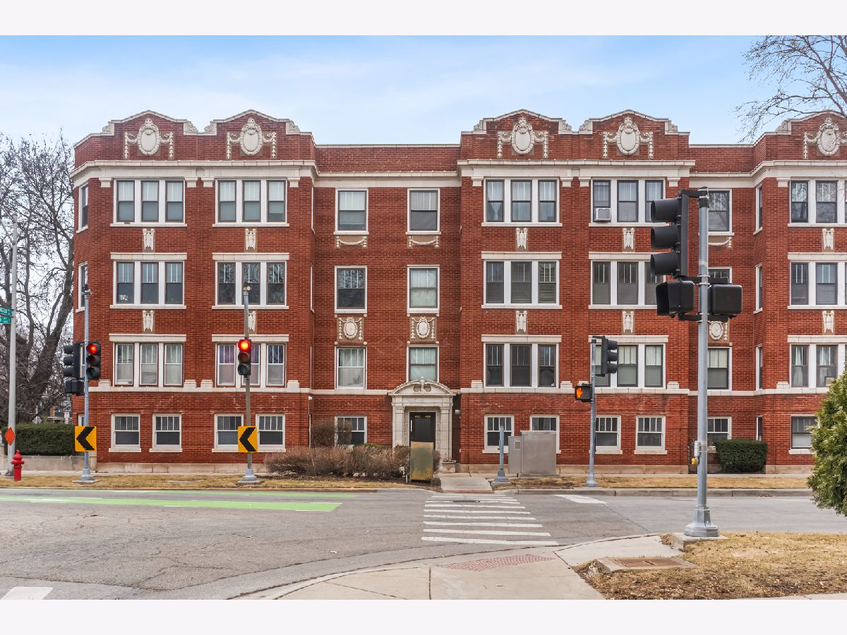 Updated raised first-floor vintage condo featuring a refreshed bathroom, new front windows, and fresh paint throughout. The kitchen offers white cabinetry, stainless steel appliances, butcher block countertops, subway tile backsplash, under-cabinet lighting, and a washer/dryer combo. Spacious living room, dining room, and bedroom with ample closet space. Classic architectural details including arched doorways and natural light from both east and west exposures. Enjoy outdoor space on the rear deck with room for seating or relax on the community patio. Additional features include a large storage unit, coin laundry, and an exercise room in the basement. FHA-approved and professionally managed building with low taxes. Conveniently located near both the Green and Blue Line trains.