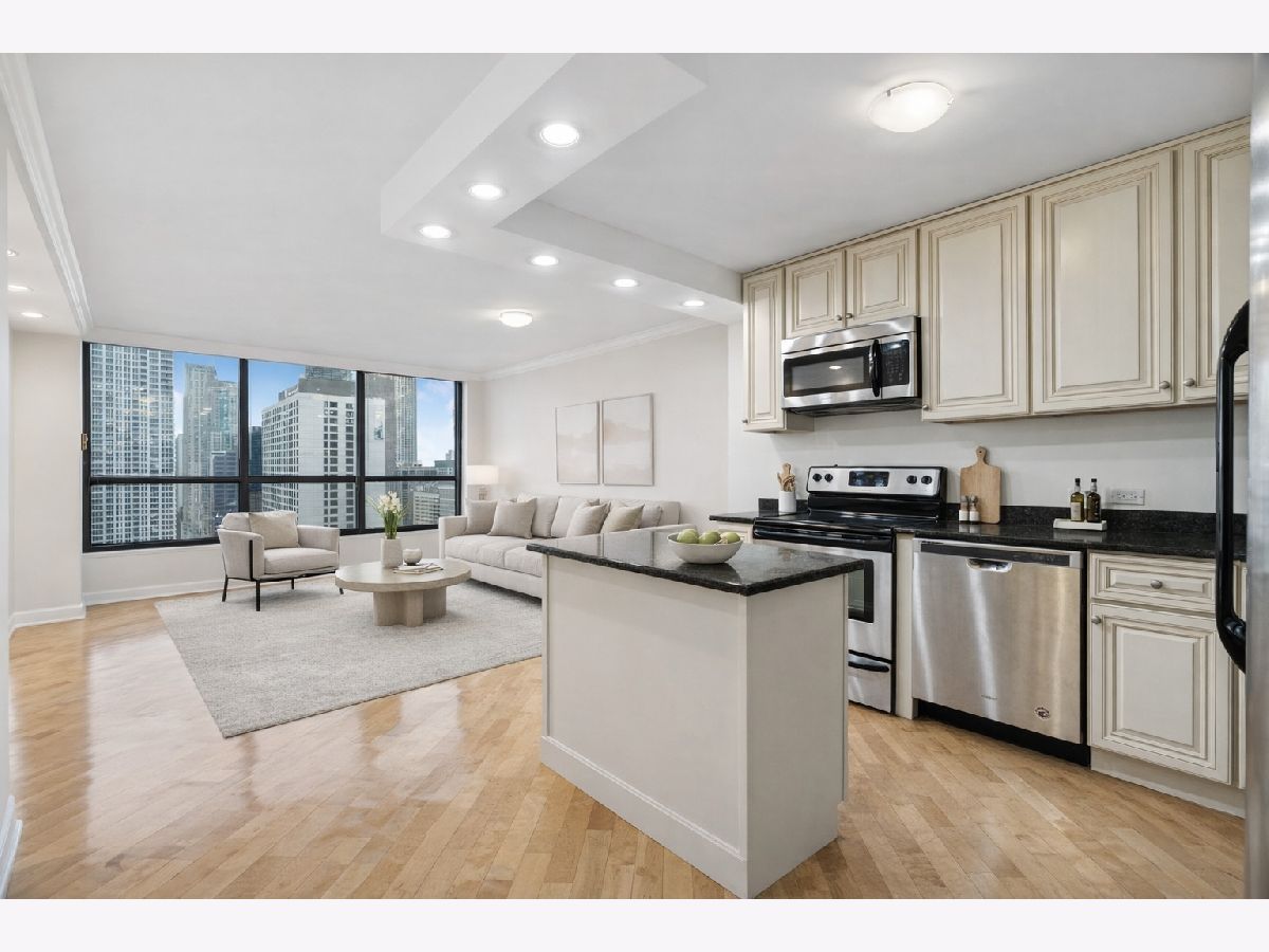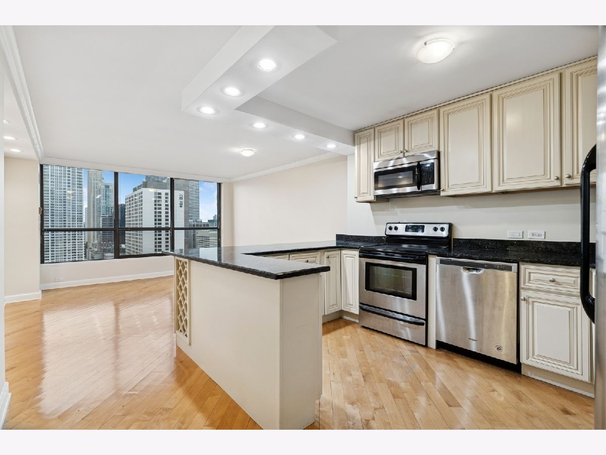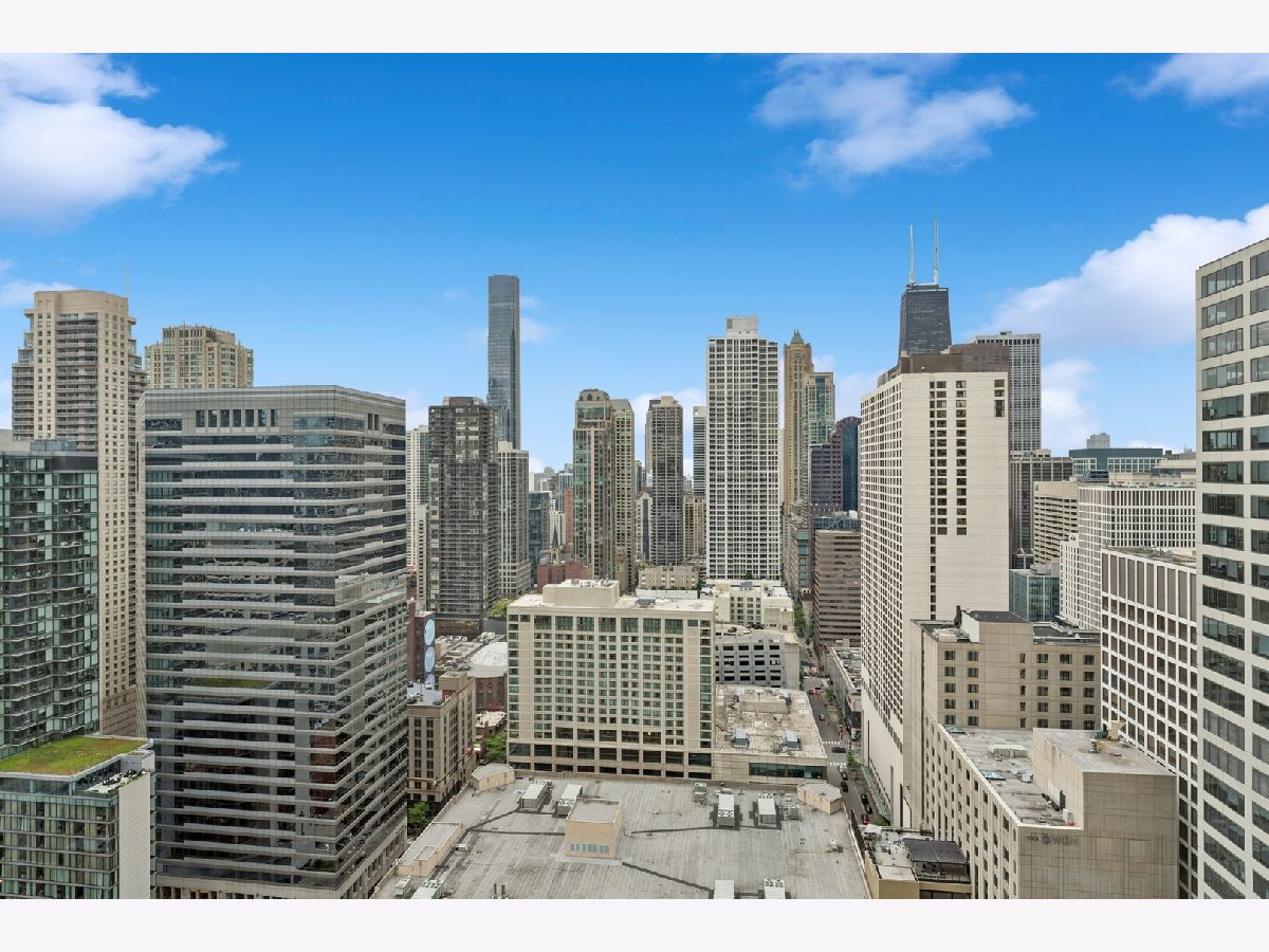 Spectacular high-floor 1-bedroom with a beautifully remodeled kitchen in the full-amenity River Plaza, ideally located along the Chicago River in the heart of River North. Bright and airy with stunning city views, this residence features hardwood flooring throughout and a thoughtfully designed layout. The updated kitchen offers stainless steel appliances, shaker-style cabinetry, granite countertops, breakfast bar, and subway tile backsplash. Spacious living and dining area with excellent natural light. Generous bedroom with ample closet space including a large walk-in entry closet plus additional storage. Well-appointed bath with marble vanity, natural stone tile, and multi-jet shower system. Freshly painted in 2025 and move-in ready. Full-service building with 24-hour door staff, indoor pool, hot tub, sundeck, fitness center, hospitality room, business center, package receiving, valet cleaners, and on-site management. HOA includes heat, A/C, cable, and high-speed internet. Strong reserves at 1,838,000 (2/28/2025) with no planned special assessments. Owner occupancy 64/100. No rental cap. One-year lease minimum. No in-unit laundry permitted. On-site laundry available. Garage parking available for lease or purchase. Prime location steps to the Chicago Riverwalk, Michigan Avenue, dining, shopping, nightlife, and public transportation. Tenant pays 2300 per month, will not be renewing the lease and it is occupied until June 30th.