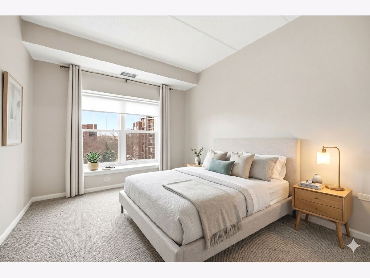 Prime downtown Palatine condo! This 5th-floor corner unit offers 1,583 sq. ft. of well-designed living space with 2 bedrooms, a versatile den/office, and 2 full bathrooms. Soaring 9-foot ceilings and an open living and dining area with hardwood floors create a bright, inviting atmosphere. The upgraded eat-in kitchen features rich mocha cabinetry, granite countertops, hardwood flooring, and a pantry closet. The den/office includes custom built-in bookshelves and a desk-perfect for working from home. The spacious primary suite offers neutral carpeting, a walk-in closet with custom organizers, and a private bath with ceramic tile flooring, double vanity, separate shower, and soaking tub. The second bedroom is conveniently located near the hall bath and linen closet. Enjoy beautiful courtyard views from the private balcony. Additional highlights include in-unit washer and dryer, furnace and AC (2022), refrigerator (2022), bedroom windows, window treatments, and carpet (2022). Heated garage space #45 includes a private 12' x 6' storage unit. Just minutes from the Metra train, shops, restaurants, and all the Village of Palatine has to offer-including parks, Palatine library, Community Center pool, Hometown Fest, and close to route 53/90 expressway. Live at the heart of it all in Downtown Palatine!