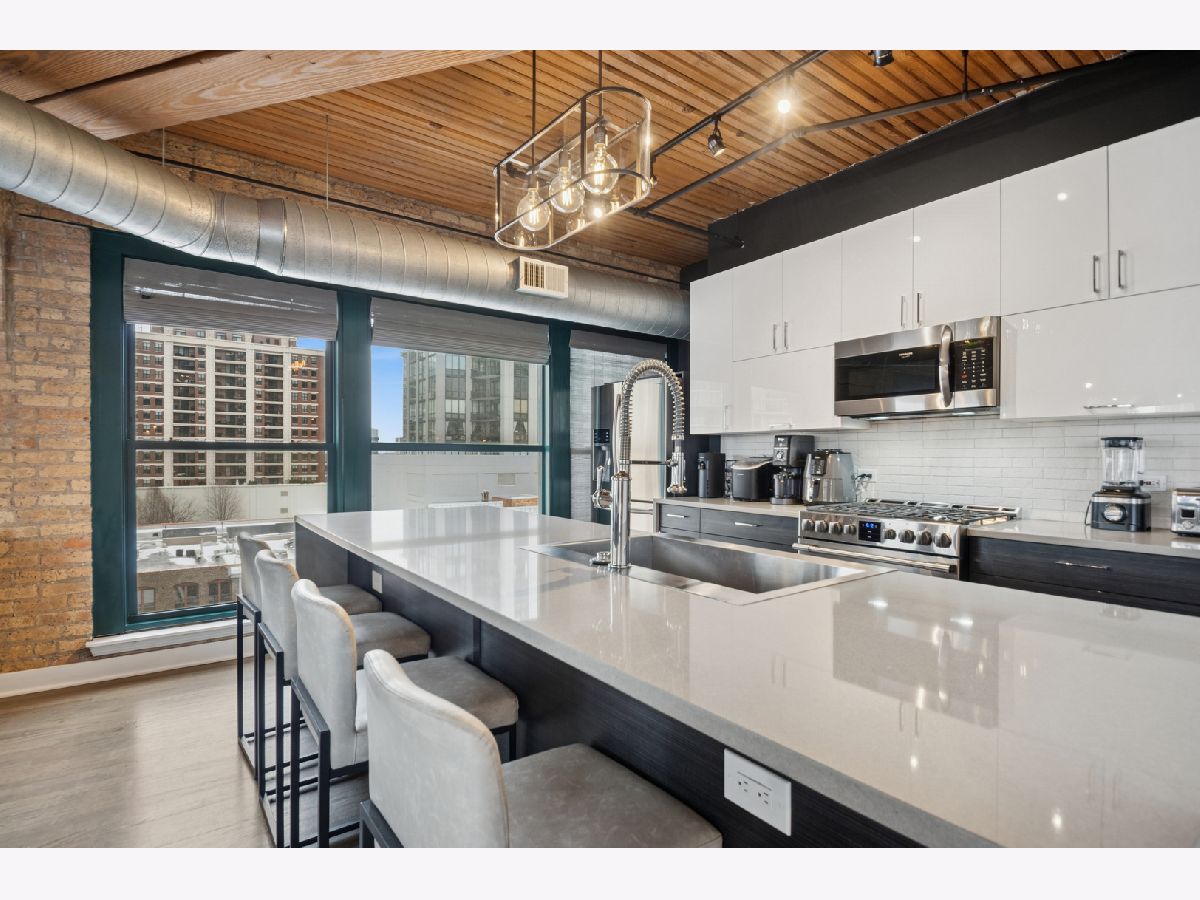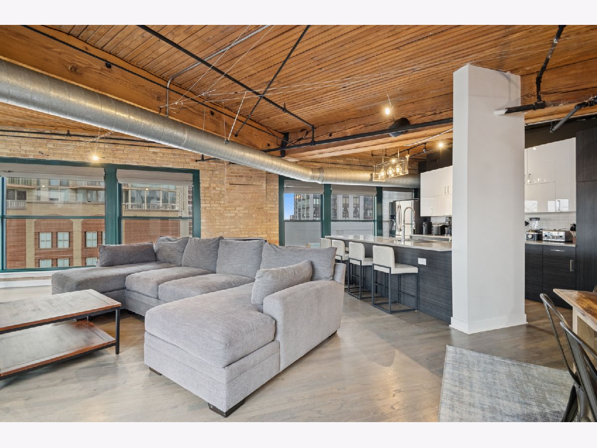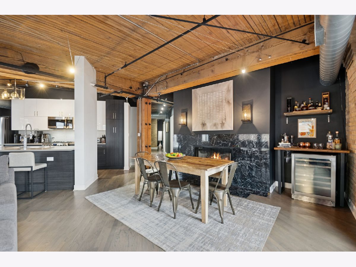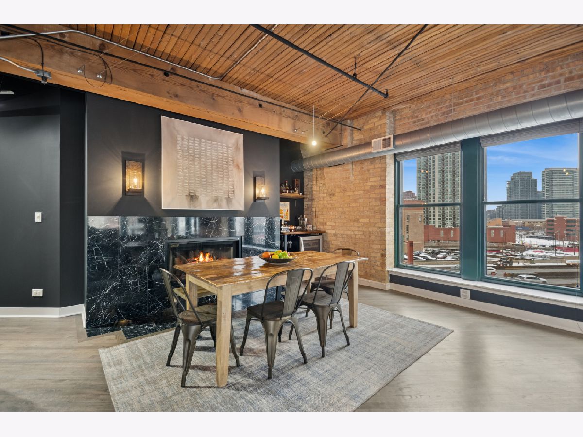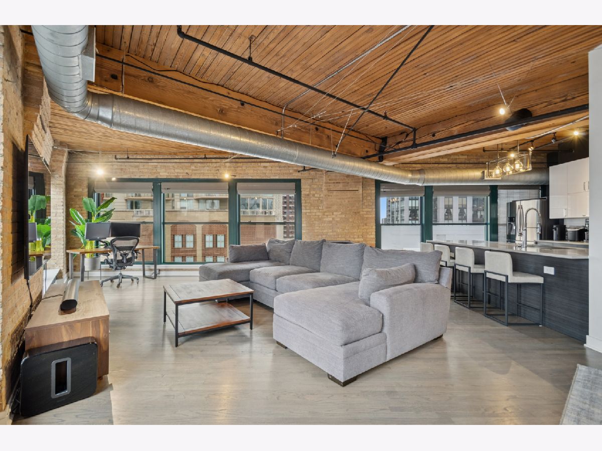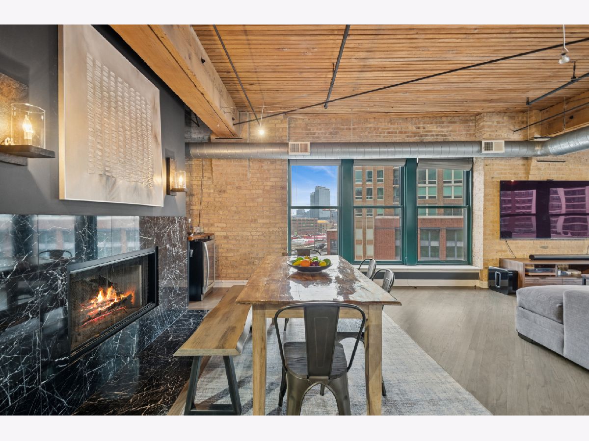 Experience authentic loft living in one of River North's most iconic buildings. This exceptional residence offers a truly stunning and architecturally striking living experience. The expansive open living and dining space fills with natural light from dramatic wall to wall oversized windows , complemented by 10 ft soaring timber ceilings and pillars, exposed brick and a classic wood-burning fireplace with marble surround and finishing, with the room coming to a unique point with dazzling city views in all directions! The beautifully remodeled kitchen features stainless steel appliances and oversized stainless sink, gleaming quartz countertops and a 14 ft breakfast bar, also stunning custom cabinets featuring white gloss uppers and distinctive fluted grey woodgrain lowers. Modern gray stained oak select hardwood floors flow throughout the living space creating a cohesive feel throughout. The thoughtfully designed layout includes two spacious and remodeled baths. The impressive primary suite features electric blinds, a perfectly designed walk-through closet and a luxurious spa-inspired bath with double vanity and oversized walk-in shower. Lastly, a versatile large welcoming foyer- currently styled as a reading nook provides a flexible bonus space and an inviting sense throughout. In unit laundry, abundant storage and closet space also includes indoor heated parking space (no additional tax or assessment on the space) and storage locker. Building amenities include 24-hour door person. on site manager, 7 day a week building maintenance, amazing rooftop deck with 3 BBQ'S for your use, outdoor furniture and professional landscaping in the summer enhanced by spectacular city views, with a very well -equipped gym and separate yoga room, bicycle storage. Pets welcome!