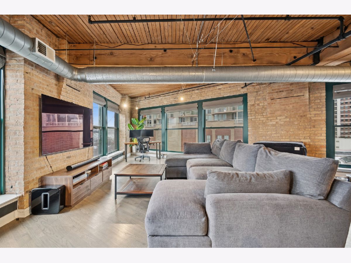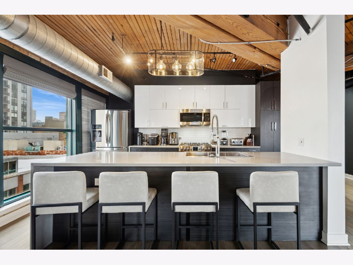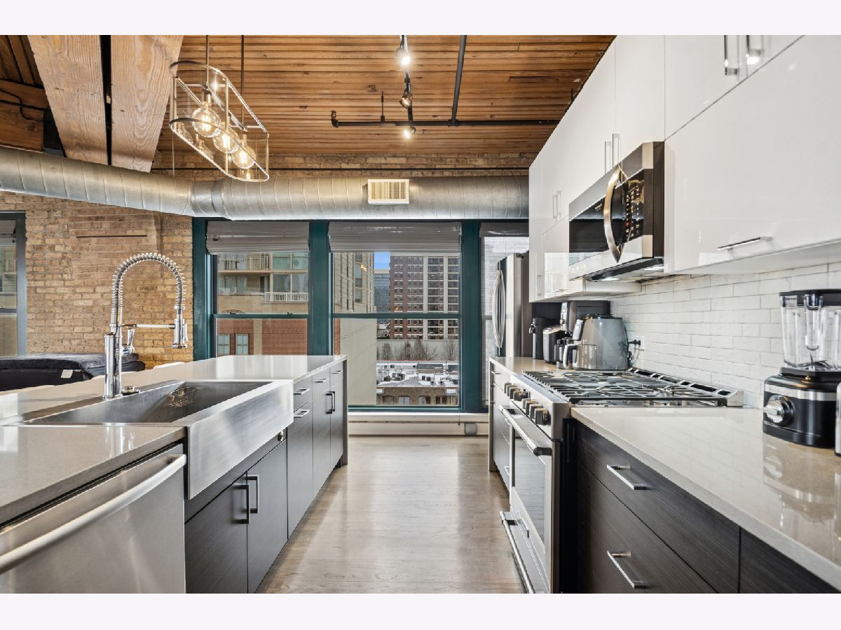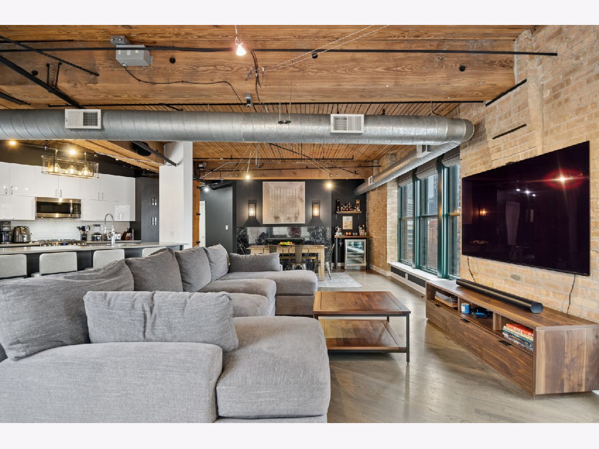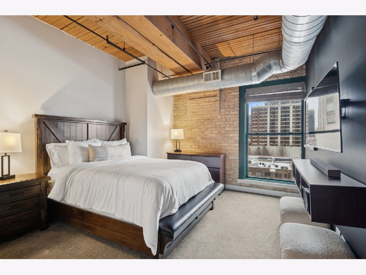 Experience authentic loft living in one of River North's most iconic buildings. This exceptional residence offers a truly stunning and architecturally striking living experience. The expansive open living and dining space fills with natural light from dramatic wall to wall oversized windows , complemented by 10 ft soaring timber ceilings and pillars, exposed brick and a classic wood-burning fireplace with marble surround and finishing, with the room coming to a unique point with dazzling city views in all directions! The beautifully remodeled kitchen features stainless steel appliances and oversized stainless sink, gleaming quartz countertops and a 14 ft breakfast bar, also stunning custom cabinets featuring white gloss uppers and distinctive fluted grey woodgrain lowers. Modern gray stained oak select hardwood floors flow throughout the living space creating a cohesive feel throughout. The thoughtfully designed layout includes two spacious and remodeled baths. The impressive primary suite features electric blinds, a perfectly designed walk-through closet and a luxurious spa-inspired bath with double vanity and oversized walk-in shower. Lastly, a versatile large welcoming foyer- currently styled as a reading nook provides a flexible bonus space and an inviting sense throughout. In unit laundry, abundant storage and closet space also includes indoor heated parking space (no additional tax or assessment on the space) and storage locker. Building amenities include 24-hour door person. on site manager, 7 day a week building maintenance, amazing rooftop deck with 3 BBQ'S for your use, outdoor furniture and professional landscaping in the summer enhanced by spectacular city views, with a very well -equipped gym and separate yoga room, bicycle storage. Pets welcome!