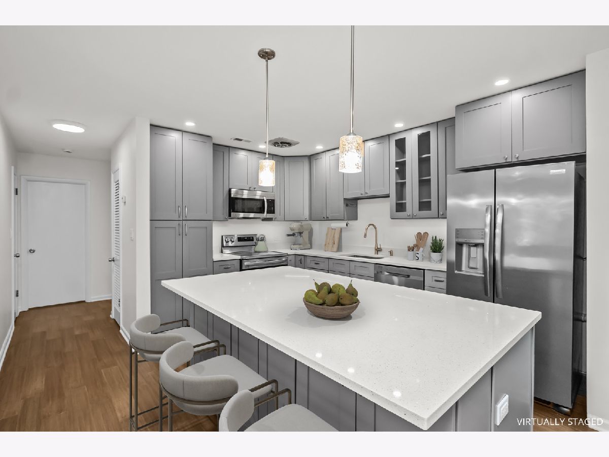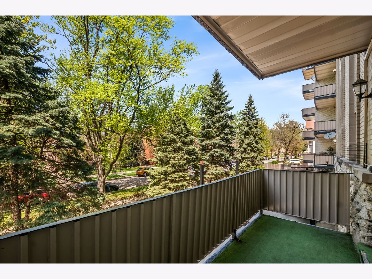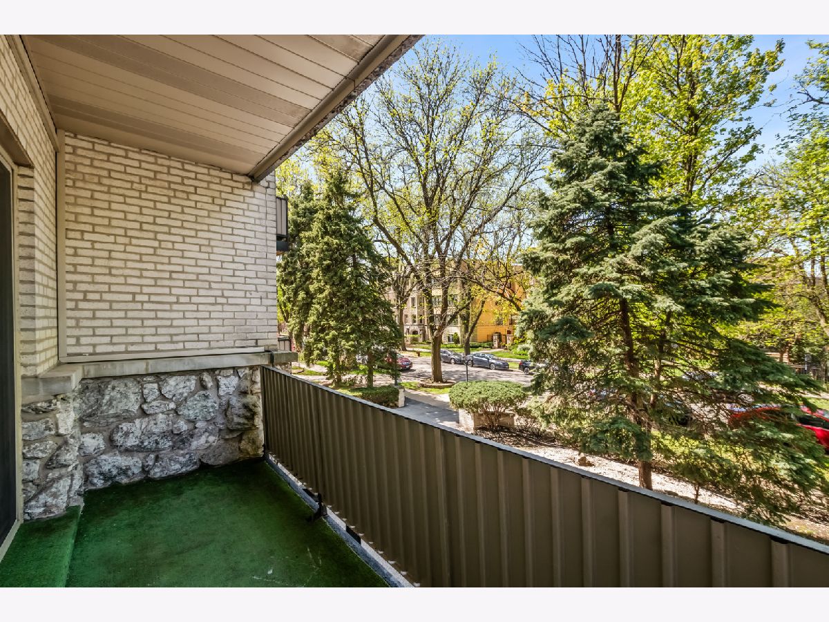 Amazing west facing unit with a peaceful view of the treelined street! Excellent updates have been completed and the entire unit has been freshly painted. The renovated kitchen is complete with quartz counters, stainless steel appliances and an enormous island with storage on both sides! Wood laminate flooring throughout the unit and recessed lighting too. The open living space leads to the balcony to enjoy the summer on! The primary bedroom has 2 closets plus a private half bath. Well thought out and plentiful closet space plus a storage locker on the 1st floor of the building. One garage space is included! Phenomenal location only blocks to the EL, bus stop, expressway and all the conveniences of Old Irving Park.