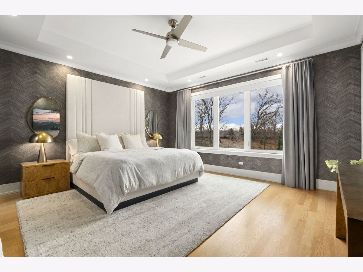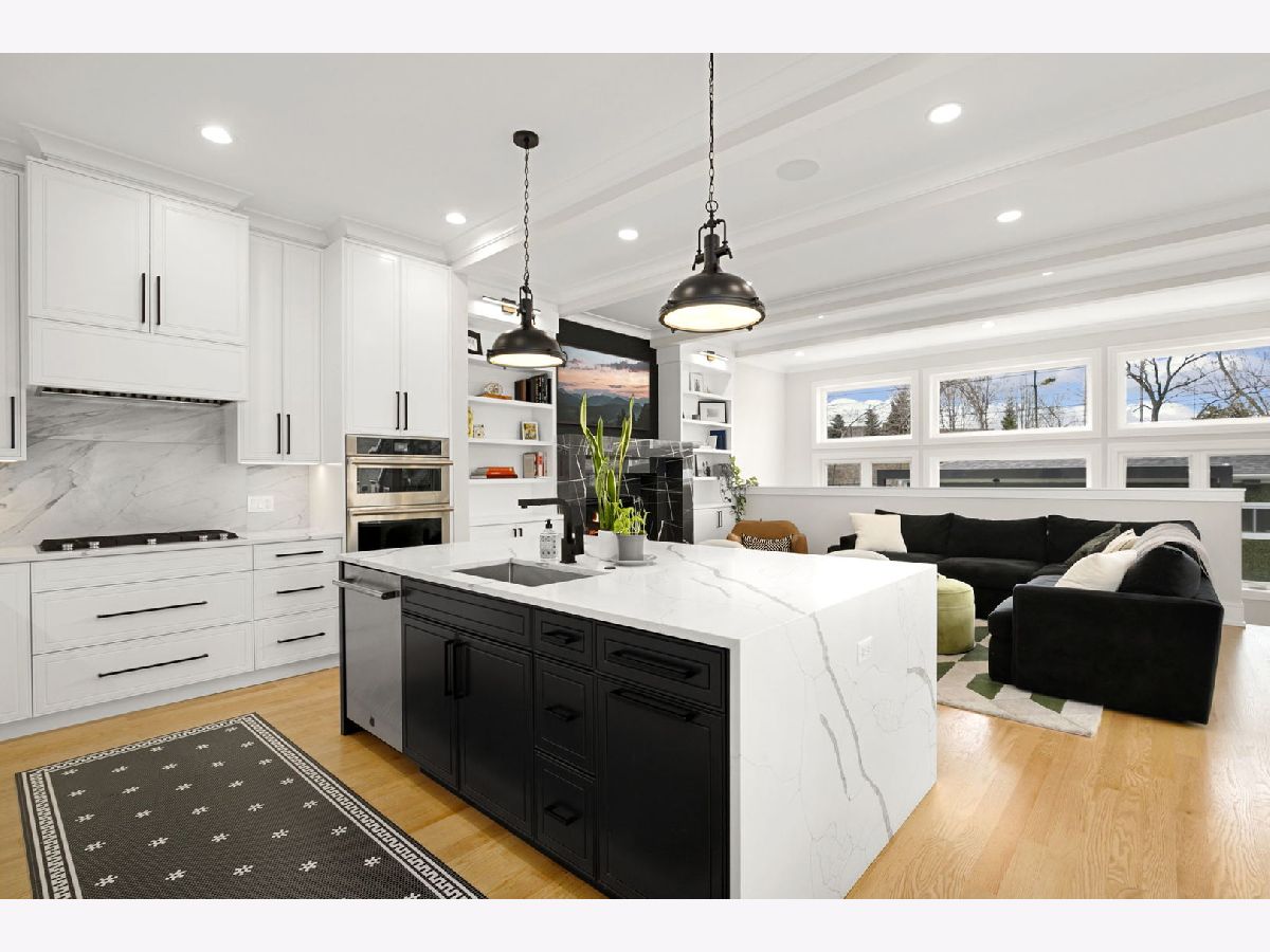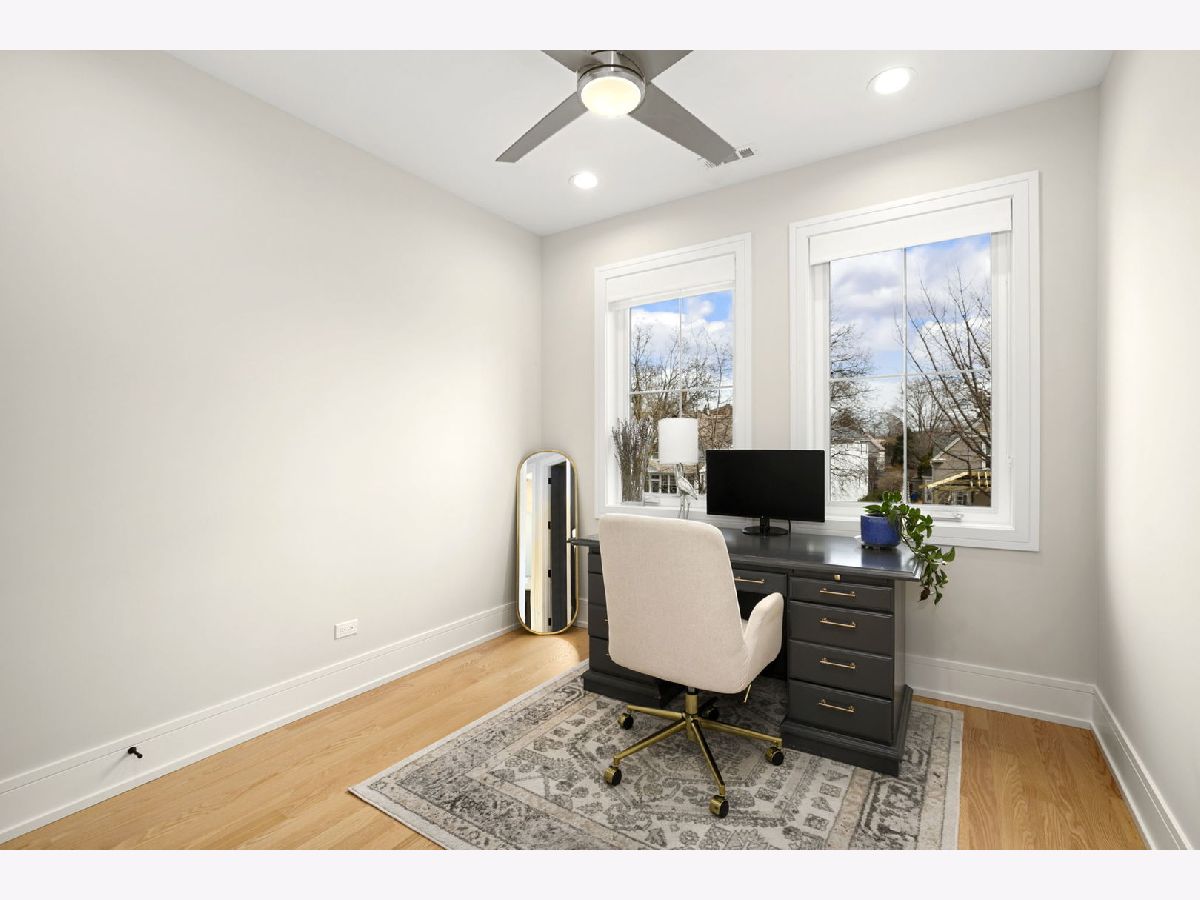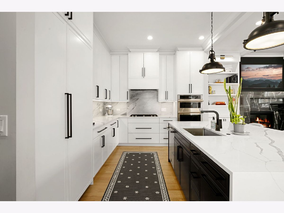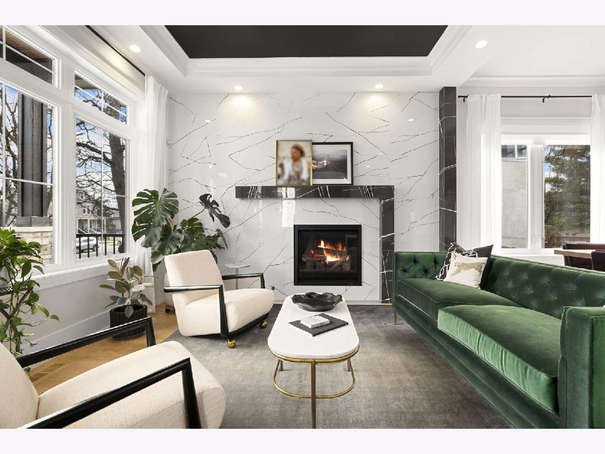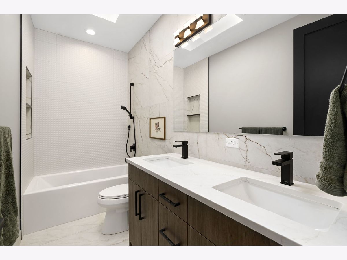 Stunning 2023 newer construction single family home on an oversized 50 x 144 double lot in the heart of Old Irving Park. This extra wide floor plan offers 4 bedrooms and 2 full bathrooms on the upper level, plus a 5th bedroom or office in the finished lower level, delivering a rare amount of space and flexibility for the area. The striking modern farmhouse exterior blends white Hardie siding, wood accents, black board and batten, and stone details, all anchored by a welcoming covered front porch. Inside, a bright and open layout features a combined living and dining space with custom built-ins and a gas fireplace, flowing seamlessly into a chef's kitchen designed for both everyday living and entertaining. Highlights include custom cabinetry, JennAir appliances, a large island with seating, walk-in pantry, and space for a breakfast table. The adjoining sun-filled family room offers a second fireplace and direct access to the mudroom and backyard. Built-in Sonos speakers are wired and installed throughout the home for seamless sound. Upstairs, the spacious primary suite features dual walk-in closets and a beautifully appointed bath with heated floors, soaking tub, frameless glass shower, and double vanity. Three additional bedrooms, a full bath with dual sinks and heated flooring, and a convenient laundry room complete the level. The finished lower level offers impressive ceiling height and natural light, with a large recreation room, wet bar with beverage fridge, 5th bedroom or office, full bath, second laundry hookup, and heated flooring. What truly sets this home apart is the fully built-out outdoor space, completed in 2025. The oversized, gated yard features a custom heated and lit Pratic Italian retractable pergola, deck and patio, and a full outdoor kitchen with custom cabinetry, Blackstone flattop grill, Komodo Joe smoker, and beverage cooler. A 4-hole putting green with chipping area adds a unique touch you rarely see in the city. A detached three-car garage completes the package. Additional features include custom closets and built-ins throughout, skylights, speaker wiring, home security system, and multiple entertaining spaces with two bar areas. All of this in a prime Old Irving location with easy access to 90/94, the Blue Line, Metra, restaurants, shopping, and top-rated Belding Elementary and Disney II Magnet. Opportunities like this rarely come to market in Old Irving Park.
