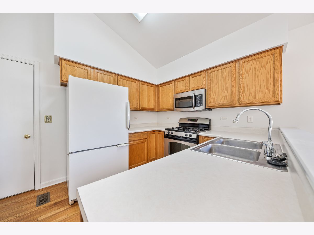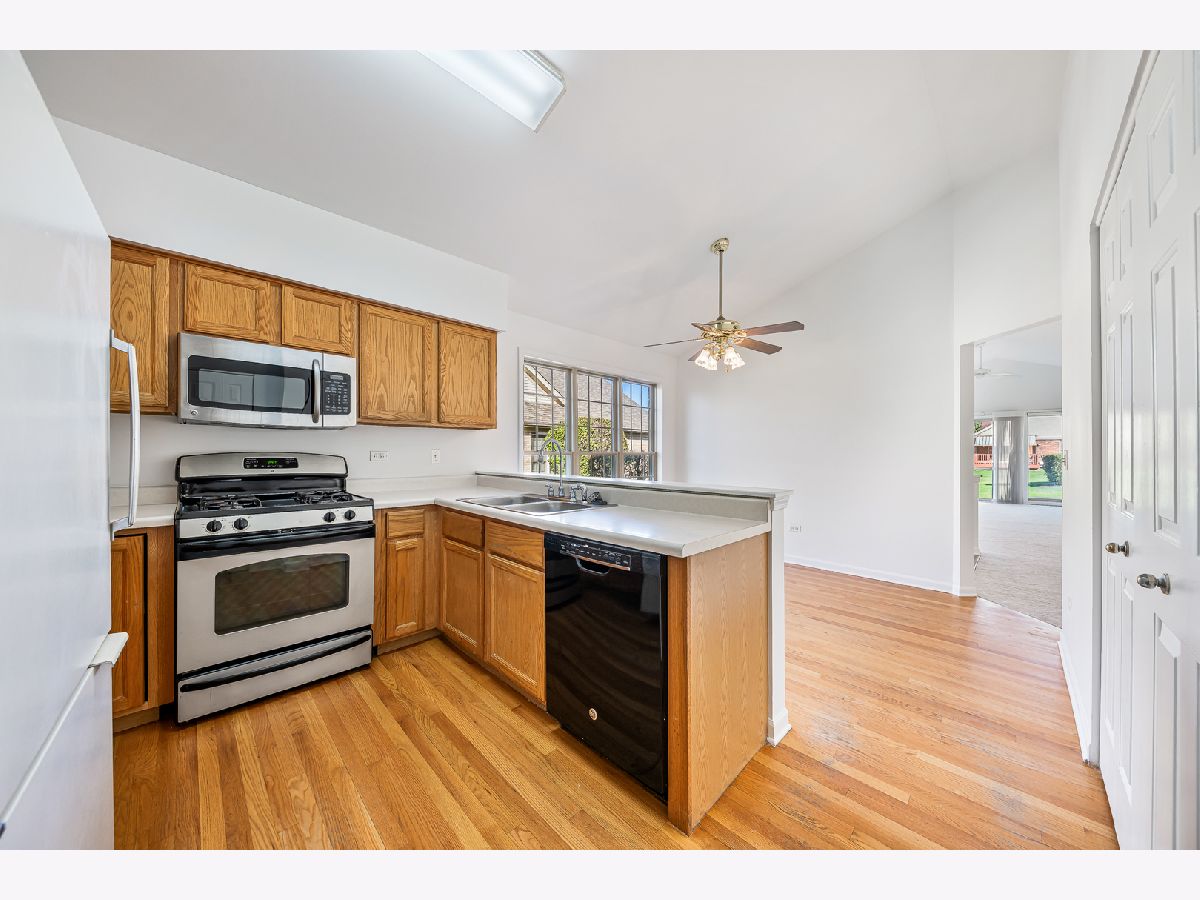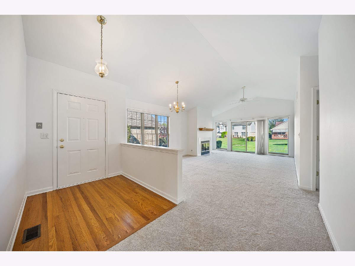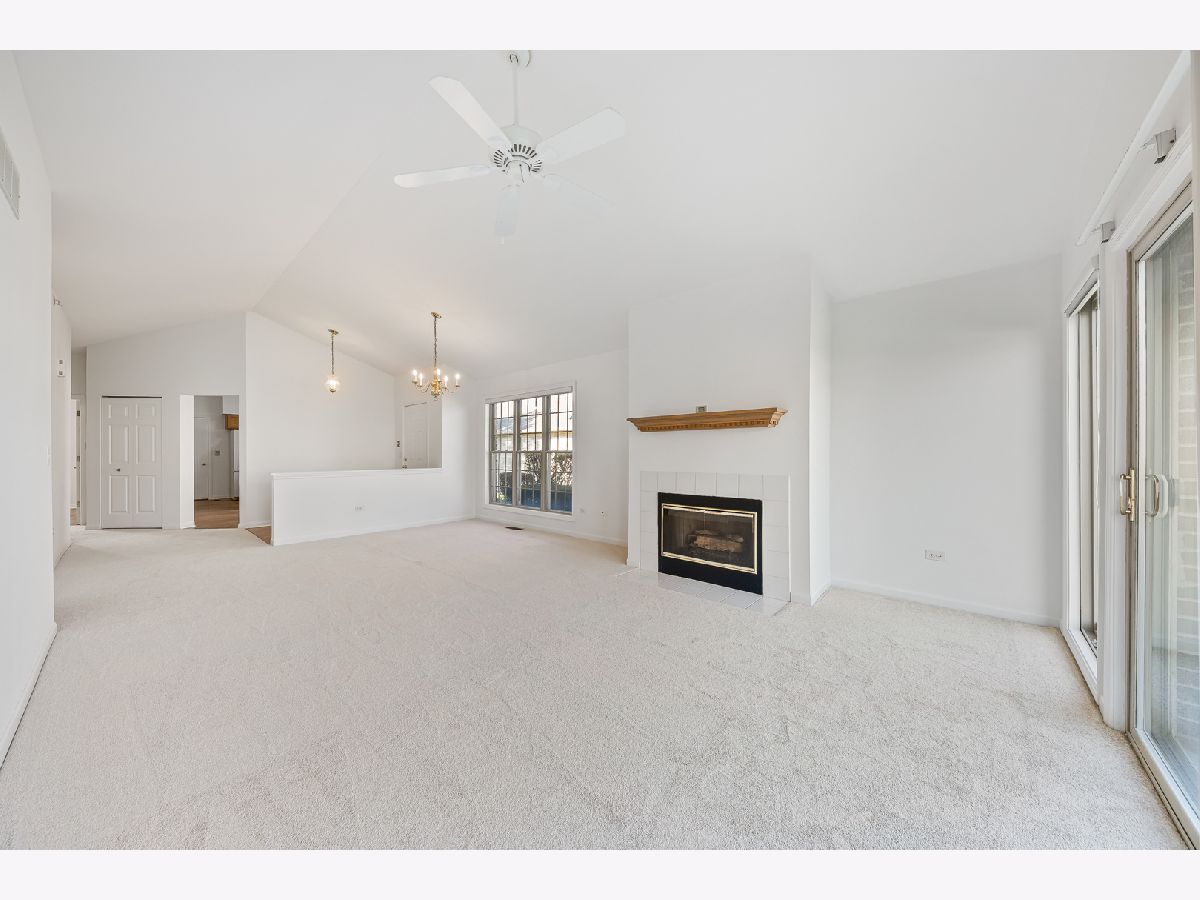 Welcome to this beautiful ranch townhome set in the highly sought-after Odyssey Country Club, a gated community offering a park, playground, and golf course. Enjoy a prime location just minutes from interstate access, the Metra station, and numerous in-town amenities. Step inside to a freshly painted interior that is immaculate and accented by 6-panel doors, crisp white trim, and abundant natural light. The spacious living room features a vaulted ceiling and cozy fireplace, creating a warm and inviting atmosphere. Overlooking this space is a well-appointed kitchen with hardwood floors and a comfortable dinette area. The main level offers two generous bedrooms, including a relaxing primary suite with a walk-in closet and a private bathroom with dual sinks. The finished basement expands your living options with a large family room, recreation area, third bedroom, full bathroom, and plenty of storage space. Complete with professional landscaping and a 2-car garage, this end-unit home perfectly combines easy living, modern updates, and timeless comfort in an exceptional setting.