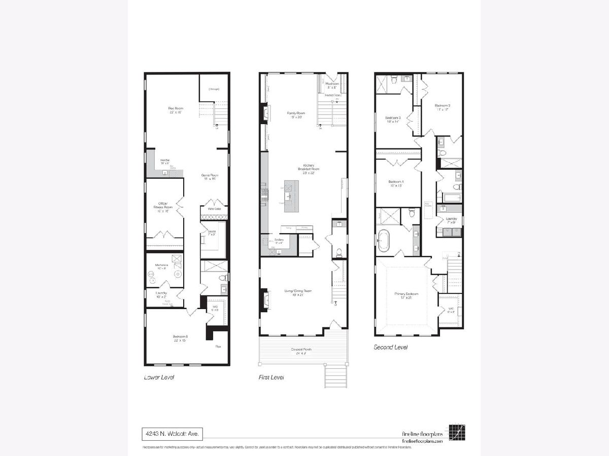 SOLD BEFORE PRINT. Tucked behind a storybook front yard on a tree-lined block, 4243 N Wolcott is a newly constructed home designed by Hubbard Design Group that blends playful warmth with quiet sophistication. Set on an extra-wide and extra-deep 30' x 154' lot, the home sits back from the street, allowing for a generous green lawn and a welcoming 9' front porch. It's the kind of yard that begs for sidewalk chalk, lemonade stands, and slow Sunday mornings-equal parts privacy and presence. Inside, timeless elegance meets modern comfort. White oak floors, custom millwork, and high ceilings lend every room a sense of refined ease. At the front of the home, the formal living and dining room is anchored by a stately fireplace flanked by tall windows, perfect for holiday dinners or cozy evenings in. It's elevated but never showy-a home where quality speaks quietly. Beyond a graceful arched hallway, the heart of the home opens up: a show-stopping kitchen and family room that balances function and form. The double-sided white oak island seats five, inviting everything from pancake breakfasts to science fair prep. Warm cabinetry, integrated appliances, and a hidden scullery with a second dishwasher and sink make entertaining effortless and everyday life beautifully contained. Arched built-ins surround the family room fireplace, and natural light pours in from front to back. Downstairs, the fully radiant-heated lower level is designed for real life. Host movie nights in the rec room, store your favorites in the glass-enclosed wine cellar, or retreat to the sauna after a long day. There's also a guest suite with a full bath, a flex space perfect for a gym or sixth bedroom, and a wet bar for good measure. Upstairs, family living is reimagined. Four bedrooms-three with ensuite baths-provide comfort and autonomy. The primary suite, now thoughtfully located at the front of the home, offers peaceful treetop views and sunlight throughout the day. A spa-inspired bath features heated floors, a soaking tub, walk-in shower, and private water closet, while a spacious walk-in closet keeps everything in order. And then there's the train-yes, it's behind the house. But what could have been a flaw has been reimagined. The home was pushed back on the lot, creating the deep front yard and quiet indoor acoustics that make the occasional rumble feel more like a hum-city energy at a gentle distance. Inside, you'd hardly notice. Outside, you're reminded that convenience lives just steps away. Location-wise, 4243 N Wolcott straddles the line between North Center and Ravenswood, claiming the best of both. You're in the desired Ravenswood Elementary district - a big plus for families seeking excellent public schools. Within blocks, you'll find family essentials and neighborhood charm in every direction. Saturday mornings start at the Northcenter Farmers Market, where live music, pastries, and produce are as much a ritual as a resource. Grab coffee at Spoken or Hexe on your stroll home, or treat the family to breakfast in the garden courtyard at Cafe Selmarie. When dinner rolls around, options abound: sizzling Korean BBQ at Cho Sun Ok, wood-fired pies from Spacca Napoli, or a burger at The Bad Apple. Family-friendly breweries like Begyle, Half Acre, and Dovetail offer relaxed patios, food trucks, and community vibes where strollers and pints are equally welcome. And with beloved local events like Ribfest, Harvest Jam, and movie nights in Welles Park, the calendar fills itself. This is more than just a home-it's a backdrop for a life with rhythm, intention, and joy. In a city that often asks for compromise, 4243 N Wolcott gives you space, style, and neighborhood spirit-without asking you to give anything up. WalkScore 91 | TransitScore 70 | BikeScore 76 | 28-minute Lyft, 33-minute L ride, or a 41-minute cycle to The Loop | 4 Divvy stations within 0.2 mi or less | 0.2 mi to the Montrose Brown Line station | The 50/78/80 bus lines are within 0.5 mi or closer.
