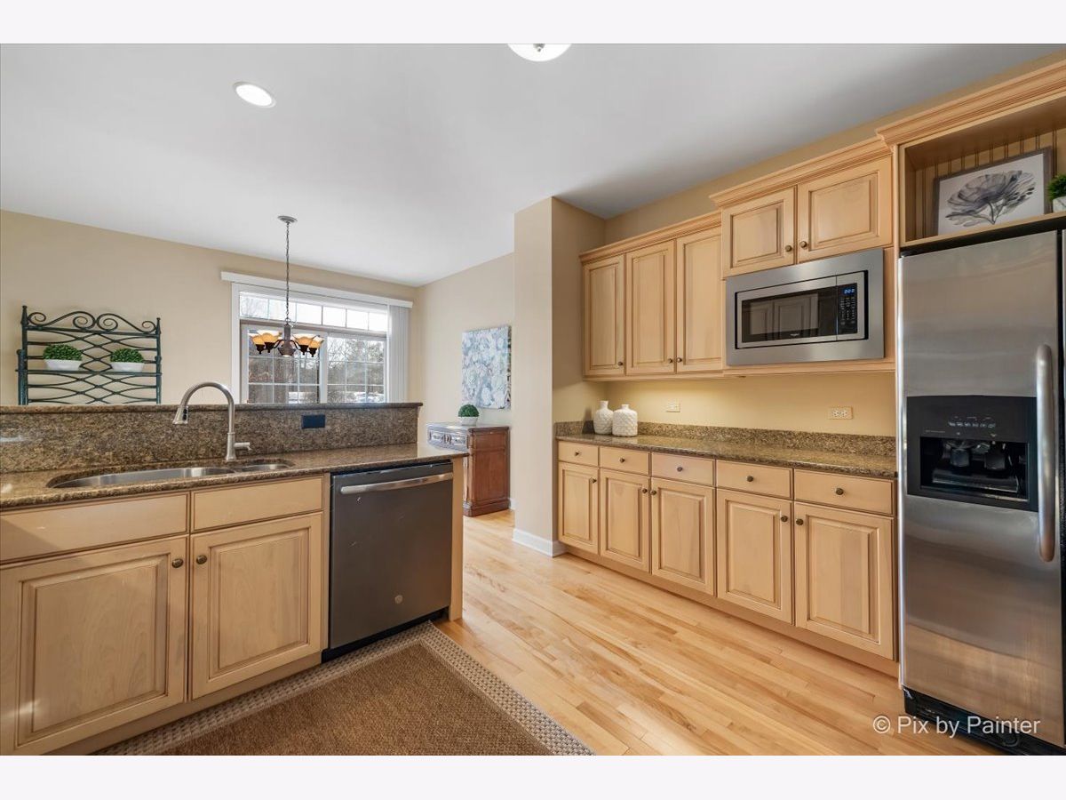 RARE end-unit luxury townhome in the desirable Royal Fox Subdivision with 3 bedrooms, 2.1 baths, loft, 9ft ceilings throughout, deep pour basement and attached 2-car garage. A private entrance and a beautiful wrap around porch welcomes you. Step inside to a 2-story foyer and adjacent dining area and family room with many big windows for a flood of natural light and brick fireplace. Well-appointed kitchen with ample 42" cabinets and granite counters, stainless steel appliances and eat-in area with glass sliders that lead to the patio. Spacious first floor master suite with volume ceiling, walk-in closet and ensuite bath with double sinks, jetted tub and separate shower. A powder room and laundry room with cabinets and sink complete the main level. Upstairs are 2 more sizable bedrooms, full hall bath with expansive vanity and shower over tub combo and a roomy loft that could easily be converted into a 4th bedroom! Enjoy the great outdoors on one of TWO brick paver patios, in the shared greenspace or at the nearby Royal Fox Country Club. Value added features: (2024) Water heater, sump pump, garbage disposal; (2022) Oven hood, hardwood floors refinished; (2021) Siding, microwave, some interior painting, first floor carpet, master bath shower, ceiling fans, blinds and speakers, dining room and master bedroom draperies; (2020) Roof, oven; (2018) Dishwasher, exterior painted, front door plantation shutters, blinds in kitchen area; (2017) Cabinets and sink in laundry room; (2016) Washer.