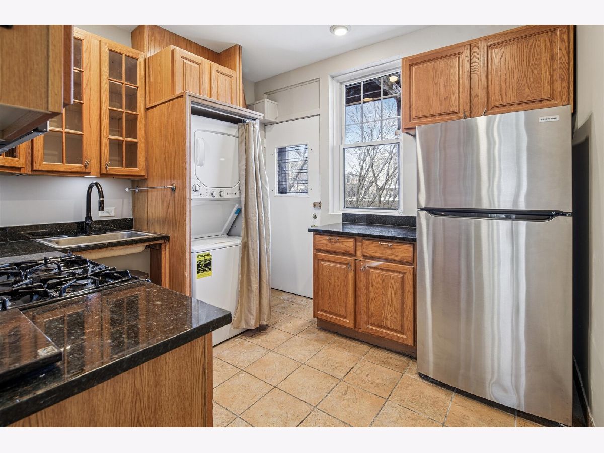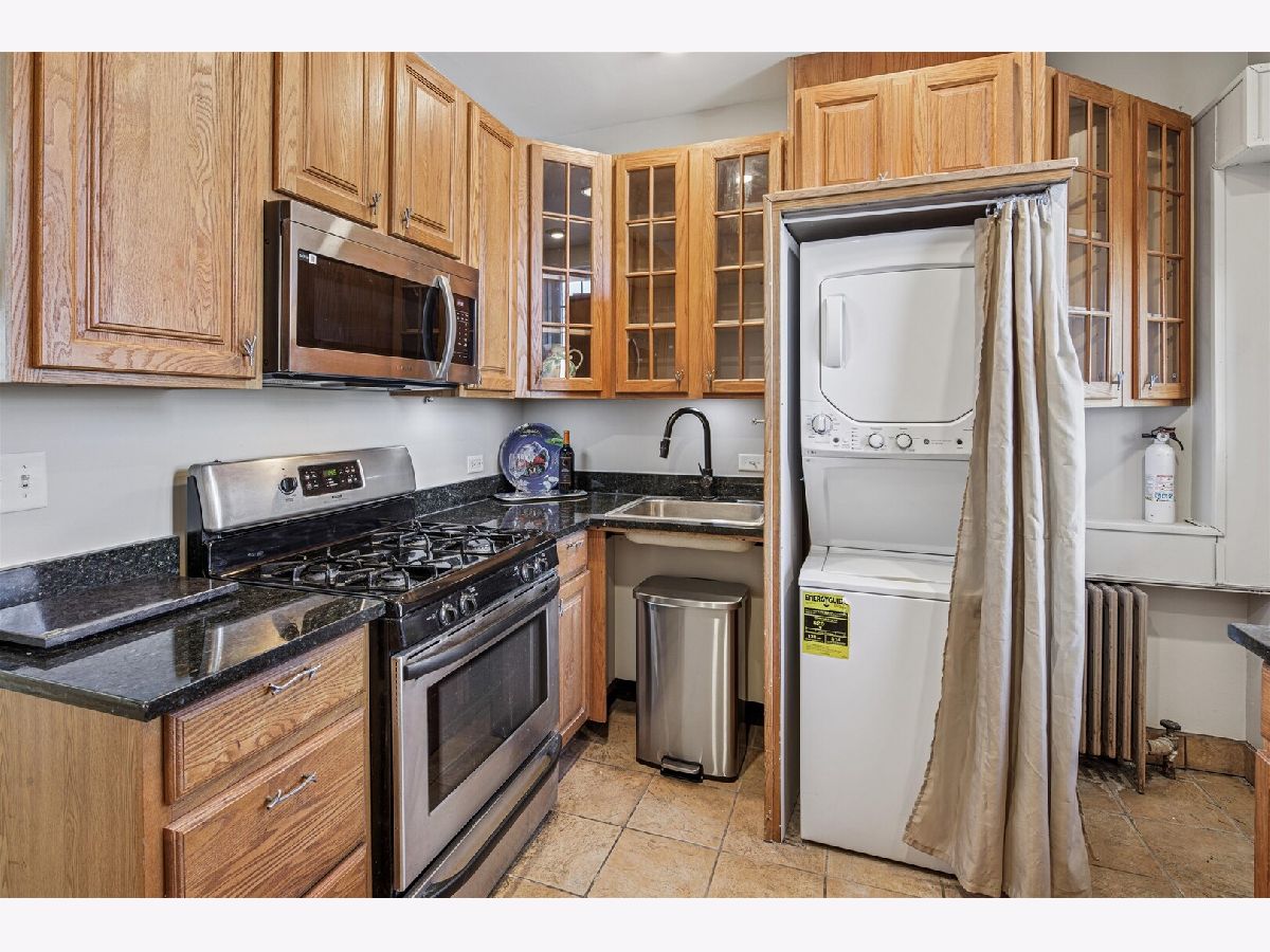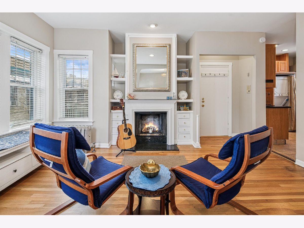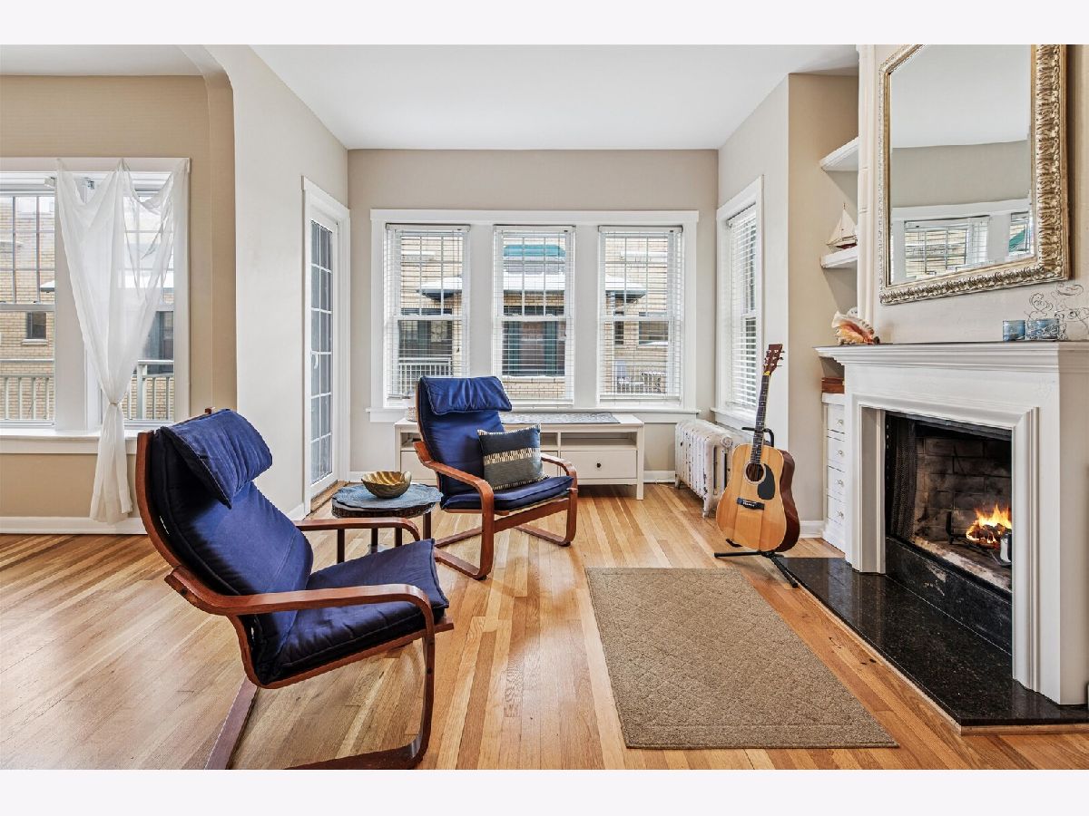 Charming, vintage, top floor one-bedroom condominium available in an historic courtyard building in the popular Buena Park neighborhood. This south-facing unit is filled with natural sunlight and overlooks a leafy, well-maintained courtyard. Newly painted and just-refinished oak hardwood floors throughout. The living room has beautiful built-ins around a cozy wood-burning fireplace. A formal dining area is adjacent to the living room. A small balcony that overlooks the courtyard is just off the living/dining area. The kitchen has granite countertops and brand-new stainless microwave, refrigerator. Brand new washer-dryer. There is a back porch area just off the kitchen. The bedroom has a barrel-vaulted ceiling and large triple window, and can easily accommodate any sized bed. This building is pet-friendly, and features additional shared storage, a bike room, and large laundry room. Great Buena Park location close to transportation (buses and the Red Line), shopping (Target, Aldi, Jewel), dining and coffee shops. The Lakefront and Montrose Harbor, golf course, tennis courts all nearby. Assessment includes heat and cooking gas. Property sold As-Is.