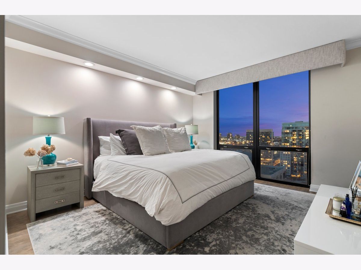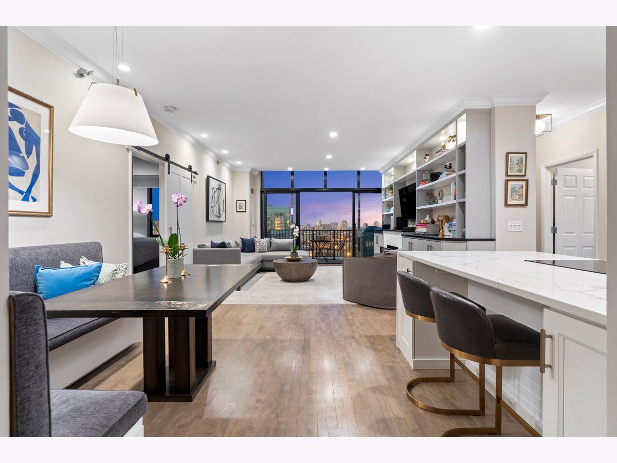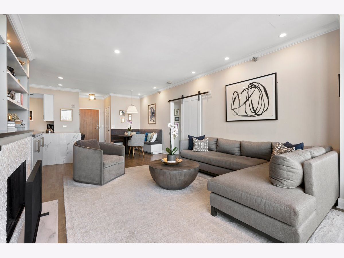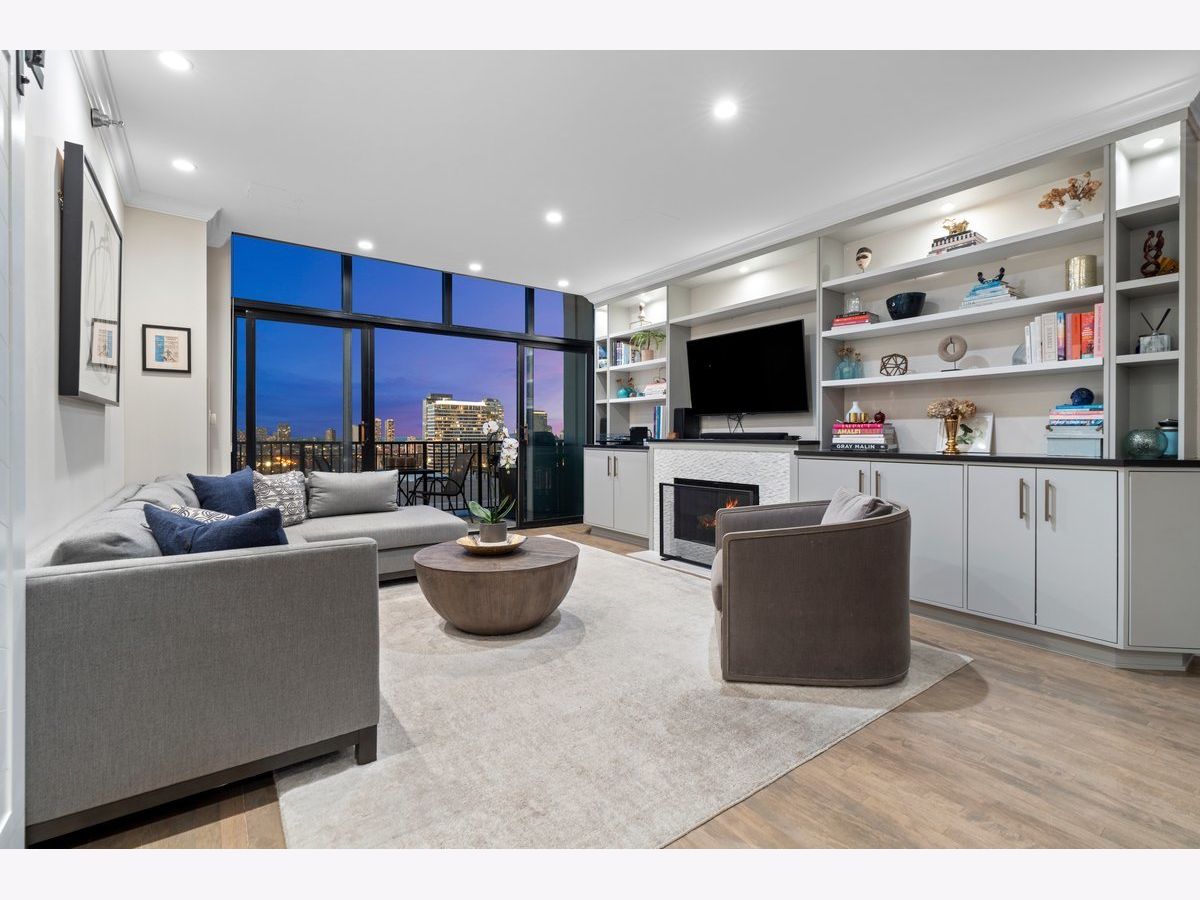 Elevated living awaits in this stunning, fully renovated 2-bedroom, 2-bath residence showcasing breathtaking, wide-open lake and city views from your private balcony. Thoughtfully redesigned with numerous high-end upgrades, this condo seamlessly blends modern luxury with timeless sophistication. The expansive living space is anchored by a custom built-in wall unit with integrated TV cabinet, shelving, and storage, complemented by hardwood floors throughout, crown molding, a gas fireplace with updated hearth, and designer lighting. A stylish built-in dining banquette creates the perfect space for everyday living and entertaining, while a sliding barn door with upgraded track and hardware adds architectural interest. The beautifully reimagined kitchen is outfitted with polished quartz slab countertops and backsplash, new cabinetry and hardware, and a premium appliance package including a Bosch induction cooktop, stainless steel single wall oven, stainless steel speed oven, dishwasher, microwave, and a sleek sink with touch faucet-designed for both functionality and style. The spacious primary suite features a massive walk-in closet plus an additional cedar walk-in closet, offering exceptional storage. The spa-inspired primary bath boasts new cabinetry, quartz vanity countertop, updated flooring, designer mirror, wall sconces, and refined finishes throughout. The guest bath has also been completely updated with new cabinetry, quartz vanity, flooring, tile shower surround, modern lighting, and mirror. Additional upgrades include a new GE 27" stacked washer and dryer, new window treatments, stained wood floors, and thoughtfully selected hardware throughout. Located in a premier full-amenity, pet friendly building featuring 24-hour door staff, an incredible rooftop deck with panoramic 360-degree city views, fitness center, and party room-this exceptional home offers luxury living at its finest. One garage parking spot is included in the price, with one additional parking spot available to purchase for $35K. Rarely available and truly move-in ready-this one won't last long!