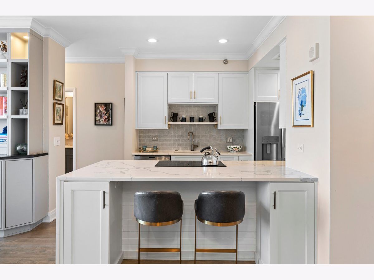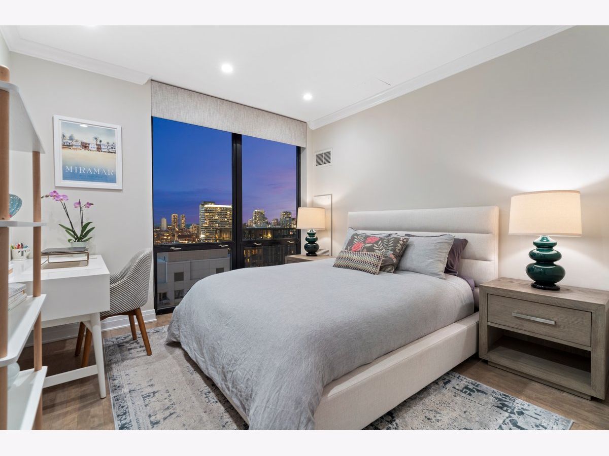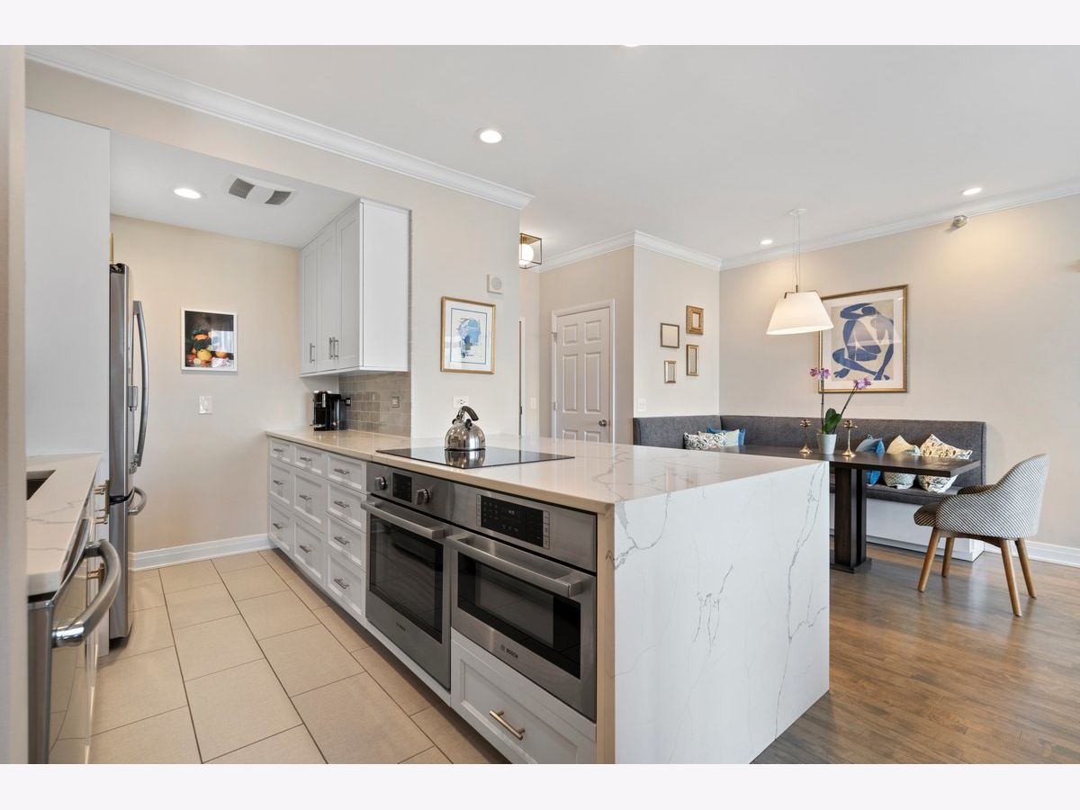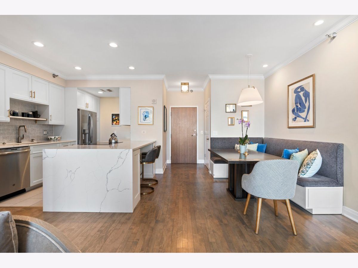 Elevated living awaits in this stunning, fully renovated 2-bedroom, 2-bath residence showcasing breathtaking, wide-open lake and city views from your private balcony. Thoughtfully redesigned with numerous high-end upgrades, this condo seamlessly blends modern luxury with timeless sophistication. The expansive living space is anchored by a custom built-in wall unit with integrated TV cabinet, shelving, and storage, complemented by hardwood floors throughout, crown molding, a gas fireplace with updated hearth, and designer lighting. A stylish built-in dining banquette creates the perfect space for everyday living and entertaining, while a sliding barn door with upgraded track and hardware adds architectural interest. The beautifully reimagined kitchen is outfitted with polished quartz slab countertops and backsplash, new cabinetry and hardware, and a premium appliance package including a Bosch induction cooktop, stainless steel single wall oven, stainless steel speed oven, dishwasher, microwave, and a sleek sink with touch faucet-designed for both functionality and style. The spacious primary suite features a massive walk-in closet plus an additional cedar walk-in closet, offering exceptional storage. The spa-inspired primary bath boasts new cabinetry, quartz vanity countertop, updated flooring, designer mirror, wall sconces, and refined finishes throughout. The guest bath has also been completely updated with new cabinetry, quartz vanity, flooring, tile shower surround, modern lighting, and mirror. Additional upgrades include a new GE 27" stacked washer and dryer, new window treatments, stained wood floors, and thoughtfully selected hardware throughout. Located in a premier full-amenity, pet friendly building featuring 24-hour door staff, an incredible rooftop deck with panoramic 360-degree city views, fitness center, and party room-this exceptional home offers luxury living at its finest. One garage parking spot is included in the price, with one additional parking spot available to purchase for $35K. Rarely available and truly move-in ready-this one won't last long!