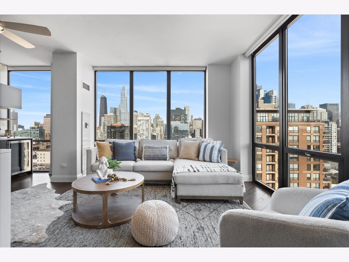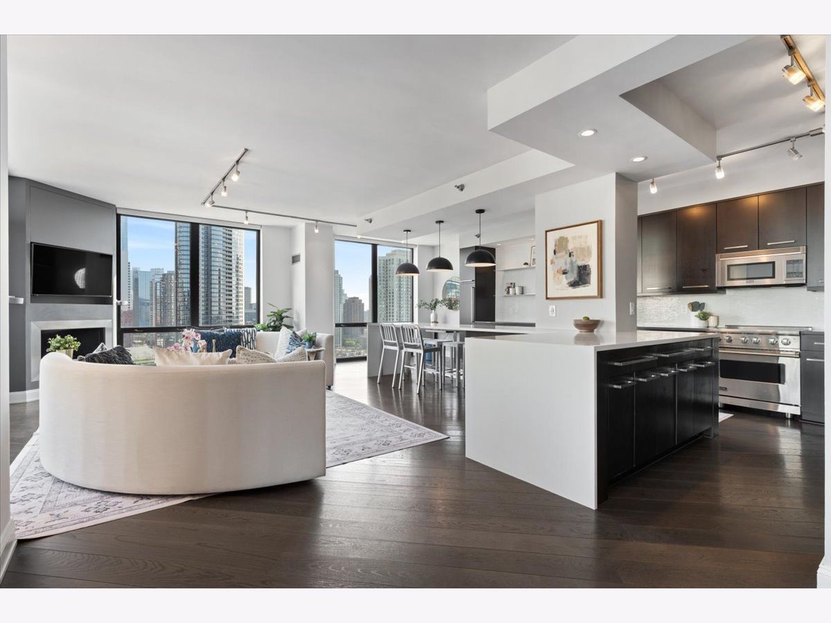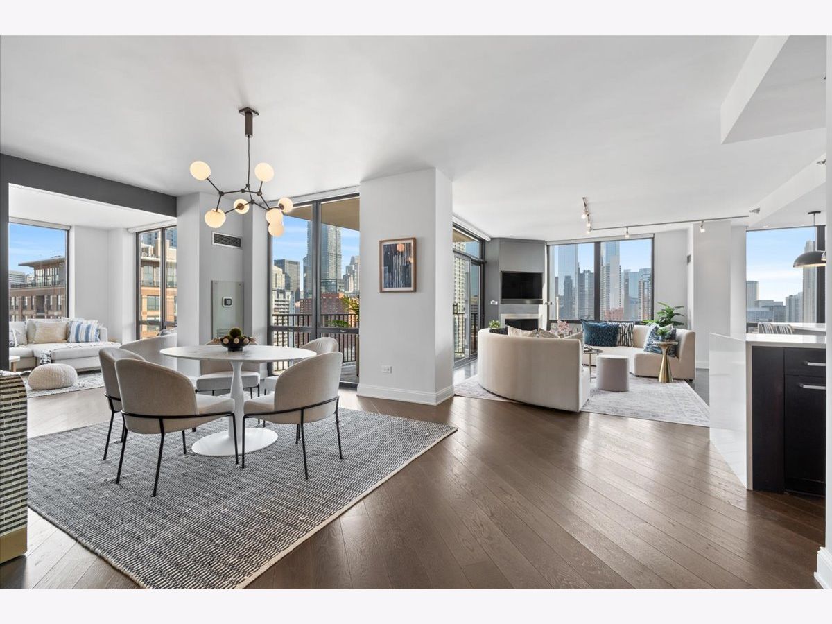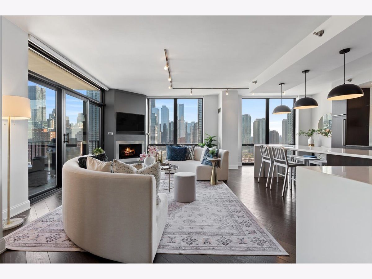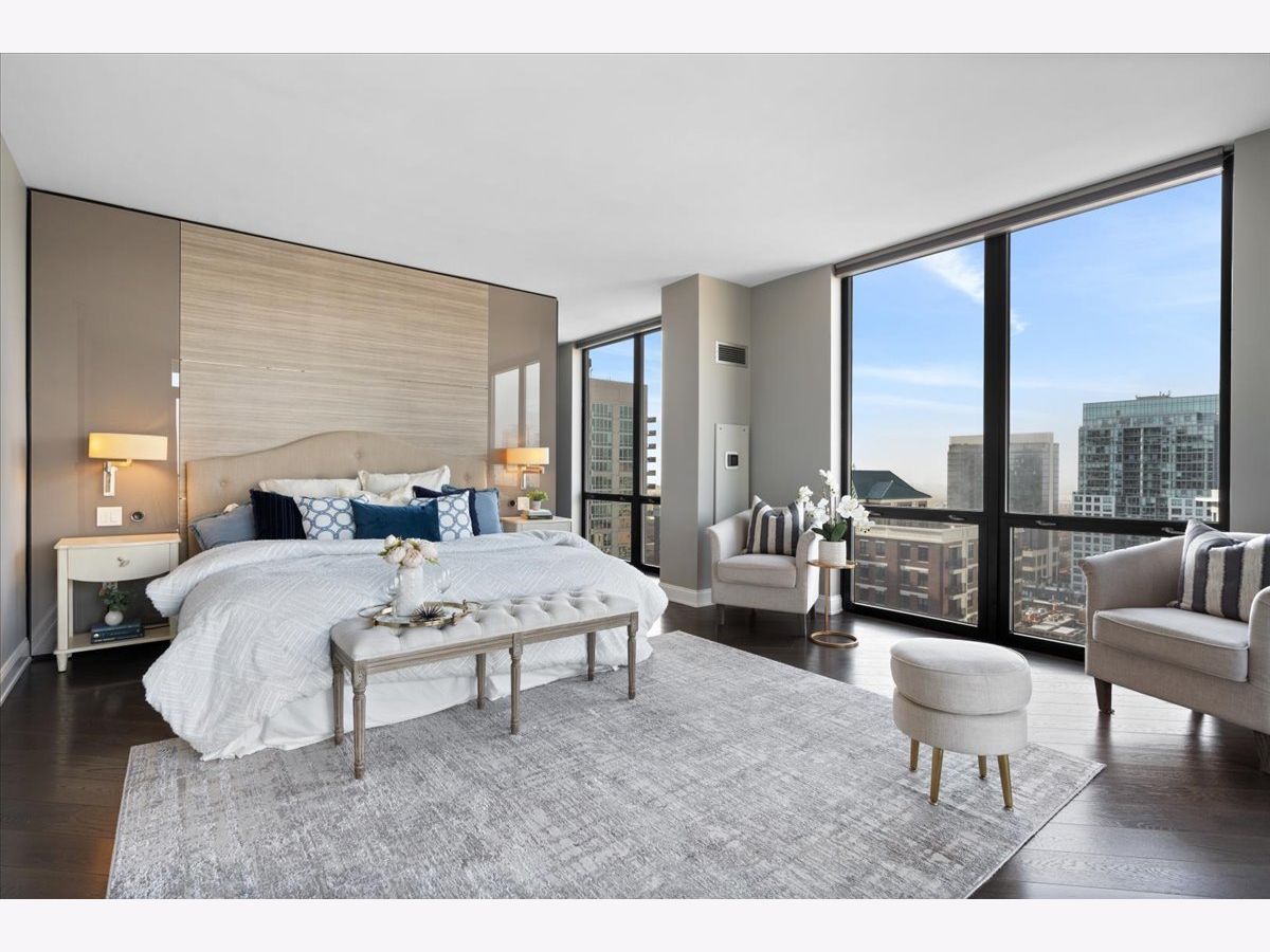 Experience refined luxury living at Erie Centre Tower in the heart of River North. This spectacular, fully gutted and meticulously redesigned residence offers approximately 3,000 square feet of sophisticated living space, spanning the entire east side of the building with breathtaking, unobstructed city views to the south, east, and north. Floor-to-ceiling windows flood the home with natural light, while two private balconies provide the perfect setting for morning coffee or evening entertaining. The expansive open-concept layout showcases a stunning chef's kitchen designed for both everyday living and effortless hosting, complemented by premium designer finishes and integrated smart home technology throughout. Every detail has been thoughtfully curated, including 6" Carlisle white oak flooring, custom closets, Hunter Douglas electronic shades, and designer lighting throughout. An additional living area featuring a wet bar and beverage center creates the ideal space for entertaining or relaxing in style. The luxurious primary suite offers a true retreat, complete with a spa-inspired bath featuring a soaking tub, walk-in shower with body sprays, rain shower, steam, and Robern mirrors with integrated lighting. Additional highlights include two heated, deeded, electric vehicle-ready parking spaces available for an additional $50,000 total. Erie Centre Tower offers full-service amenities including 24-hour door staff, a fitness center, and a rooftop sundeck. This is a rare opportunity to own a turnkey, designer-quality residence in one of River North's premier locations.