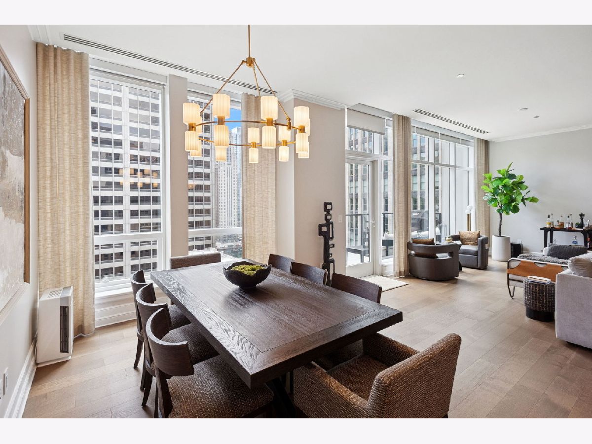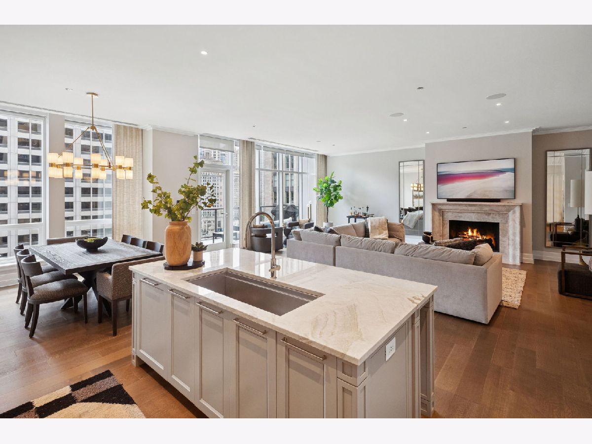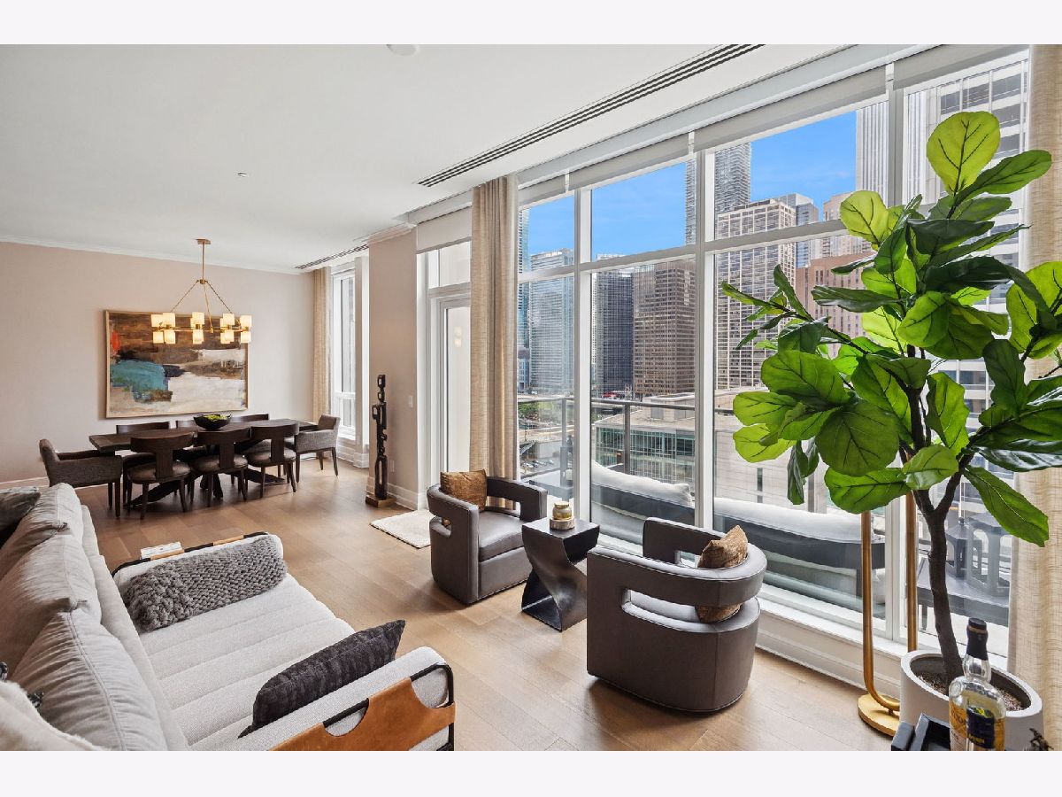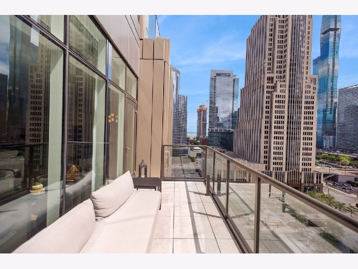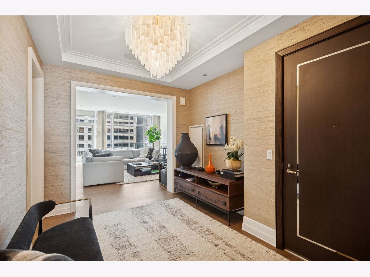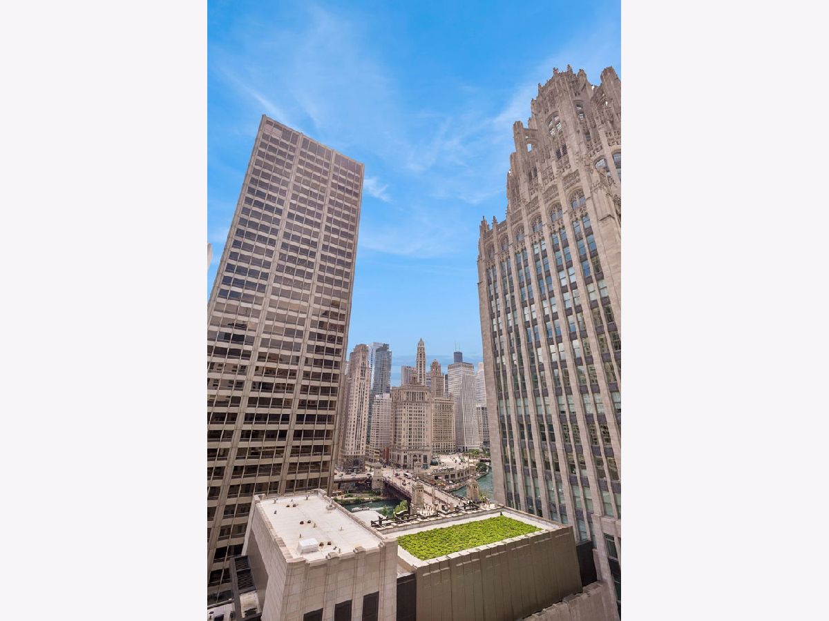 This incomparable property rests high above Chicago's Magnificent Mile at one of Chicago's most exclusive addresses: The Tribune Tower. Timeless elegance is seamlessly blended with the state-of-the-art. This is a treasure. This wonderful unit has a commanding south city view: the Chicago River, Michigan Avenue Bridge, and many world-famous architectural landmarks. The front door opens to an elegant foyer crowned with a shimmering chandelier that accents subtle hessian wallpaper. This smart technology condominium gives efficiency and convenience. The heated White Oak Character Grade floor offers a splendid foundation that passes from room to room, framed by a precise molding. An immediate right turn leased into the breathtaking Living Room framed with a crown molding. An Astria Atlas Vent Free Gas fireplace with silver beige polished marble hearth and surround with custom trim charms the room. The Lutrin blind system gives added exclusivity. A first-class kitchen appeals to the most discerning tastes: Sub Zero Designer Column Freezer with internal ice maker, Wolf gas range with four burners and infrared griddle, Best built-in range hood with integrated lighting and exhaust in custom stainless enclosure, Meile dishwasher. Frank garbage disposal. Kitchen counters and backsplash are Perla Venata quartzite with eased edged. Galley workstation has single bowl double tier under mount sink with single pulldown faucet. Premium grade hardwood drawers and wood shelves offer excellent storage. Drawer fronts and panels are premium white maple with Medex center panels. The extra spacious Living Room sports ten foot ceilings. The elegant Dining Room delights with its beautiful chandelier. This grand room leads to the balcony with its epic views. Complete with aluminum terrace door by Graham Architectural Products, Sterling Dulan Glass Rail, porcelain paver tiles - this balcony has it all. Three full baths and one powder room are will appointed with Kohler and Waterworks fixtures. The powder room has vintage Herringbone pattern white oak flooring. Master bath counter has silver beige polished marble countertop with Carrara Venizia marble tile, shower floor and inlay. Secondary bath has Atlas Concorde Marvel Gray Fleury tile floor and inlay. Secondary bath walls are Stone Source Resort Bianco Matter tile. The Family Room has the custom designed parallel walls, bar with mirrored, illuminated backing and onyx topped cabinets, wine fridge, floor-to-ceiling windows. Walk in closets have custom shelving and recessed lighting. Laundry room has matte finish thermally fused laminate flat slabs, flush mounted designer features, LG washer and dryer. 55,000 feet of amenities defines a new level of luxury. Conference room, tv viewing room, piano, bar, and more. Magnificent fitness center has 75-foot pool, sauna, steam room. Golf practice tee and simulator on second floor. Garage level has dog walk. Outdoor terrace and sun deck flanked by buttresses that transcend anything in the city. Twenty-four-hour door staff and concierge service. Easy access to great shopping and world class cultural centers. Two prime deeded parking spaces included in the price. A must see