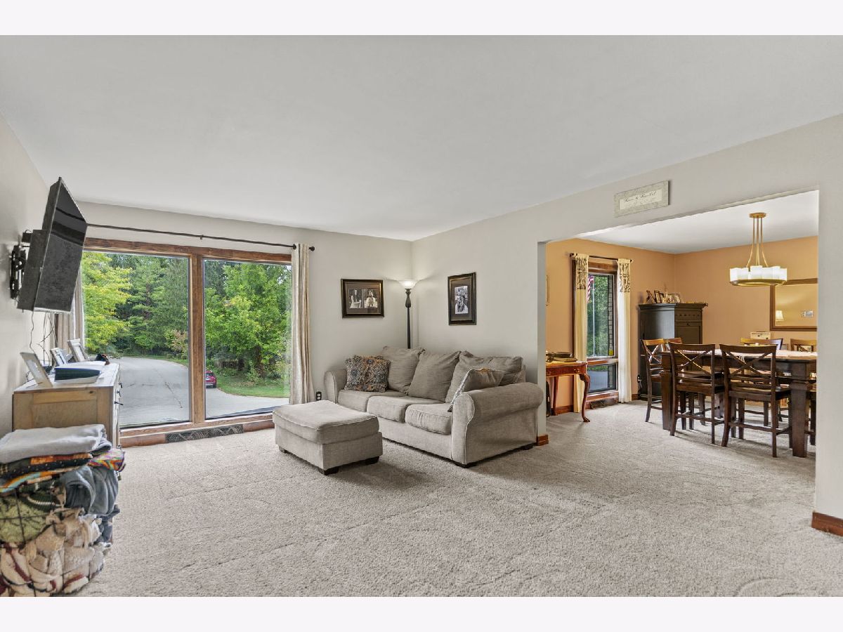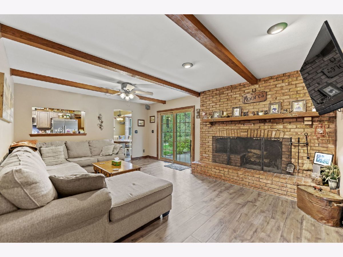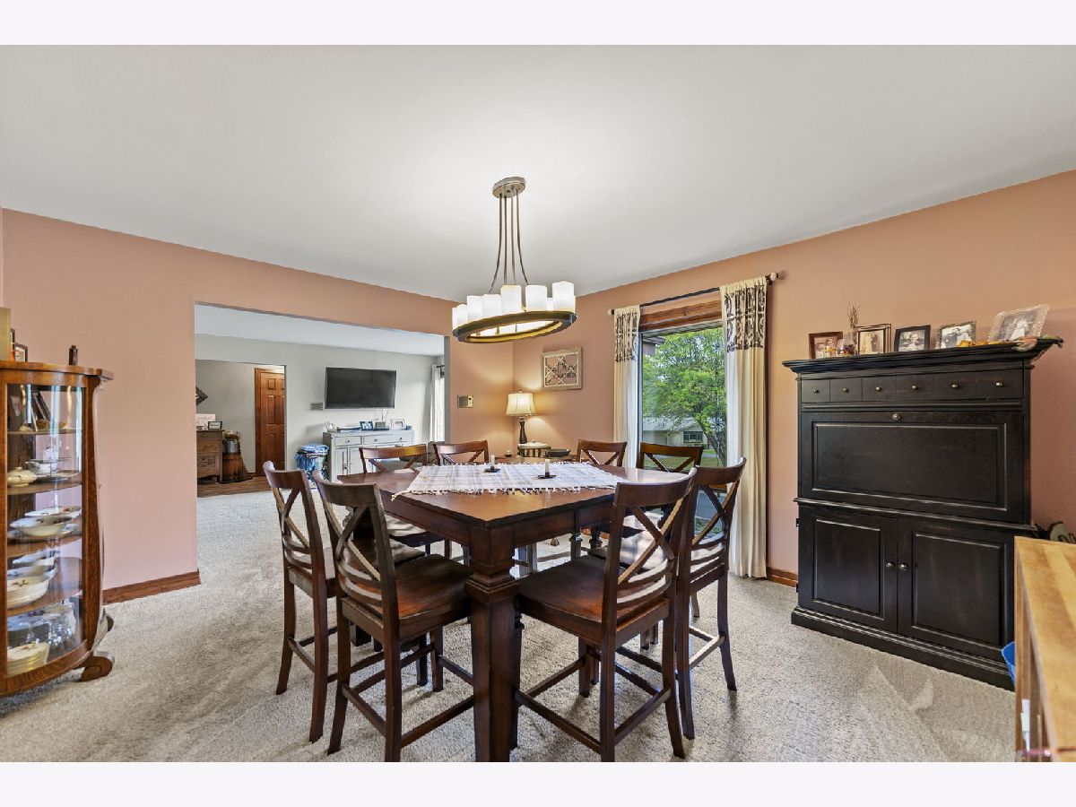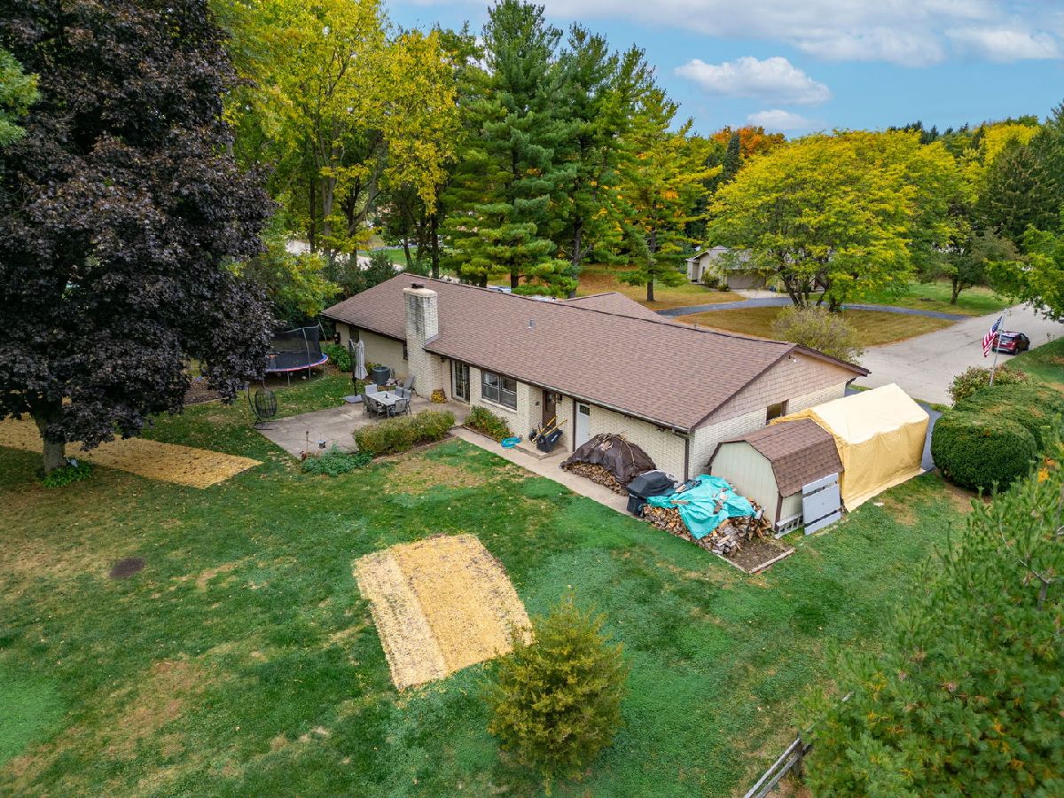 Welcome to this meticulously maintained 2,800 sq. ft. brick ranch, perfectly situated on a wooded, level lot in a peaceful country setting between Belvidere and Rockford. This home sits high in the subdivision with a circle driveway and beautiful views. Step into a spacious entryway that opens into a large combined living and dining area, ideal for entertaining and family gatherings. The cozy family room features a wood-burning fireplace with firewood ready to go, and a sliding door that opens to the backyard, offering scenic views year-round. The outdoor space is perfect for hosting with a fire pit, playset, and room to relax or play. The large eat-in kitchen provides ample space for cooking, dining, and conversation. Oak hardwood floors add warmth and charm to the bedrooms. The full basement is designed for fun and functionality, featuring a pool table, foosball table, office space, a workshop area, and abundant storage. This home is a true example of pride of ownership and has been lovingly cared for inside and out. Don't miss this rare opportunity to own a move-in ready ranch in a serene yet convenient location.