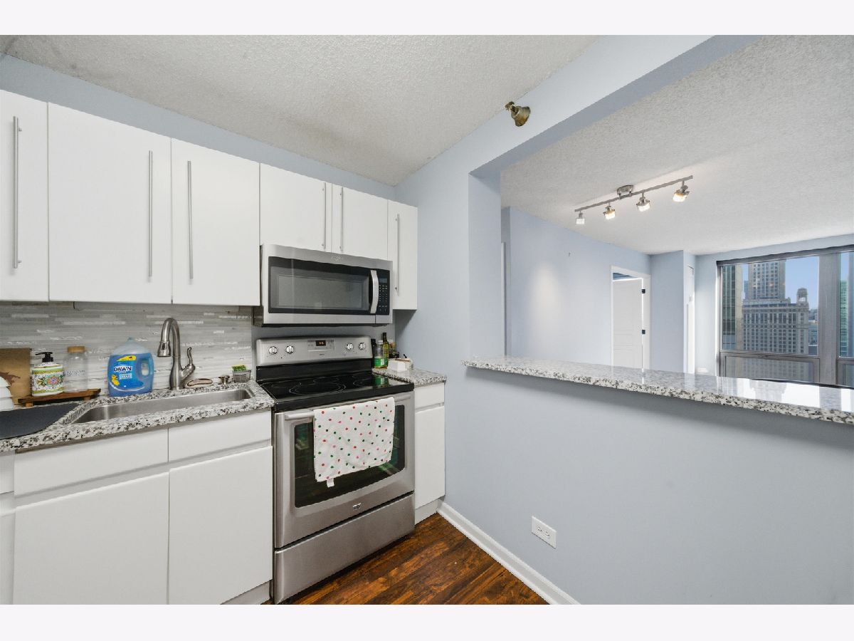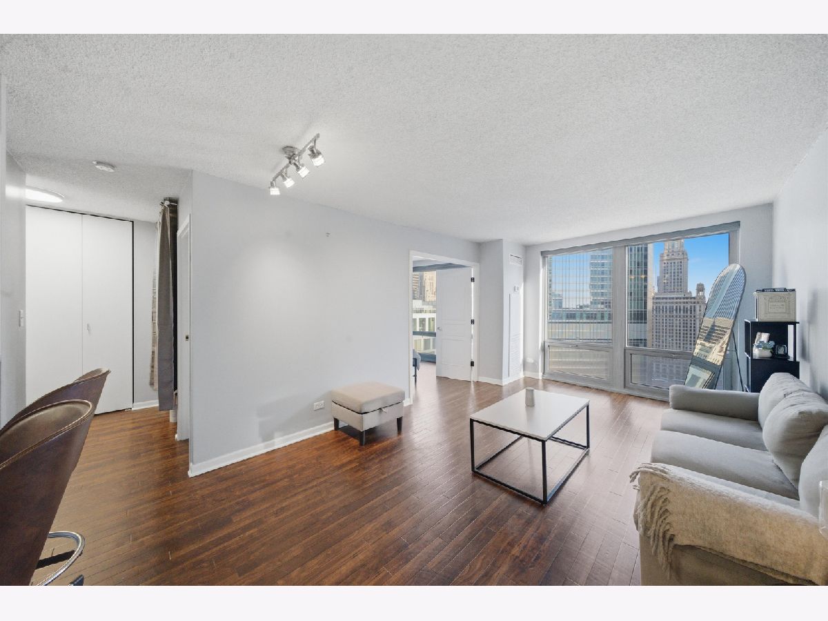 Experience exceptional city living in this bright and spacious 1-bedroom, 1-bath condo in the heart of River North. Floor-to-ceiling windows fill the home with natural light and showcase stunning south-facing views of the skyline and Riverwalk. The kitchen features stainless steel appliances and granite countertops, while wood laminate flooring runs throughout the space. Generous closet space provides plenty of storage. Residents enjoy full-service amenities, including a fitness center, indoor pool, jacuzzi, sauna, theater room, party room, billiards, business center, expansive sundeck, valet/dry cleaning, laundry room, and 24-hour door staff. Located in a prime River North location, you're just steps from the Riverwalk, top dining and nightlife, shopping, grocery stores, and nearby Northwestern and Loyola campuses. Deeded parking space P549 is available for an additional cost. Don't miss this opportunity to own in one of Chicago's most sought-after neighborhoods. Explore the home in 3D by clicking the virtual tour.
