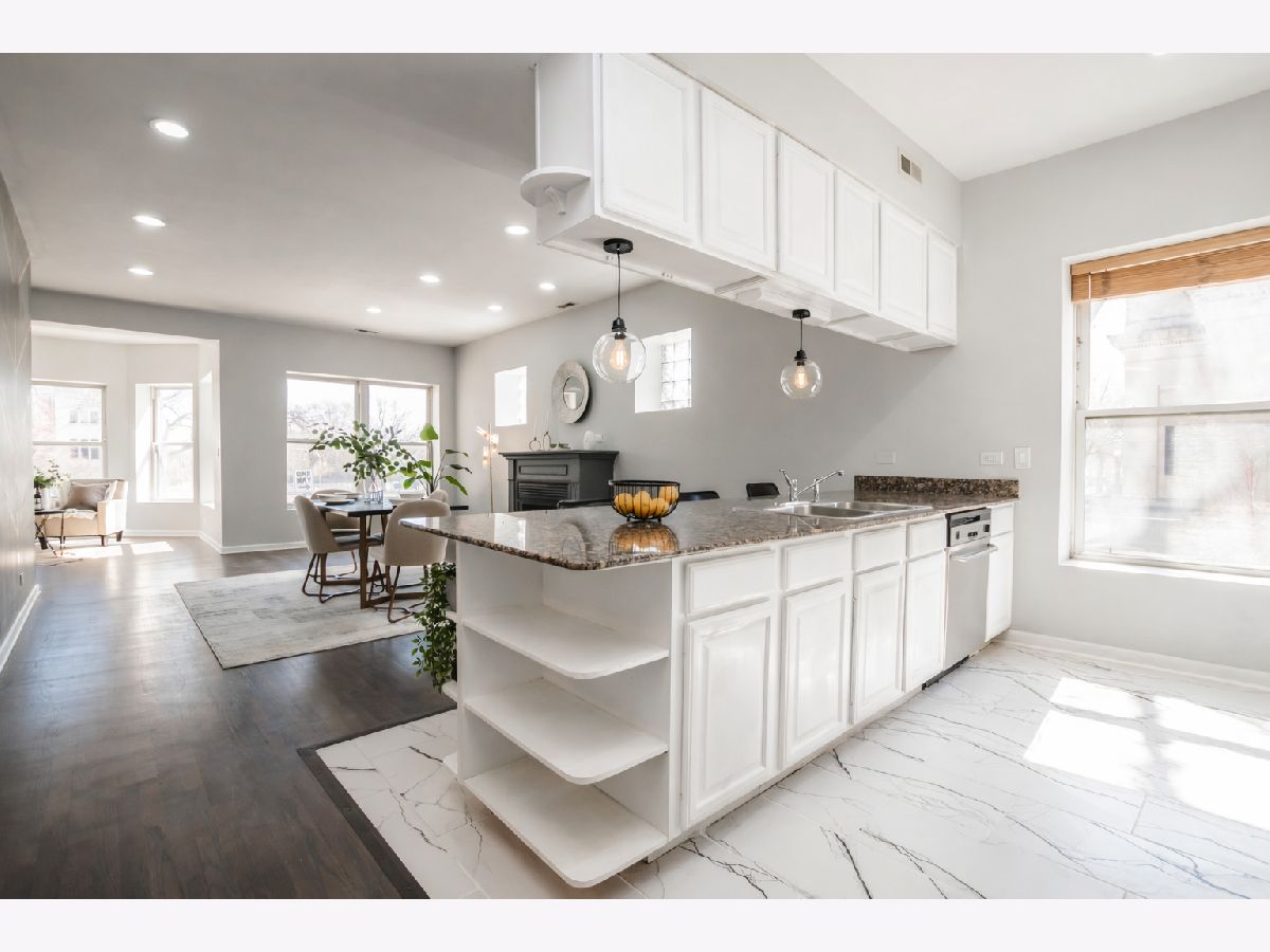 Rare 4-bedroom/2bath layout in this newly renovated corner unit located in the heart of Bronzeville. This expansive home blends modern finishes with classic charm, featuring rich walnut-toned hardwood floors and an abundance of natural light pouring in from multiple exposures. This Unit fearures: Updated kitchen white cabinetry, granite countertops, a stylish tile backsplash, and stainless steel appliances, including a double-door refrigerator with a lower freezer. The open-concept layout flows seamlessly from the kitchen into the enormous dining and living areas, anchored by a spacious foyer with a convenient front closet and enhanced by charming bay window seating. The bay window area creates a versatile space-perfect for a cozy reading nook, plant sanctuary, or sunlit relaxation corner. It's an ideal spot to unwind, sip your morning coffee, or bring your indoor greenery to life. The primary suite is a true retreat, featuring soft carpeting for warm, comfortable footing, two large walk-in closets, and a luxurious ensuite bath complete with a jetted tub, separate shower, dual vanity, modern lighted mirror, and elegant white and gray tile finishes. No on-site parking, though nearby rental options and street availability provide flexible solutions. Situated in the heart of historic Bronzeville, this home is located along one of Chicago's most culturally rich and architecturally significant corridors. King Drive-particularly from 43rd to 50th Street-was once the center of a vibrant jazz scene, known for its iconic music venues and creative energy that helped shape the city's cultural landscape. Today, Bronzeville continues to experience exciting revitalization, blending historic charm with new development, local dining, art spaces, and community investment. Conveniently located with easy access to downtown, Hyde Park, and the lakefront, this location offers both connectivity & character. Experience a neighborhood with deep roots, timeless architecture, and a strong sense of place.