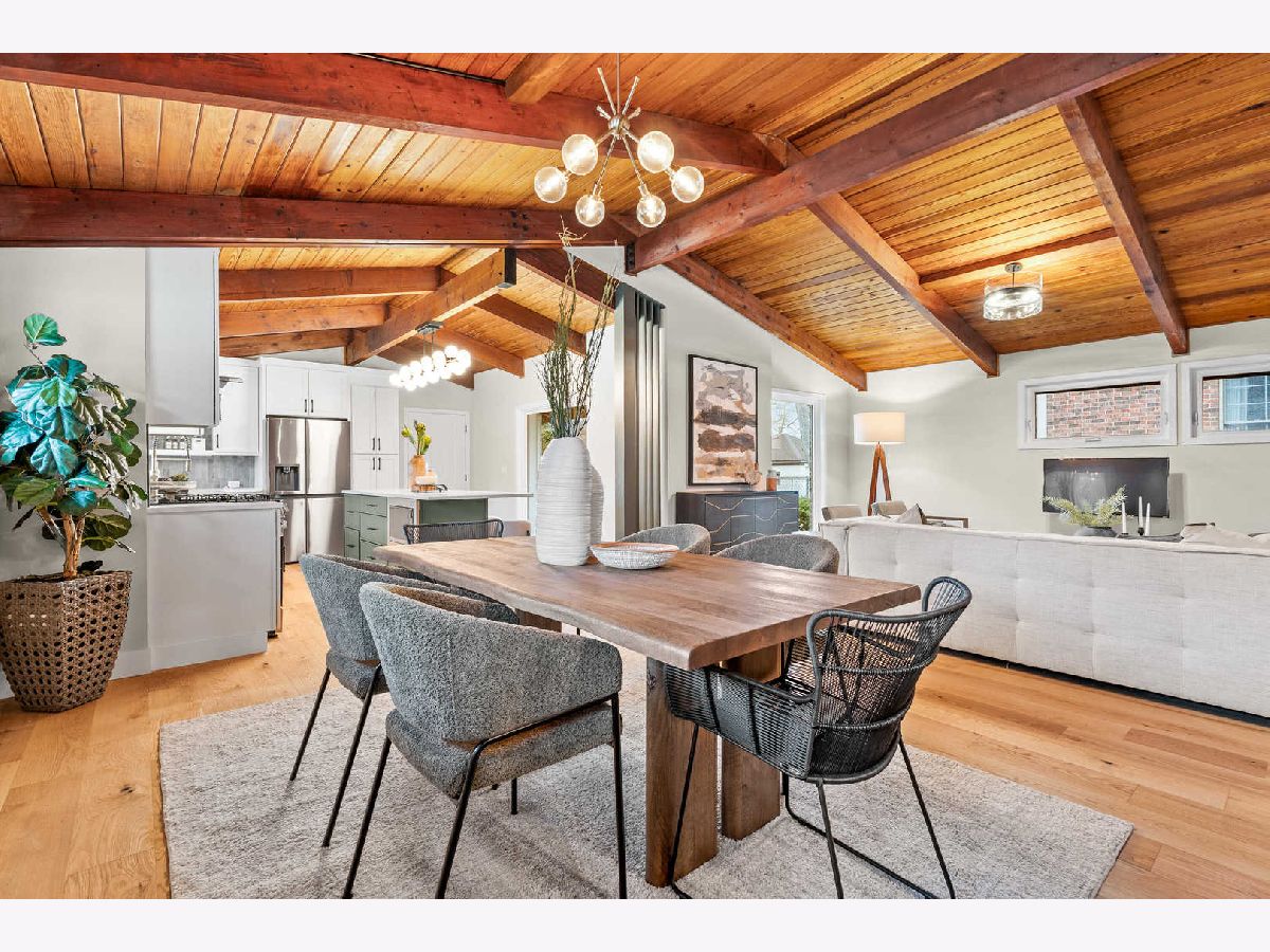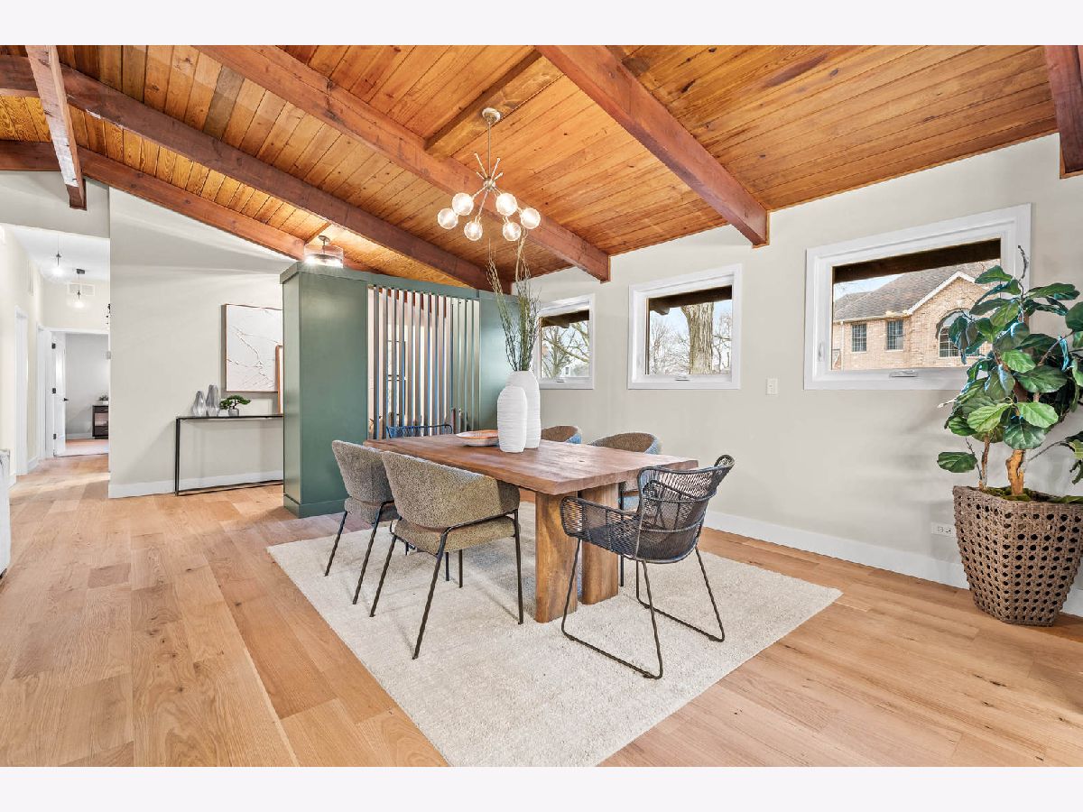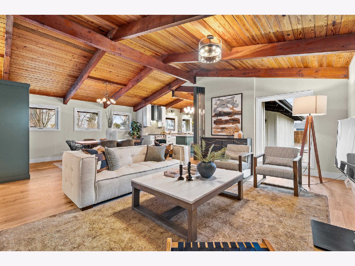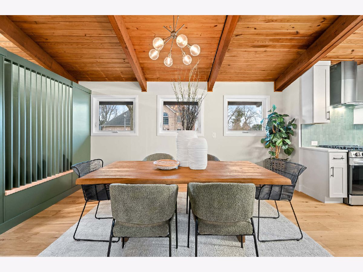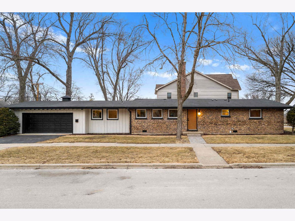 Welcome to this reimagined mid-century Elmhurst ranch home located in an established and convenient neighborhood. Completed in February 2026, this thoughtfully remodeled 1,610 square foot home features 3 bedrooms, 2 full baths, a 2-car attached garage, and expansive basement with an estimated additional 773 square feet of finished space. The small footprint packs a punch and utilizes every square inch to make this home work for the needs of today's busy homeowners. Behind the gorgeous new front door, a convenient drop zone with sage green cabinet storage, slat divider, and handy bench keeps the home organized. Walk into the newly opened, redesigned layout featuring warm wide-plank white oak hardwood flooring that provides light, function, and durable years of use in the living room, dining room, kitchen, and hallway. Above, the hand-stained original and new wood beams unite the area with an impressive vaulted ceiling providing authentic mid-century modern vibes. New white interior doors with black hardware provide continuity and polish throughout. The open-plan kitchen features plentiful dove 42" upper cabinets with custom mid-century inspired exhaust hood and trim, decorative shelving, striking laurel fern porcelain satin tile backsplash, and expansive Santorini quartz counters showcased by plentiful natural light. New stainless appliances include fridge, dishwasher, and slide-in gas range as the crown jewel. Seating four easily, enjoy the 7' island with microwave, lit by a stunning 22-globe bubble chandelier. A cabinet pantry provides ample storage and the adjacent dining area features an aged brass chandelier. The focal point of the living room is the electric fireplace framed with statement-making large format Pietra Di Marmi ribbed ceramic tile. The modern chandelier completes this gathering space. Pausing here provides a beautiful vantage point to appreciate the charming bright and airy layout. At the end of the hallway, the carpeted primary bedroom with vaulted ceiling, sconces flanking the king-size bed, and coordinating ceiling light provide a spacious feel with large closet. The redesigned ensuite features vaulted ceilings, furniture-style warm wood vanity with gold fixtures and globe lights, and custom glass shower done with striking earthy deep blue-green vertical stacked tiles. Each of the two additional bedrooms have beautiful vaulted ceilings, new carpeting, closets with shelving and motion-sensor lights, and new wall-switch activated globe ceiling light fixtures. The hall bath glows with ice blue and patterned tile surrounding the new tub, white countertop over wood cabinetry, black fixtures, and tile flooring. For peace of mind, 2026 installations include new windows and exterior doors, garage door, Carrier high-efficiency furnace, 200 amp electrical panel with arc fault, and voice annunciator interconnected smoke/carbon monoxide detectors. Private yard includes cozy courtyard with slider door access to main living area. The sizable basement features a large L-shaped versatile carpeted rec room with separate laundry area including washer, dryer, and utility sink. Unfinished basement spaces include separate storage room, mechanical room with new sump pump, and partial crawl space. Zoned for Community School District 205 schools: Emerson Elementary, Churchville Middle, and York Community High School. Easy walk to elementary school, parks, and Elmhurst Metra train station. This move-in ready home provides quick access to I-294/290, Metra, shopping, parks, private schools, shopping, forest preserves, and more. This reinvented home is located in a sought-after, convenient location in an established neighborhood.
