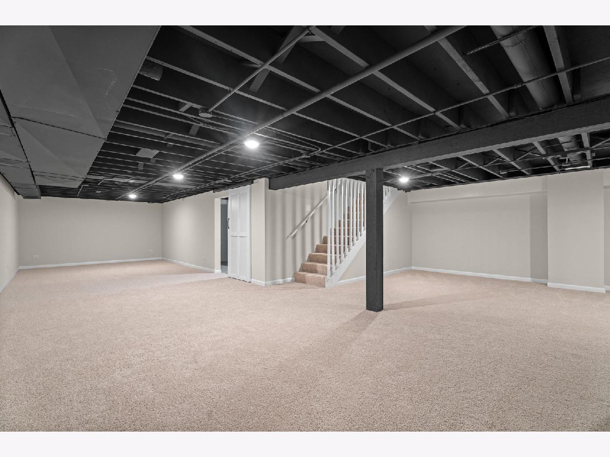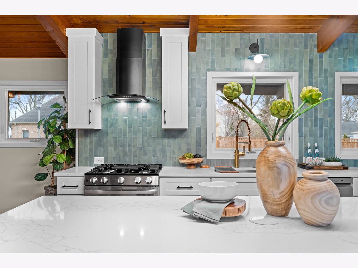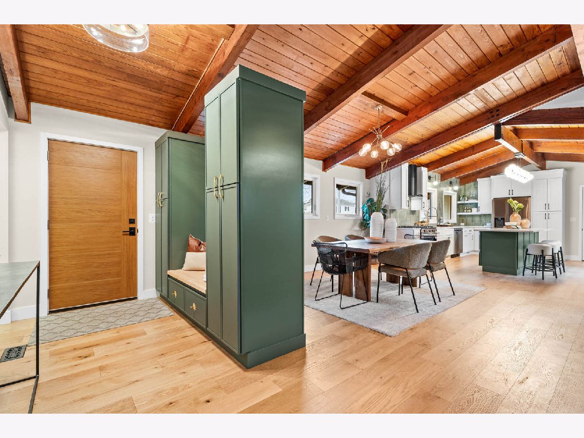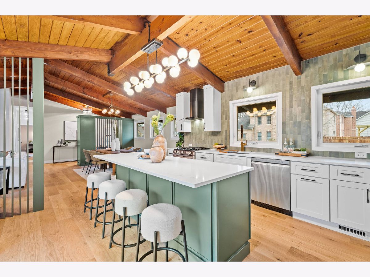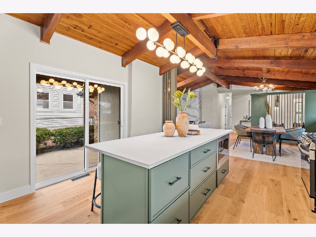 Welcome to this reimagined mid-century Elmhurst ranch home located in an established and convenient neighborhood. Completed in February 2026, this thoughtfully remodeled 1,610 square foot home features 3 bedrooms, 2 full baths, a 2-car attached garage, and expansive basement with an estimated additional 773 square feet of finished space. The small footprint packs a punch and utilizes every square inch to make this home work for the needs of today's busy homeowners. Behind the gorgeous new front door, a convenient drop zone with sage green cabinet storage, slat divider, and handy bench keeps the home organized. Walk into the newly opened, redesigned layout featuring warm wide-plank white oak hardwood flooring that provides light, function, and durable years of use in the living room, dining room, kitchen, and hallway. Above, the hand-stained original and new wood beams unite the area with an impressive vaulted ceiling providing authentic mid-century modern vibes. New white interior doors with black hardware provide continuity and polish throughout. The open-plan kitchen features plentiful dove 42" upper cabinets with custom mid-century inspired exhaust hood and trim, decorative shelving, striking laurel fern porcelain satin tile backsplash, and expansive Santorini quartz counters showcased by plentiful natural light. New stainless appliances include fridge, dishwasher, and slide-in gas range as the crown jewel. Seating four easily, enjoy the 7' island with microwave, lit by a stunning 22-globe bubble chandelier. A cabinet pantry provides ample storage and the adjacent dining area features an aged brass chandelier. The focal point of the living room is the electric fireplace framed with statement-making large format Pietra Di Marmi ribbed ceramic tile. The modern chandelier completes this gathering space. Pausing here provides a beautiful vantage point to appreciate the charming bright and airy layout. At the end of the hallway, the carpeted primary bedroom with vaulted ceiling, sconces flanking the king-size bed, and coordinating ceiling light provide a spacious feel with large closet. The redesigned ensuite features vaulted ceilings, furniture-style warm wood vanity with gold fixtures and globe lights, and custom glass shower done with striking earthy deep blue-green vertical stacked tiles. Each of the two additional bedrooms have beautiful vaulted ceilings, new carpeting, closets with shelving and motion-sensor lights, and new wall-switch activated globe ceiling light fixtures. The hall bath glows with ice blue and patterned tile surrounding the new tub, white countertop over wood cabinetry, black fixtures, and tile flooring. For peace of mind, 2026 installations include new windows and exterior doors, garage door, Carrier high-efficiency furnace, 200 amp electrical panel with arc fault, and voice annunciator interconnected smoke/carbon monoxide detectors. Private yard includes cozy courtyard with slider door access to main living area. The sizable basement features a large L-shaped versatile carpeted rec room with separate laundry area including washer, dryer, and utility sink. Unfinished basement spaces include separate storage room, mechanical room with new sump pump, and partial crawl space. Zoned for Community School District 205 schools: Emerson Elementary, Churchville Middle, and York Community High School. Easy walk to elementary school, parks, and Elmhurst Metra train station. This move-in ready home provides quick access to I-294/290, Metra, shopping, parks, private schools, shopping, forest preserves, and more. This reinvented home is located in a sought-after, convenient location in an established neighborhood.