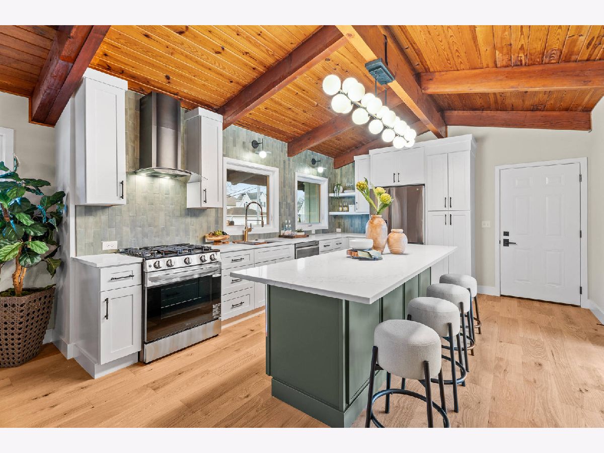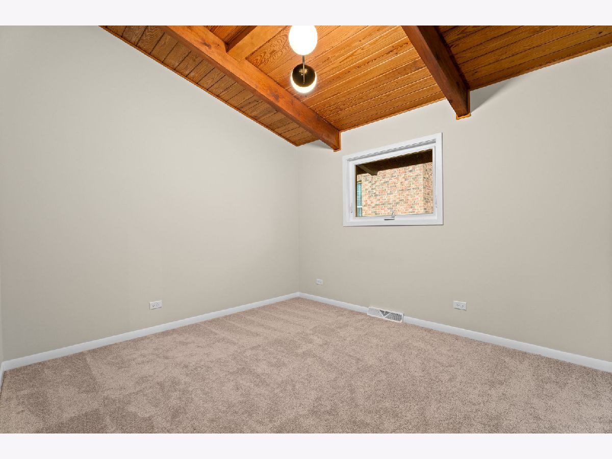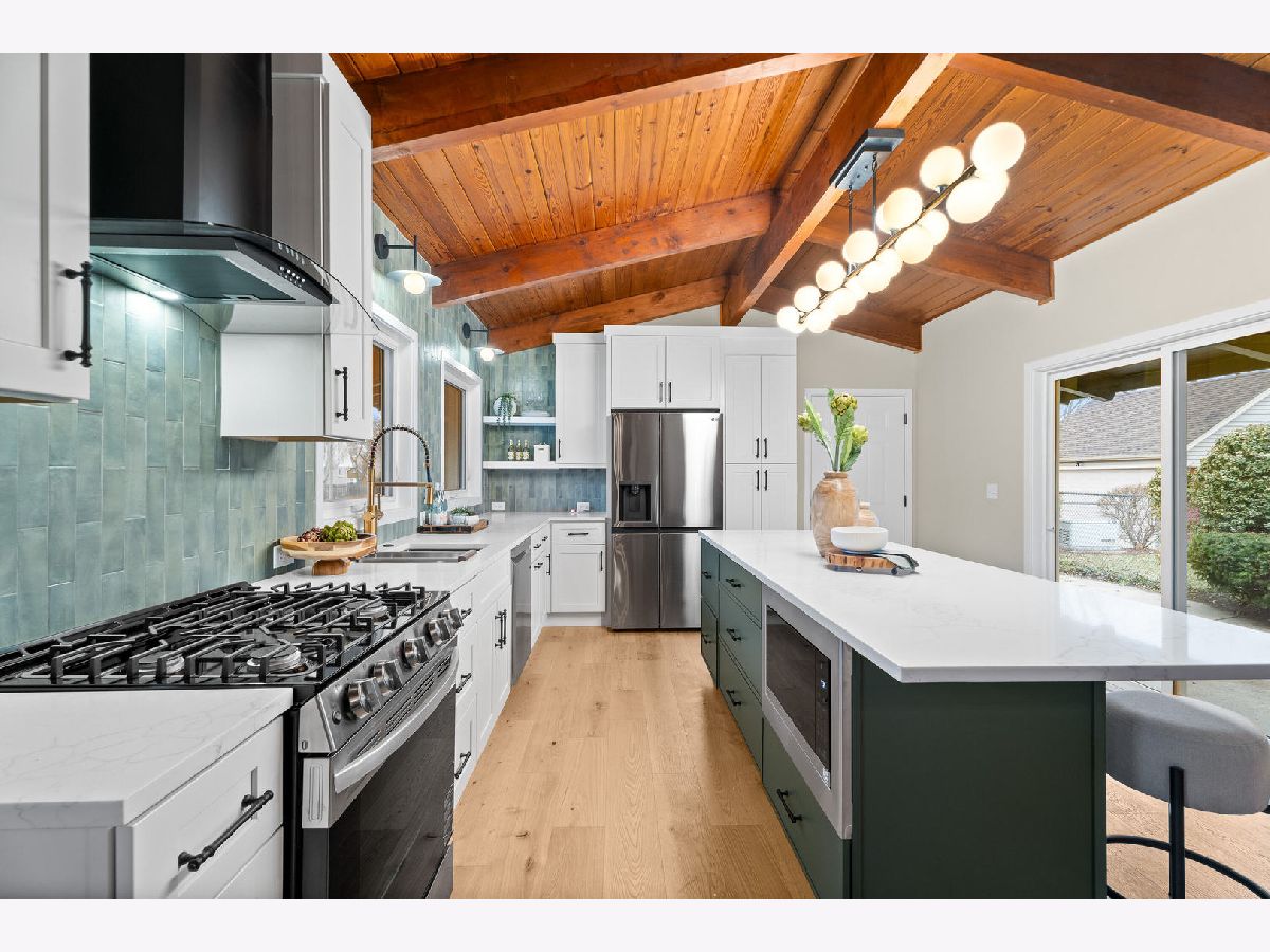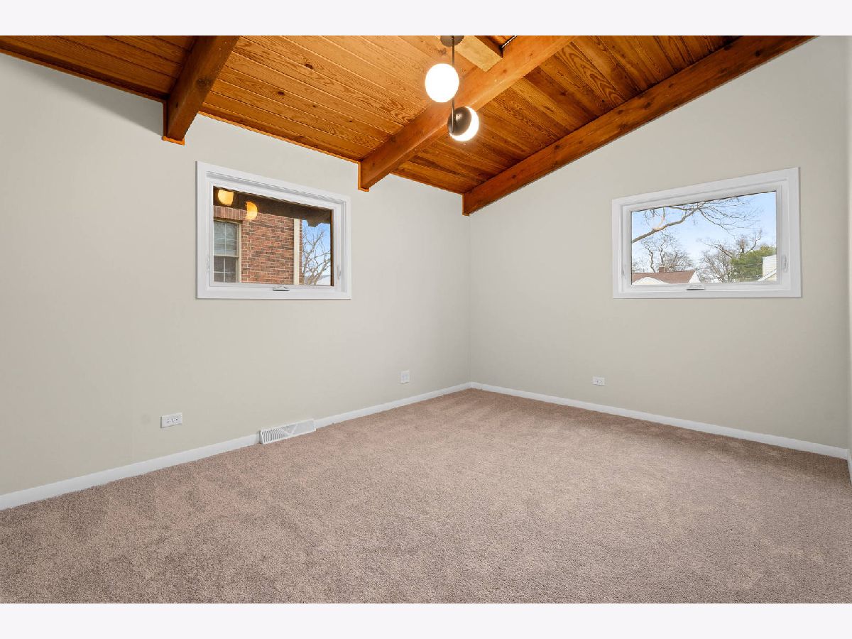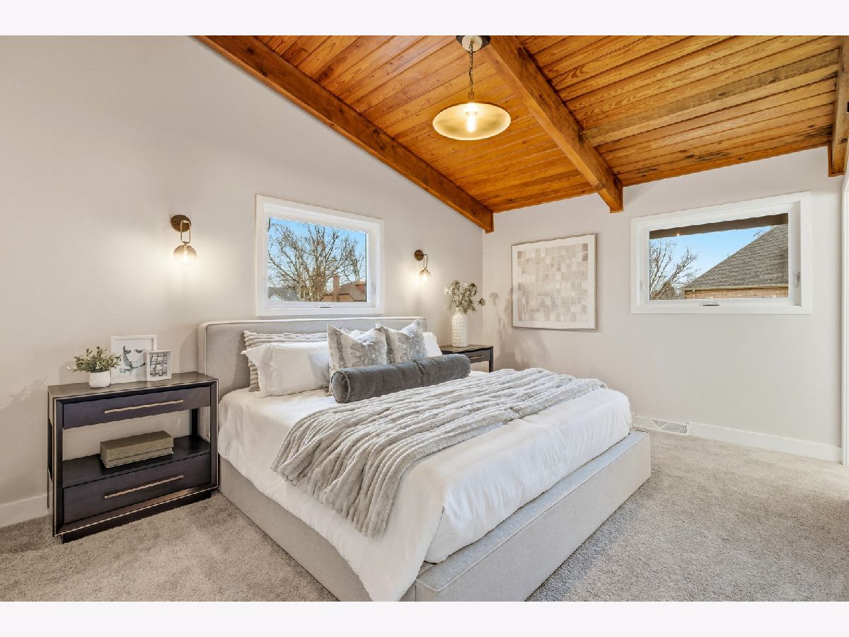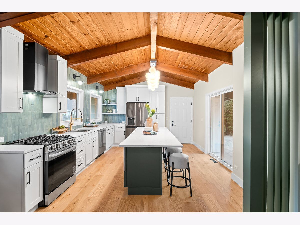 Welcome to this reimagined mid-century Elmhurst ranch home located in an established and convenient neighborhood. Completed in February 2026, this thoughtfully remodeled 1,610 square foot home features 3 bedrooms, 2 full baths, a 2-car attached garage, and expansive basement with an estimated additional 773 square feet of finished space. The small footprint packs a punch and utilizes every square inch to make this home work for the needs of today's busy homeowners. Behind the gorgeous new front door, a convenient drop zone with sage green cabinet storage, slat divider, and handy bench keeps the home organized. Walk into the newly opened, redesigned layout featuring warm wide-plank white oak hardwood flooring that provides light, function, and durable years of use in the living room, dining room, kitchen, and hallway. Above, the hand-stained original and new wood beams unite the area with an impressive vaulted ceiling providing authentic mid-century modern vibes. New white interior doors with black hardware provide continuity and polish throughout. The open-plan kitchen features plentiful dove 42" upper cabinets with custom mid-century inspired exhaust hood and trim, decorative shelving, striking laurel fern porcelain satin tile backsplash, and expansive Santorini quartz counters showcased by plentiful natural light. New stainless appliances include fridge, dishwasher, and slide-in gas range as the crown jewel. Seating four easily, enjoy the 7' island with microwave, lit by a stunning 22-globe bubble chandelier. A cabinet pantry provides ample storage and the adjacent dining area features an aged brass chandelier. The focal point of the living room is the electric fireplace framed with statement-making large format Pietra Di Marmi ribbed ceramic tile. The modern chandelier completes this gathering space. Pausing here provides a beautiful vantage point to appreciate the charming bright and airy layout. At the end of the hallway, the carpeted primary bedroom with vaulted ceiling, sconces flanking the king-size bed, and coordinating ceiling light provide a spacious feel with large closet. The redesigned ensuite features vaulted ceilings, furniture-style warm wood vanity with gold fixtures and globe lights, and custom glass shower done with striking earthy deep blue-green vertical stacked tiles. Each of the two additional bedrooms have beautiful vaulted ceilings, new carpeting, closets with shelving and motion-sensor lights, and new wall-switch activated globe ceiling light fixtures. The hall bath glows with ice blue and patterned tile surrounding the new tub, white countertop over wood cabinetry, black fixtures, and tile flooring. For peace of mind, 2026 installations include new windows and exterior doors, garage door, Carrier high-efficiency furnace, 200 amp electrical panel with arc fault, and voice annunciator interconnected smoke/carbon monoxide detectors. Private yard includes cozy courtyard with slider door access to main living area. The sizable basement features a large L-shaped versatile carpeted rec room with separate laundry area including washer, dryer, and utility sink. Unfinished basement spaces include separate storage room, mechanical room with new sump pump, and partial crawl space. Zoned for Community School District 205 schools: Emerson Elementary, Churchville Middle, and York Community High School. Easy walk to elementary school, parks, and Elmhurst Metra train station. This move-in ready home provides quick access to I-294/290, Metra, shopping, parks, private schools, shopping, forest preserves, and more. This reinvented home is located in a sought-after, convenient location in an established neighborhood.