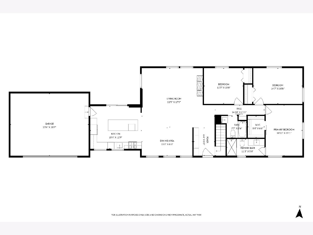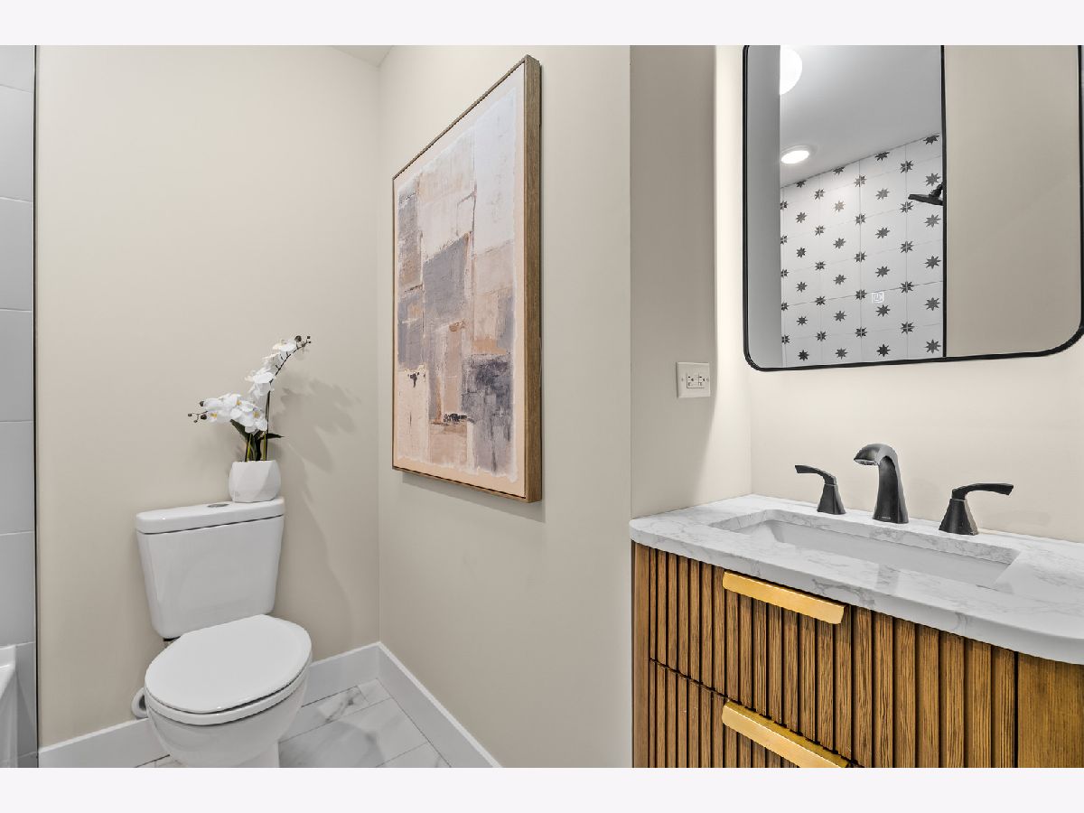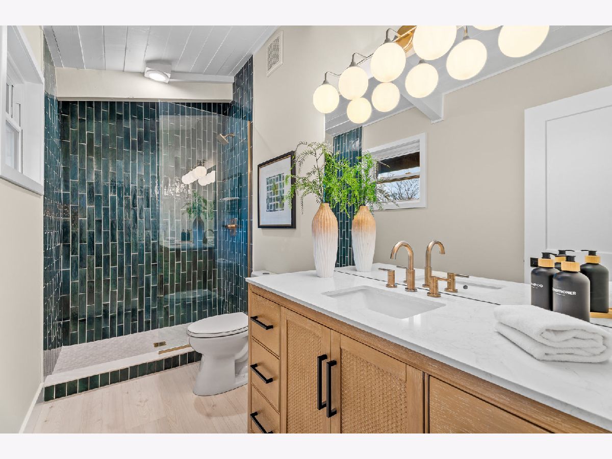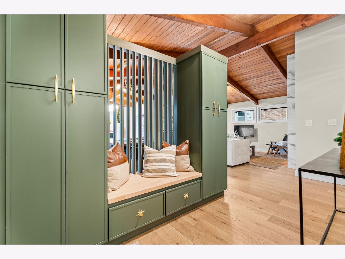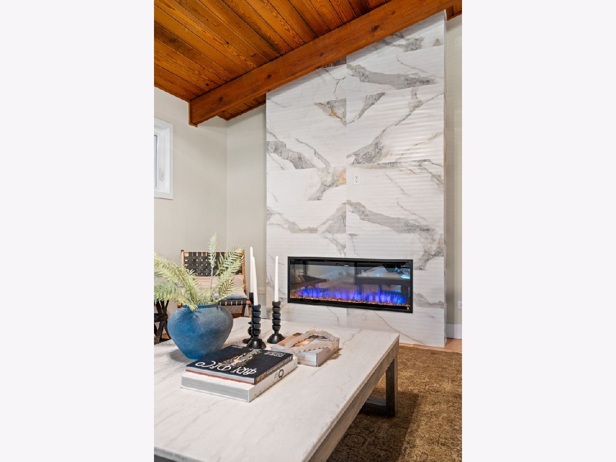 Welcome to this reimagined mid-century Elmhurst ranch home located in an established and convenient neighborhood. Completed in February 2026, this thoughtfully remodeled 1,610 square foot home features 3 bedrooms, 2 full baths, a 2-car attached garage, and expansive basement with an estimated additional 773 square feet of finished space. The small footprint packs a punch and utilizes every square inch to make this home work for the needs of today's busy homeowners. Behind the gorgeous new front door, a convenient drop zone with sage green cabinet storage, slat divider, and handy bench keeps the home organized. Walk into the newly opened, redesigned layout featuring warm wide-plank white oak hardwood flooring that provides light, function, and durable years of use in the living room, dining room, kitchen, and hallway. Above, the hand-stained original and new wood beams unite the area with an impressive vaulted ceiling providing authentic mid-century modern vibes. New white interior doors with black hardware provide continuity and polish throughout. The open-plan kitchen features plentiful dove 42" upper cabinets with custom mid-century inspired exhaust hood and trim, decorative shelving, striking laurel fern porcelain satin tile backsplash, and expansive Santorini quartz counters showcased by plentiful natural light. New stainless appliances include fridge, dishwasher, and slide-in gas range as the crown jewel. Seating four easily, enjoy the 7' island with microwave, lit by a stunning 22-globe bubble chandelier. A cabinet pantry provides ample storage and the adjacent dining area features an aged brass chandelier. The focal point of the living room is the electric fireplace framed with statement-making large format Pietra Di Marmi ribbed ceramic tile. The modern chandelier completes this gathering space. Pausing here provides a beautiful vantage point to appreciate the charming bright and airy layout. At the end of the hallway, the carpeted primary bedroom with vaulted ceiling, sconces flanking the king-size bed, and coordinating ceiling light provide a spacious feel with large closet. The redesigned ensuite features vaulted ceilings, furniture-style warm wood vanity with gold fixtures and globe lights, and custom glass shower done with striking earthy deep blue-green vertical stacked tiles. Each of the two additional bedrooms have beautiful vaulted ceilings, new carpeting, closets with shelving and motion-sensor lights, and new wall-switch activated globe ceiling light fixtures. The hall bath glows with ice blue and patterned tile surrounding the new tub, white countertop over wood cabinetry, black fixtures, and tile flooring. For peace of mind, 2026 installations include new windows and exterior doors, garage door, Carrier high-efficiency furnace, 200 amp electrical panel with arc fault, and voice annunciator interconnected smoke/carbon monoxide detectors. Private yard includes cozy courtyard with slider door access to main living area. The sizable basement features a large L-shaped versatile carpeted rec room with separate laundry area including washer, dryer, and utility sink. Unfinished basement spaces include separate storage room, mechanical room with new sump pump, and partial crawl space. Zoned for Community School District 205 schools: Emerson Elementary, Churchville Middle, and York Community High School. Easy walk to elementary school, parks, and Elmhurst Metra train station. This move-in ready home provides quick access to I-294/290, Metra, shopping, parks, private schools, shopping, forest preserves, and more. This reinvented home is located in a sought-after, convenient location in an established neighborhood.