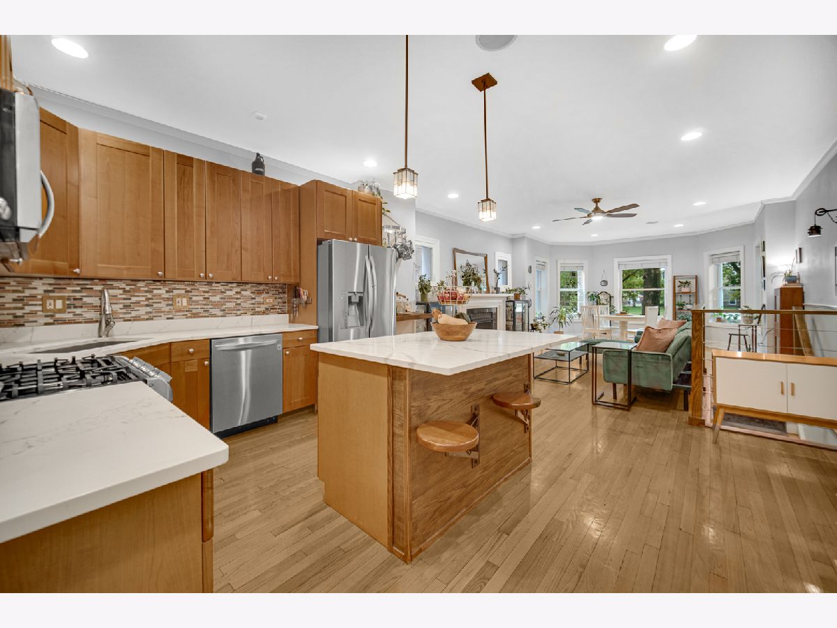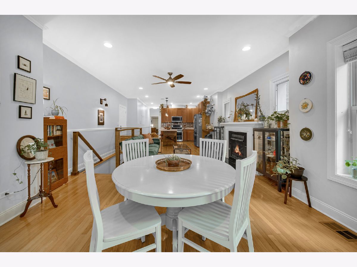 Welcome to this bright and inviting duplex-down condo, perfectly situated across from a park offering peaceful green space and beautiful views in the walkable Albany Park area. Natural light pours in through large windows, creating a warm and welcoming atmosphere throughout. The main level features an open layout with kitchen and island, dining area nestled in the bay window (a dream spot for plant lovers), and a cozy living room with a gas fireplace and built in bluetooth speakers. Two generously sized bedrooms are also on this floor, including a primary suite with a walk-in closet and private bathroom. A second full bathroom is easily accessible for guests, with extra storage nearby. Off the back, you'll find a private deck, perfect for relaxing, gardening, or enjoying crisp fall evenings. The lower level has been freshly carpeted and painted, and offers a spacious family room, ideal for movie nights, entertaining, or extra living space. You'll also find a third bedroom, a full bathroom, and an abundance of storage, including a laundry room with side-by-side machines. There is a versatile nook under the stairs, for a home office, playroom, wine cellar, or just extra storage! This home lives like a single family, and comes with a private garage, plus access to a shared yard, giving you even more room to enjoy. With generous living space, thoughtful storage, and unbeatable light, this Albany Park condo truly checks all the boxes.