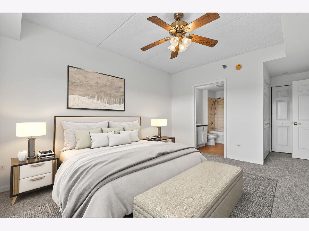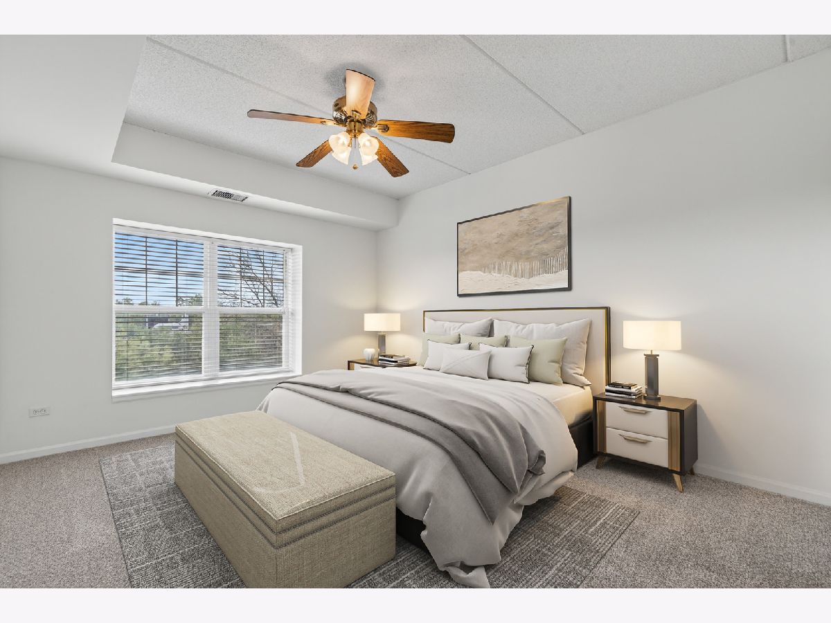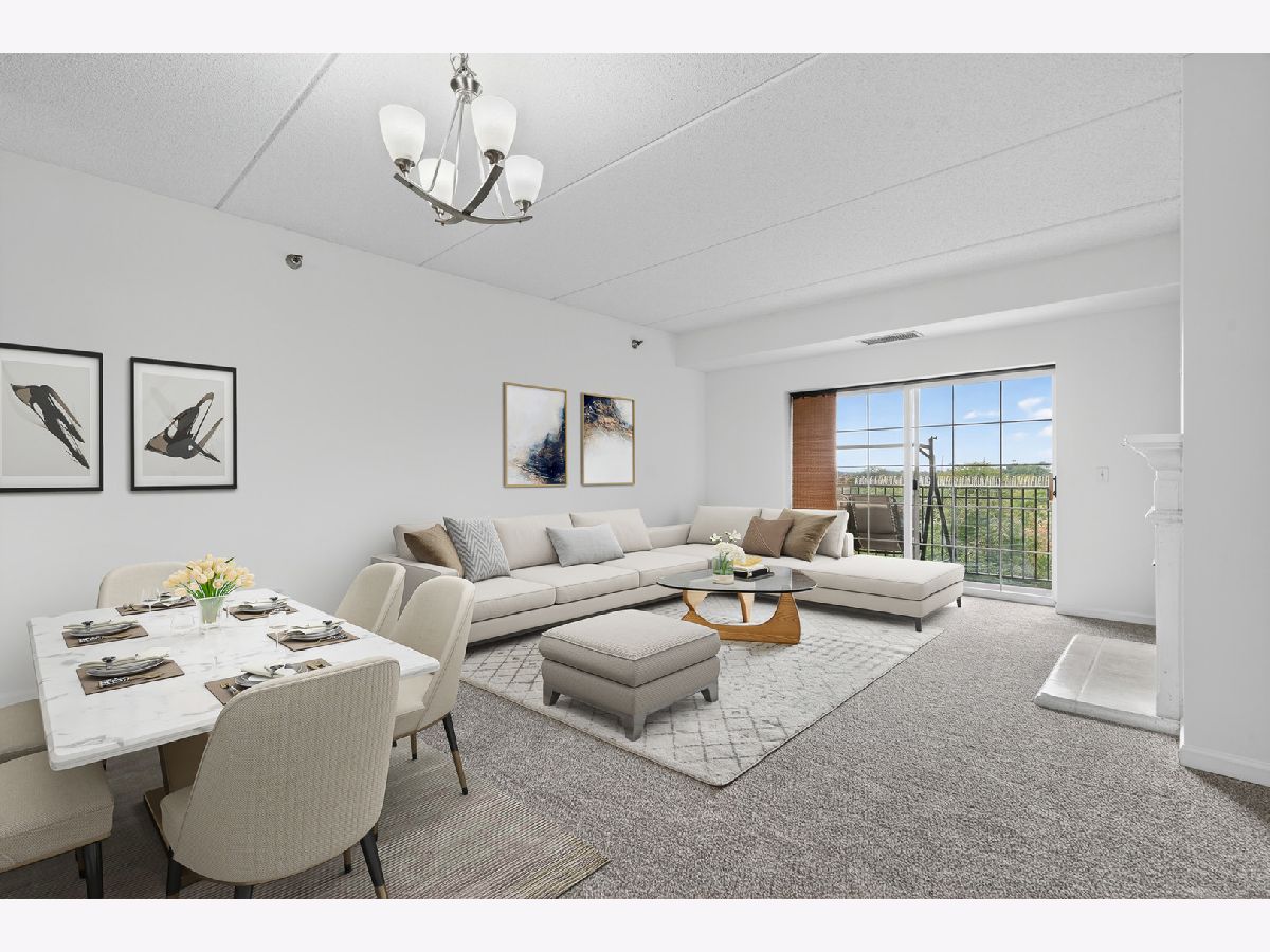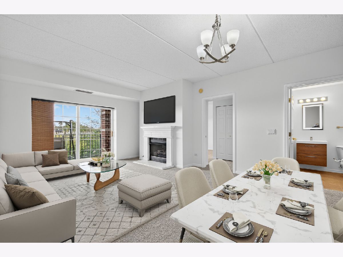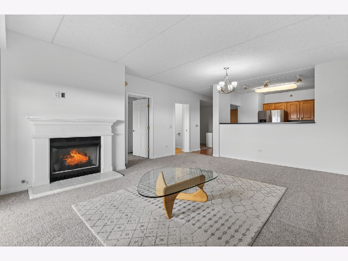 Welcome to The Groves of Palatine! This spacious 1 bed + den, 1.5 bath condo has just been freshly painted and has brand new carpet! Situated on the fourth floor with beautiful west-facing views perched just above the treetops allowing for added sunlight to pour in. The open-concept kitchen features stainless steel appliances, Corian countertops, and abundant cabinet space, flowing into a bright living and dining area with a cozy fireplace. The generous bedroom offers two closets and a spa-like en-suite bath with a jacuzzi tub. A versatile den includes in-unit laundry and is perfect for a home office or guest space. Enjoy beautiful sunsets from your private balcony. Additional highlights include a heated garage space, extra storage locker, and tons of exterior visitor parking. Located in a well-maintained, secure elevator building just blocks from the Metra, Jewel, and all of downtown Palatine's restaurants, bars, and shopping. Enjoy easy access to Deer Grove Forest Preserve and Riemer Reservoir Park for recreation and nature.