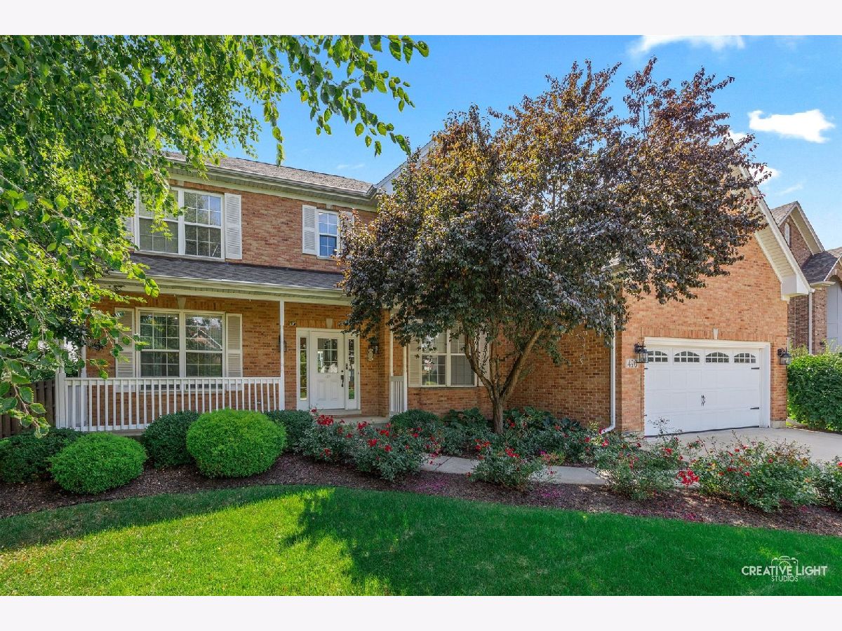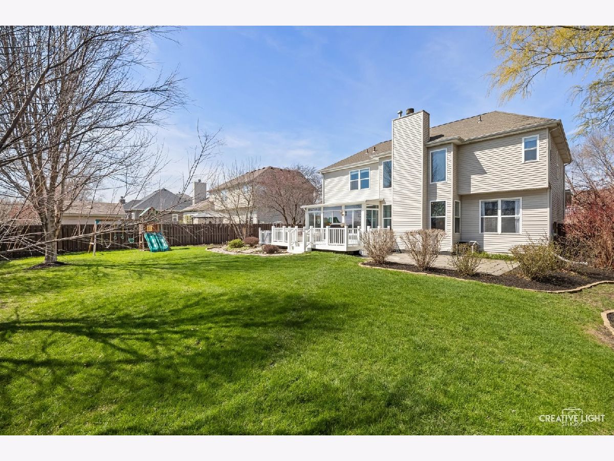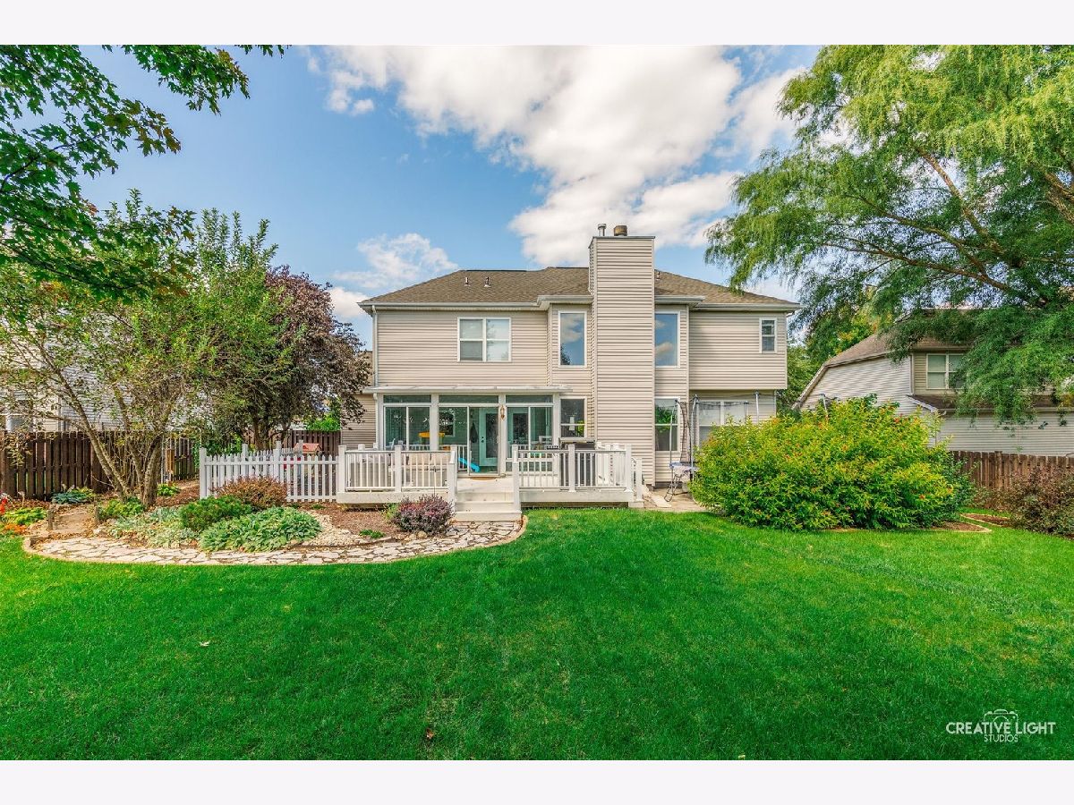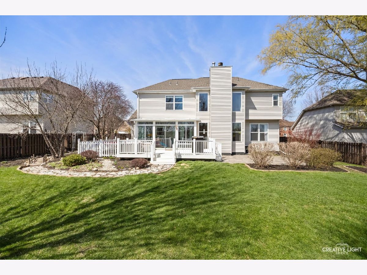 Stunning brick-front home in Brighton Meadows with gorgeous professional landscaping! A welcoming covered front porch leads into an expansive foyer with a guest closet. The first floor features gleaming floors and crisp white trim throughout. The formal living room is filled with natural light, while French doors open to a versatile study or sitting room, complete with custom built-in bookcases and a cozy fireplace. The chef's kitchen is a standout, offering an extensive subway tile backsplash, abundant cabinetry, a farmhouse sink, stainless steel appliances, a center island, and a spacious eating area with access to the enclosed sunroom and backyard. The impressive vaulted family room showcases a custom chandelier and a dramatic two-story brick fireplace flanked by windows. Also on the first floor is a private den or theatre room with crown molding and recessed lighting. The main level also includes a powder room and a convenient laundry/mudroom with garage access. Upstairs, the beautiful primary suite features double walk-in closets and a private bath with dual sinks, a soaking tub, and a separate shower. Three additional bedrooms offer generous closet space, ceiling fans with lights, and easy access to the hall bath. The full basement with crawlspace provides ample storage and endless potential. Step outside to a beautifully landscaped, fully-fenced backyard with no rear neighbors-complete with a maintenance-free deck and flagstone patio perfect for entertaining or relaxing in privacy. Numerous updates and ideally located with excellent District 308 schools. Just minutes from all the amenities, plus Rush Copley Medical Complex. This is one you won't want to miss!