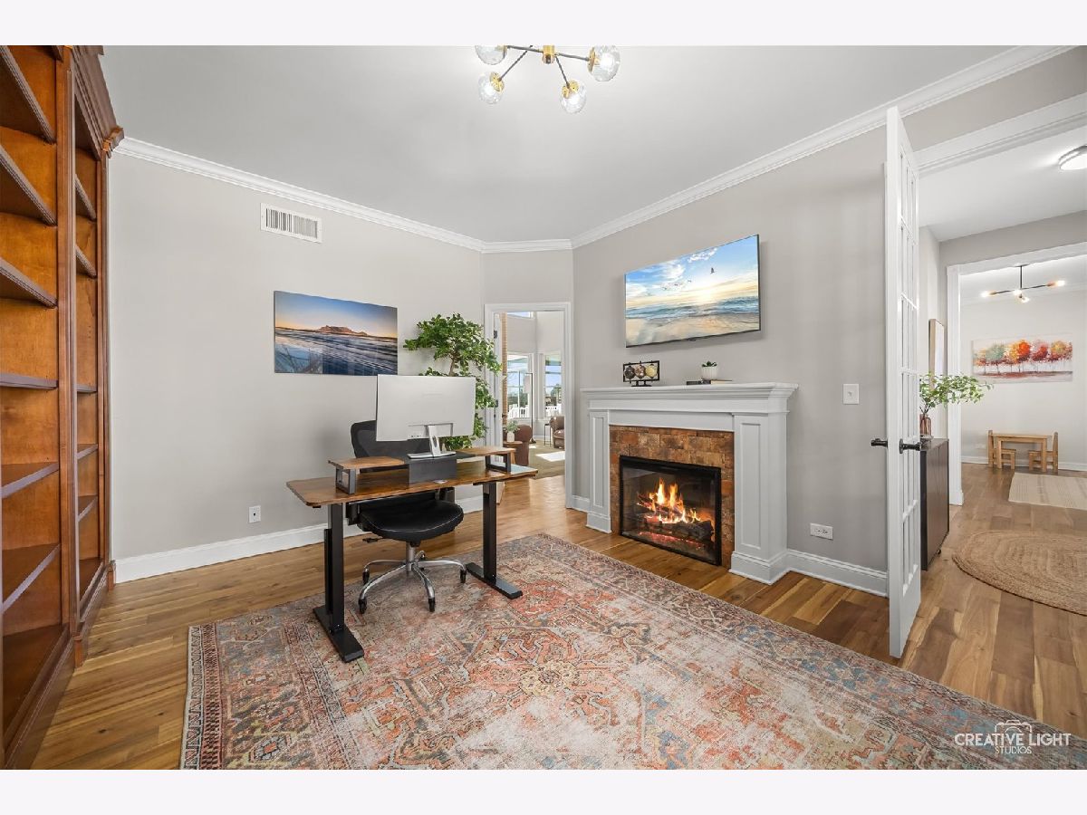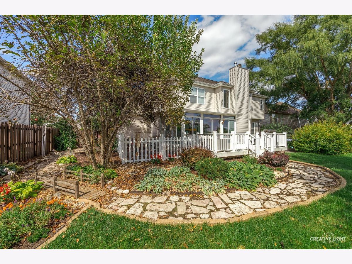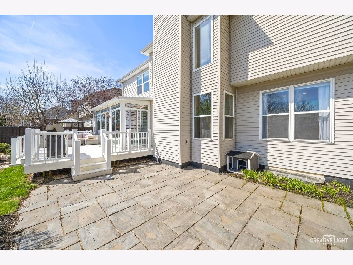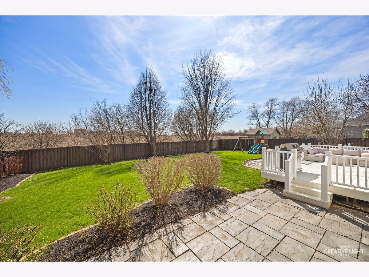 Stunning brick-front home in Brighton Meadows with gorgeous professional landscaping! A welcoming covered front porch leads into an expansive foyer with a guest closet. The first floor features gleaming floors and crisp white trim throughout. The formal living room is filled with natural light, while French doors open to a versatile study or sitting room, complete with custom built-in bookcases and a cozy fireplace. The chef's kitchen is a standout, offering an extensive subway tile backsplash, abundant cabinetry, a farmhouse sink, stainless steel appliances, a center island, and a spacious eating area with access to the enclosed sunroom and backyard. The impressive vaulted family room showcases a custom chandelier and a dramatic two-story brick fireplace flanked by windows. Also on the first floor is a private den or theatre room with crown molding and recessed lighting. The main level also includes a powder room and a convenient laundry/mudroom with garage access. Upstairs, the beautiful primary suite features double walk-in closets and a private bath with dual sinks, a soaking tub, and a separate shower. Three additional bedrooms offer generous closet space, ceiling fans with lights, and easy access to the hall bath. The full basement with crawlspace provides ample storage and endless potential. Step outside to a beautifully landscaped, fully-fenced backyard with no rear neighbors-complete with a maintenance-free deck and flagstone patio perfect for entertaining or relaxing in privacy. Numerous updates and ideally located with excellent District 308 schools. Just minutes from all the amenities, plus Rush Copley Medical Complex. This is one you won't want to miss!