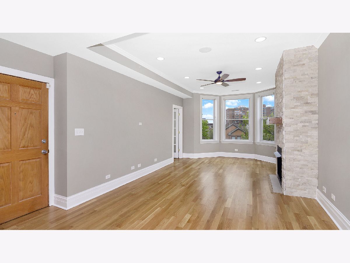 Recently remodeled and beautifully maintained, this spacious top-floor condo sits in an intimate three-unit graystone surrounded by newly constructed homes. Enjoy luxury living with hardwood floors throughout, an elegant travertine stone gas fireplace, and a spacious kitchen featuring 42" maple cabinets, under-cabinet lighting, stainless steel appliances, and treetop views from every window. All appliances and the HVAC system are under five years old, including a top-of-the-line stackable washer and dryer. The generous bedrooms include a primary suite with a Jacuzzi tub, double vanity, and large walk-in closet. A bonus room provides the perfect space for an office or den, and the unit is wired for surround sound. Unwind on your private balcony and take advantage of the gated parking space. Conveniently located within walking distance to the train, lake, and University of Chicago. Don't let this one pass you by!