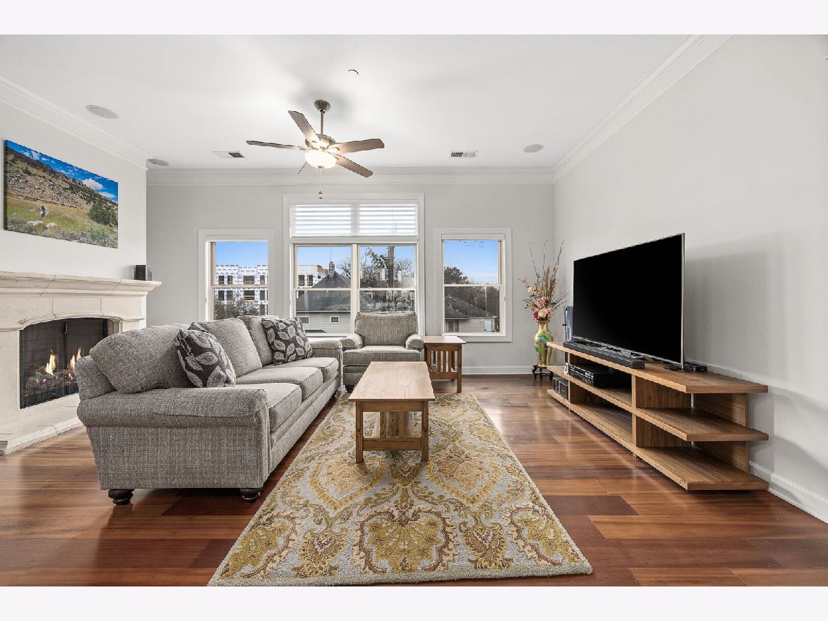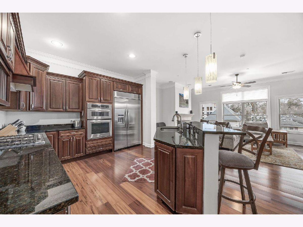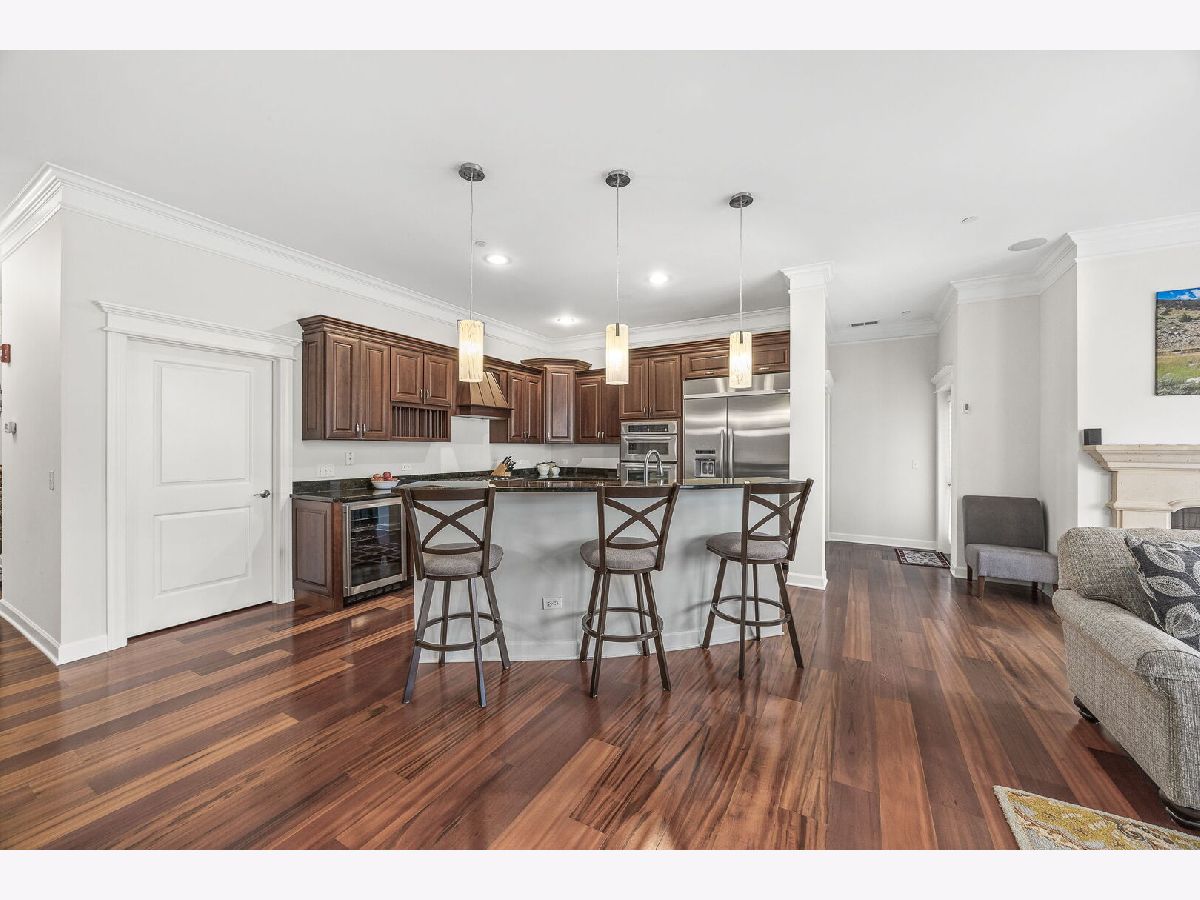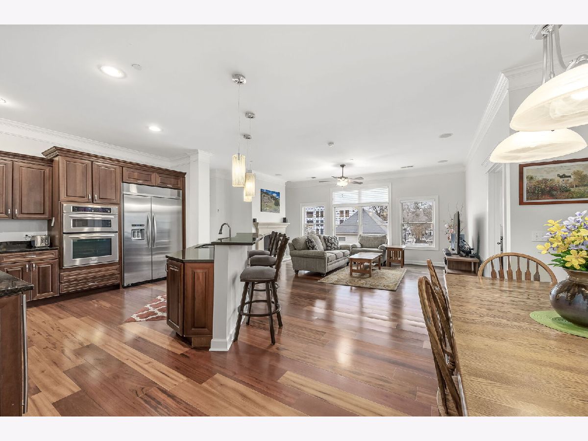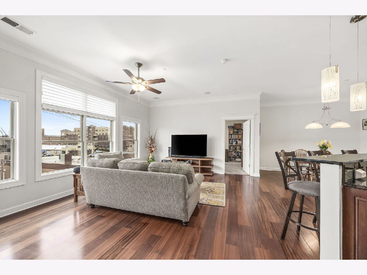 Sophisticated and spacious 2-bedroom, 2-bathroom condo offers refined city-style living in the heart of Downers Grove. Within the generous 1,890 sq ft open floor plan, soaring 10-foot ceilings and Brazilian Cherry wood laminate flooring (main living areas) set an elevated tone from the moment you enter. Gourmet kitchen impresses with stainless steel appliances-including a wine fridge-granite countertops, custom cabinetry, a center island with breakfast bar, and a large walk-in pantry. Living area features a cozy gas fireplace with impressive mantel and oversized windows that flood the space with natural light. Expansive primary suite serves as a true retreat, offering space for a reading nook or desk, and newly remodeled en-suite bathroom showcasing double vanities, a walk-in shower with dual shower heads, custom tile and glasswork and a bench seat, plus an oversized custom walk-in closet with laminate organizers. Second bedroom includes private access to a hall bathroom (tastefully updated in 2025 with a new countertop, mirror, and lighting) and features a versatile tandem room ideal for an additional walk-in closet, home office, or hobby space. Premium finishes elevate the home, including oversized crown molding, Pella windows, and an integrated surround sound system with built-in speakers. East-facing balcony provides peaceful morning light and a relaxing outdoor escape. In-unit laundry and dedicated storage space located on the same floor as the unit add everyday convenience. Heated indoor parking plus an additional exterior parking space are included. Building amenities enrich daily living with a putting green, fitness room, lounge with game area, and meeting rooms on each floor. Prime location just one block from the Metra station and vibrant downtown Downers Grove-home to the historic Tivoli Theatre, restaurants, cafes, and boutique shopping along Main Street. Schedule your showing today and experience the elevated lifestyle this home offers.
