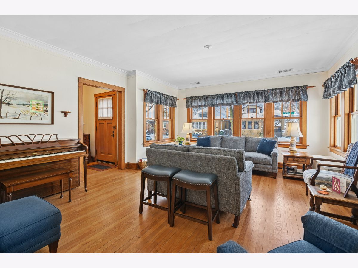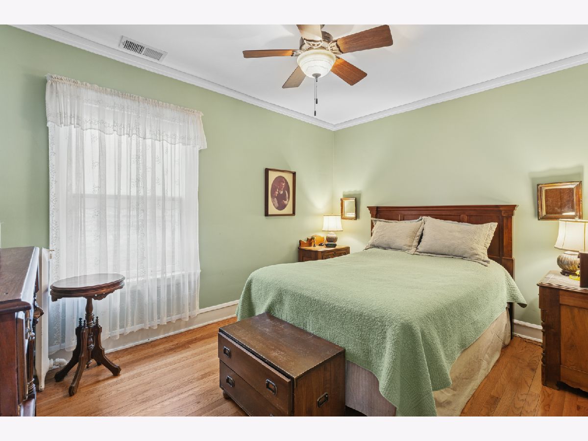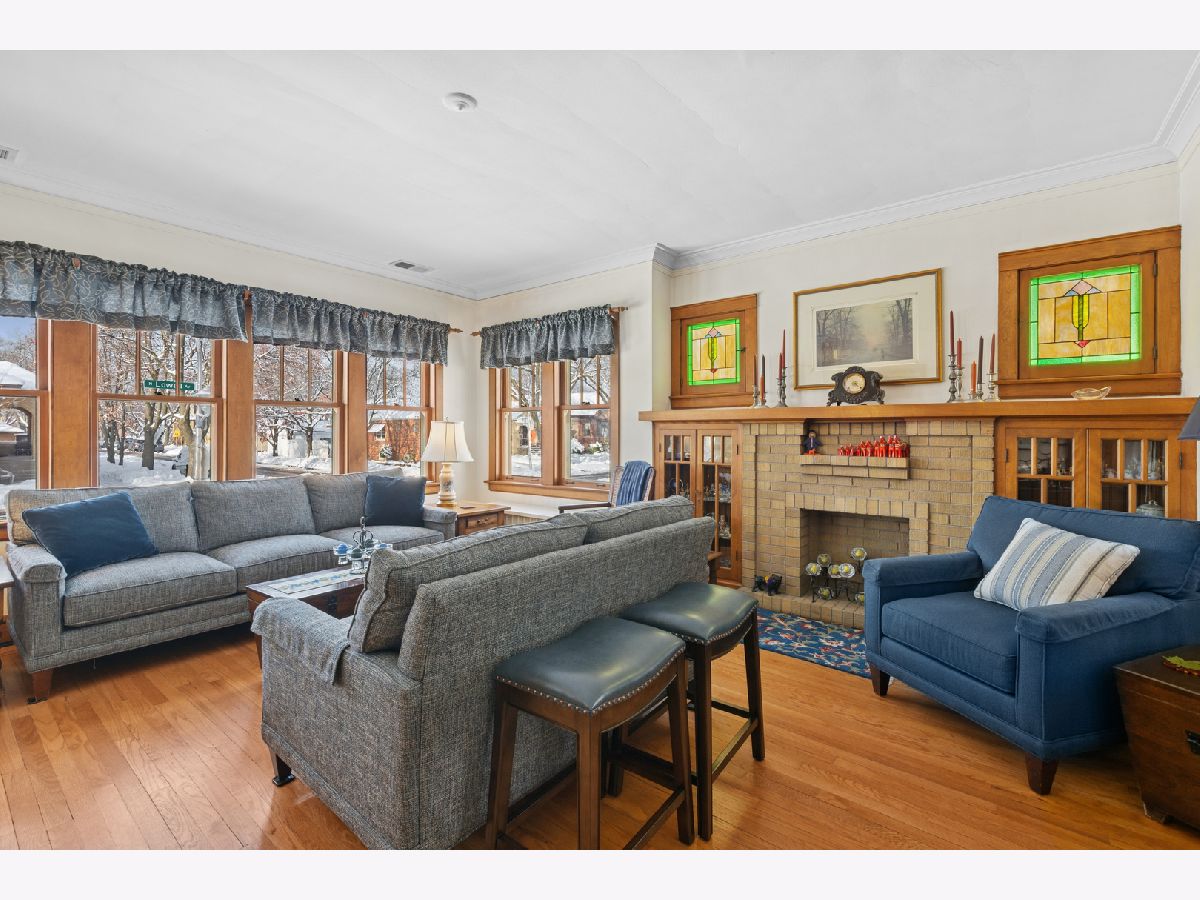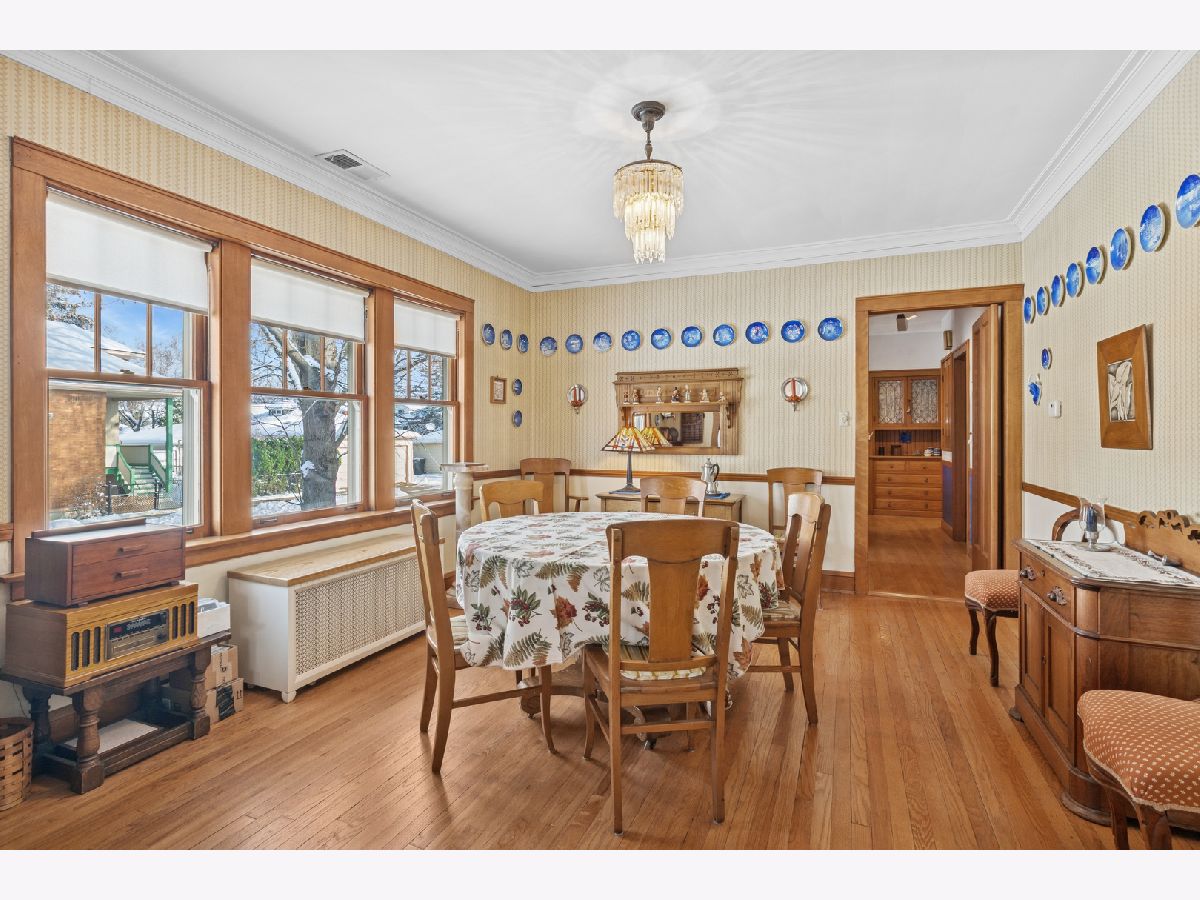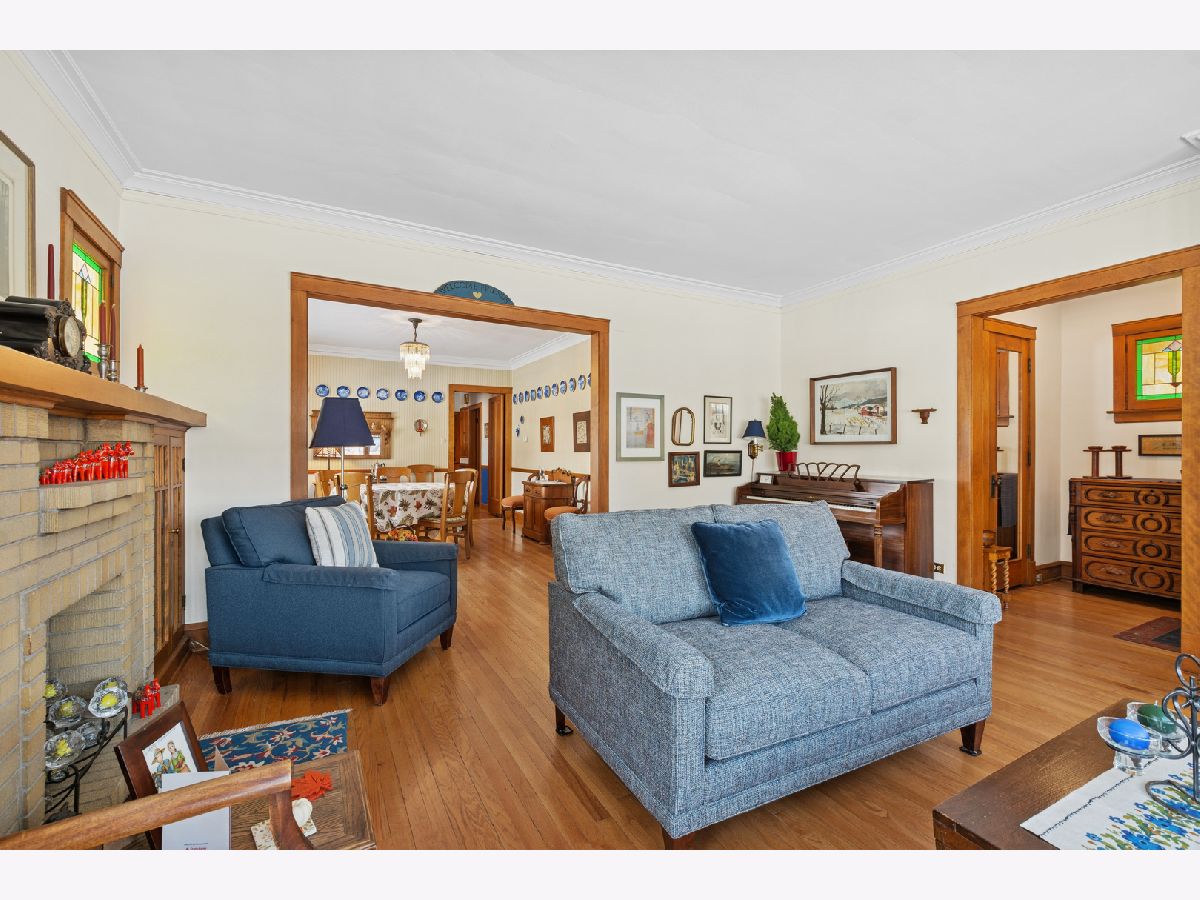 Discover this sunny, lovingly-maintained North Mayfair brick bungalow nestled on a corner lot on a picturesque tree-lined street. Step into the entry foyer with coat closet and you'll be greeted by the home's gorgeous woodwork and the light streaming through captivating (and operable) stained glass windows. The living room is anchored by a charming decorative fireplace, perfectly flanked by shelves, offering an elegant focal point. The oak kitchen features a built-in hutch and plenty of workspace. The adjacent sunroom/den provides a tranquil retreat, offering lovely views of the backyard, which blooms with colorful perennials. Step outside to enjoy the deck, complete with a moveable sunshade for indoor/outdoor living. Three bedrooms and one full bath on the main level create an ideal floorplan. The home's generous lower level offers a full bathroom, a large family room, a workshop and a laundry room, plus tons of storage space. For future expansion, a huge and high unfinished attic awaits your vision. Completing this fantastic property is a newer garage, adding convenience and value. This is a rare opportunity to own a charming, well-preserved home with incredible curb appeal in a highly sought-after neighborhood with room to grow.