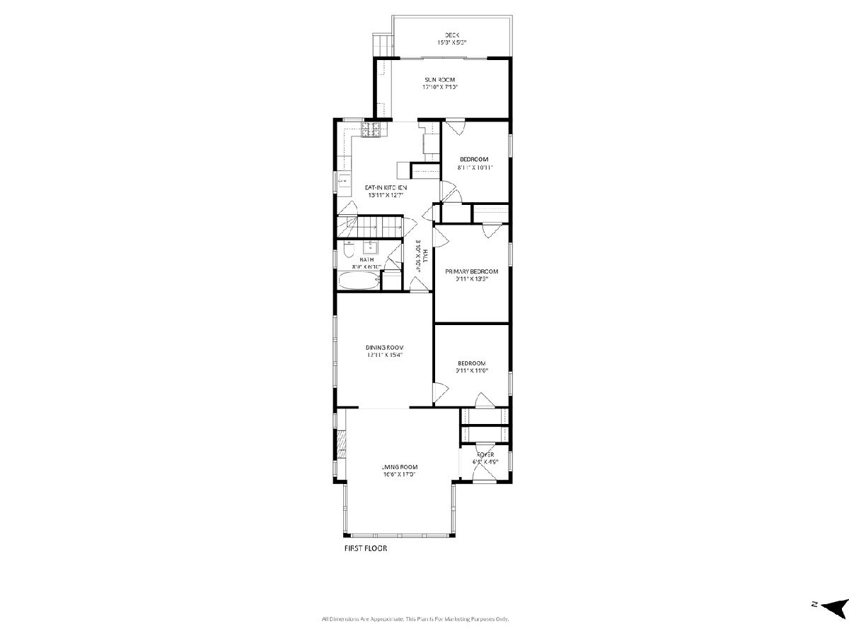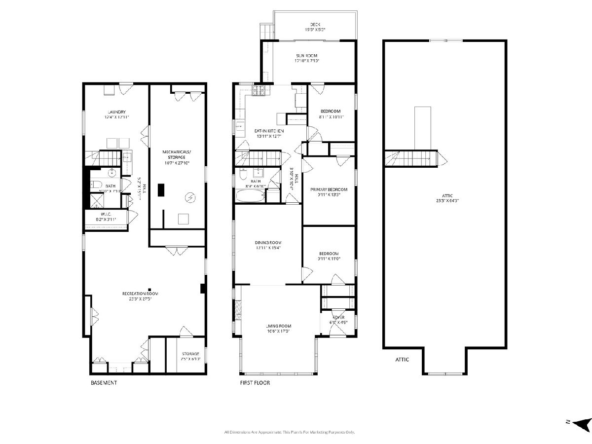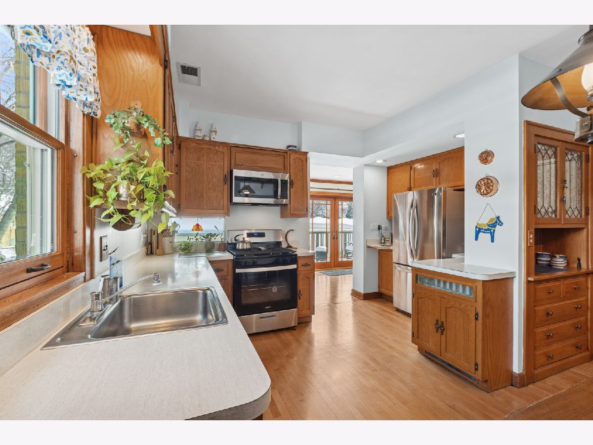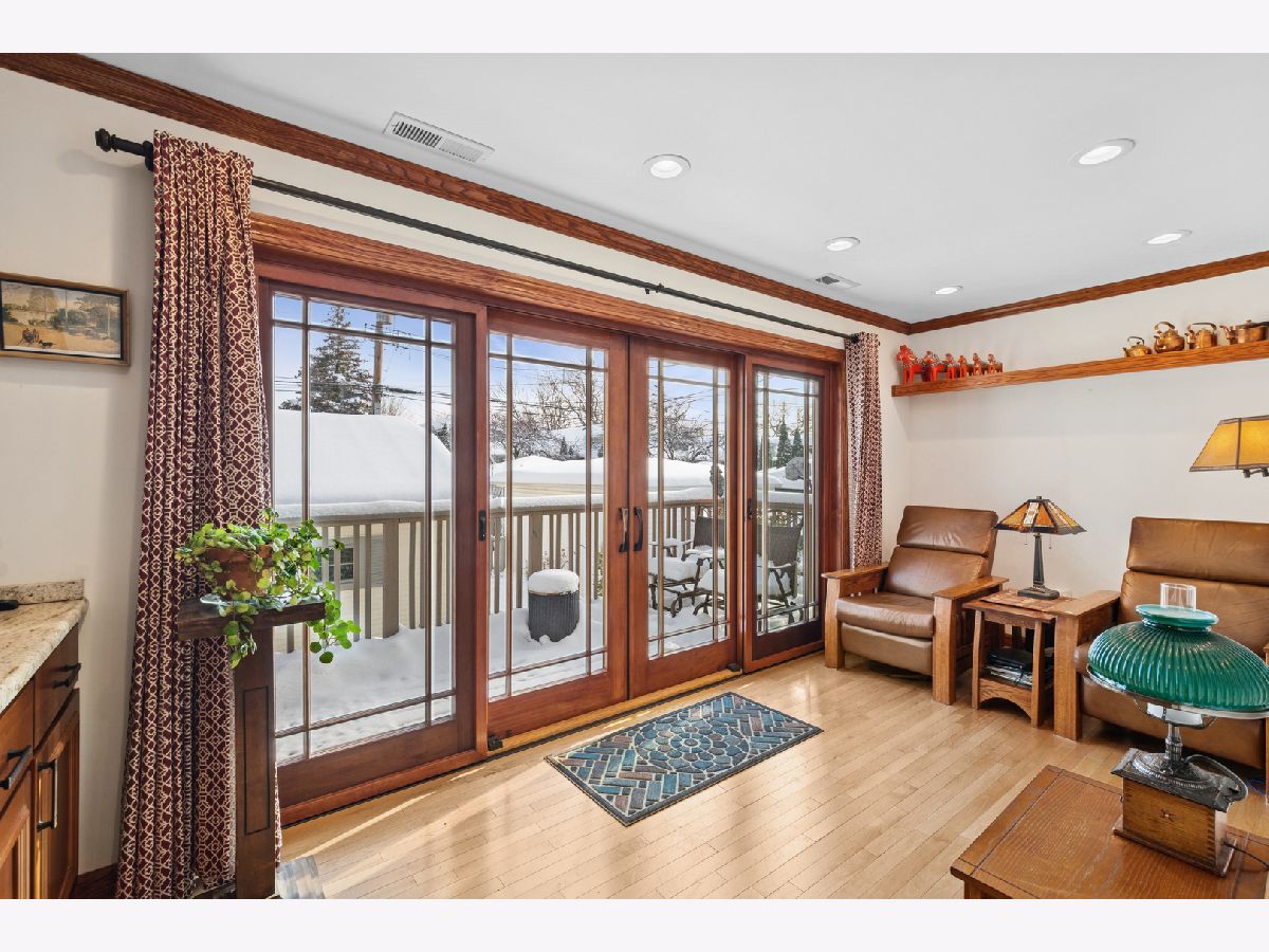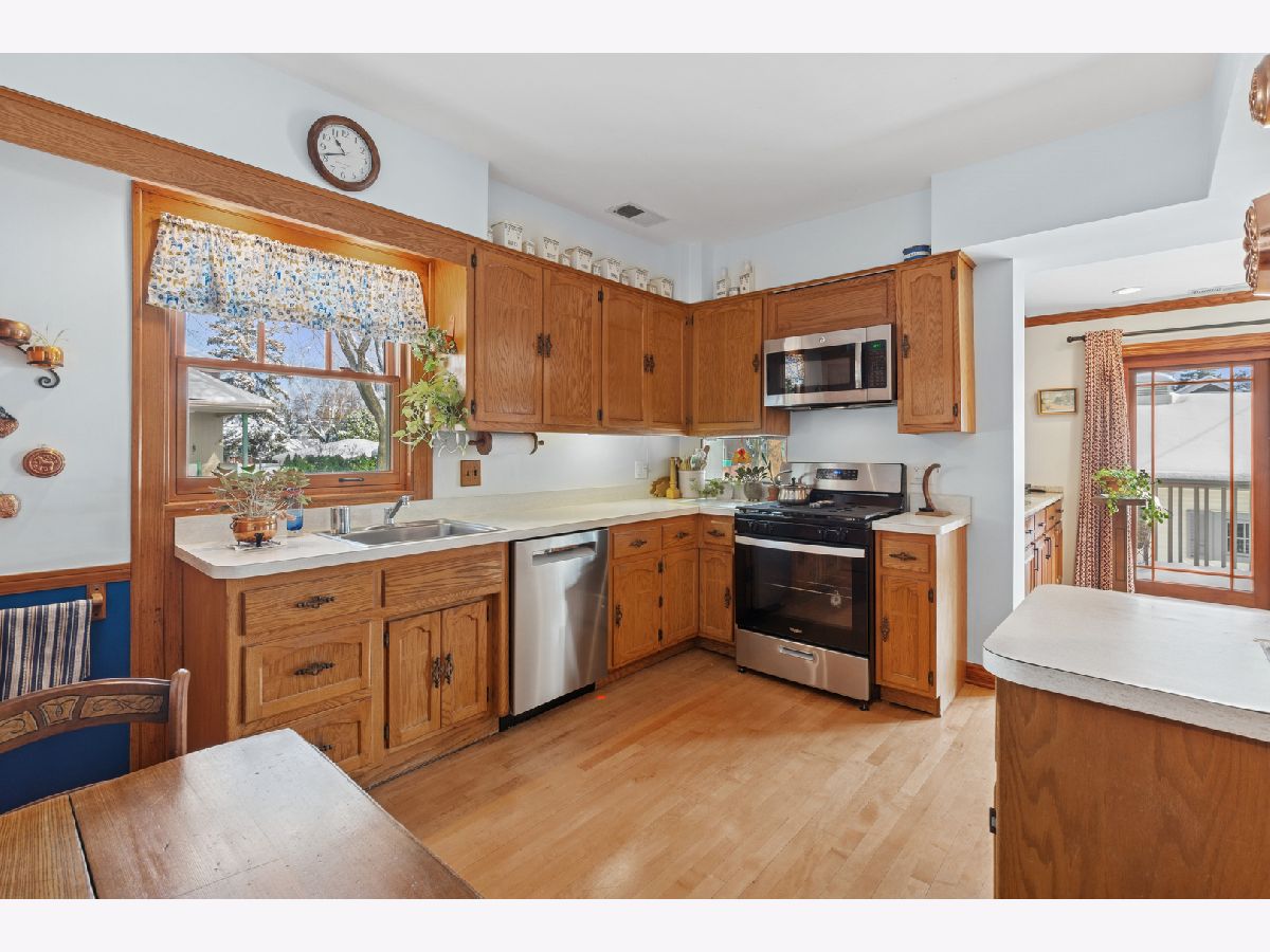 Discover this sunny, lovingly-maintained North Mayfair brick bungalow nestled on a corner lot on a picturesque tree-lined street. Step into the entry foyer with coat closet and you'll be greeted by the home's gorgeous woodwork and the light streaming through captivating (and operable) stained glass windows. The living room is anchored by a charming decorative fireplace, perfectly flanked by shelves, offering an elegant focal point. The oak kitchen features a built-in hutch and plenty of workspace. The adjacent sunroom/den provides a tranquil retreat, offering lovely views of the backyard, which blooms with colorful perennials. Step outside to enjoy the deck, complete with a moveable sunshade for indoor/outdoor living. Three bedrooms and one full bath on the main level create an ideal floorplan. The home's generous lower level offers a full bathroom, a large family room, a workshop and a laundry room, plus tons of storage space. For future expansion, a huge and high unfinished attic awaits your vision. Completing this fantastic property is a newer garage, adding convenience and value. This is a rare opportunity to own a charming, well-preserved home with incredible curb appeal in a highly sought-after neighborhood with room to grow.