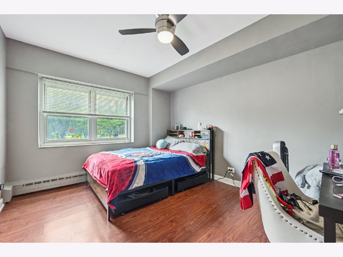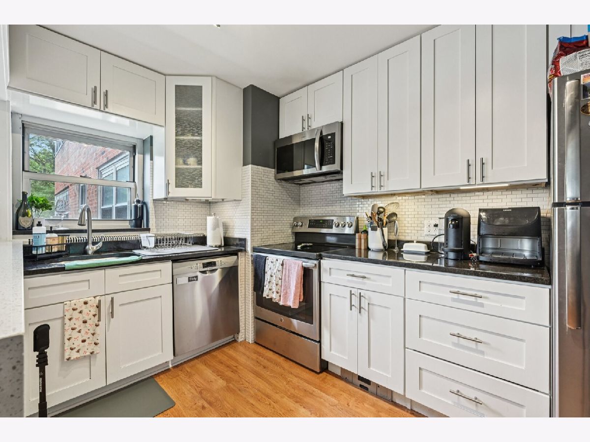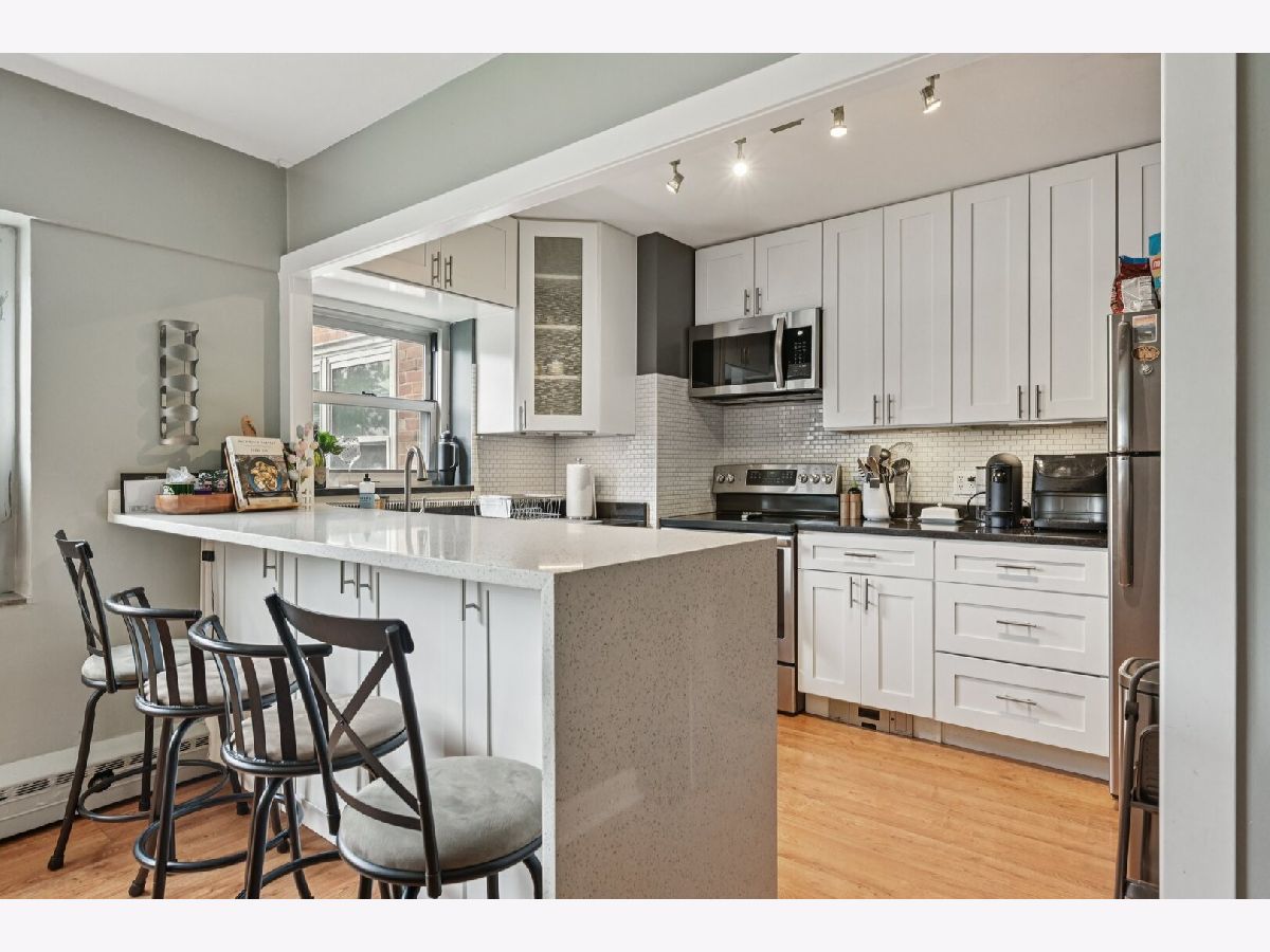 Enjoy lakefront living in this beautifully updated two bedroom condo, just steps from the park, beaches, and scenic trails! The renovated kitchen features 42" white shaker cabinets with soft-close doors, granite counters, a quartz waterfall peninsula and stainless steel appliances. The modern bathroom includes a tiled walk-in shower with rain shower head and handheld, built-in bench, quartz counters and Grohe fixtures! Additional features include wood laminate flooring throughout, dimmable lighting, modern ceiling fans in both bedrooms, and a second A/C unit in the primary bedroom to keep the home cool during Chicago summers. The unit includes one heated underground valet parking space. This pet-friendly, well-maintained building offers top amenities including 24-hour door staff, renovated laundry facilities with app-enabled machines, fitness center, business center, bike rooms, and on-site management. Located across from Margate Park with easy access to the lakefront path, beaches, restaurants, nightlife, and grocery stores. Express buses stop in front of the building, and the CTA Red Line is just three blocks away. Come check it out today!
