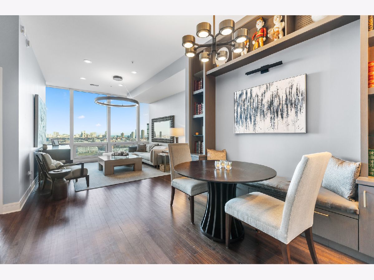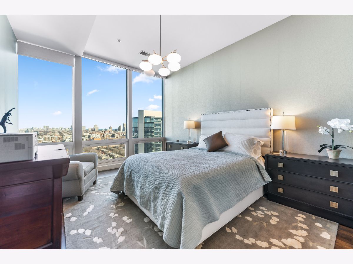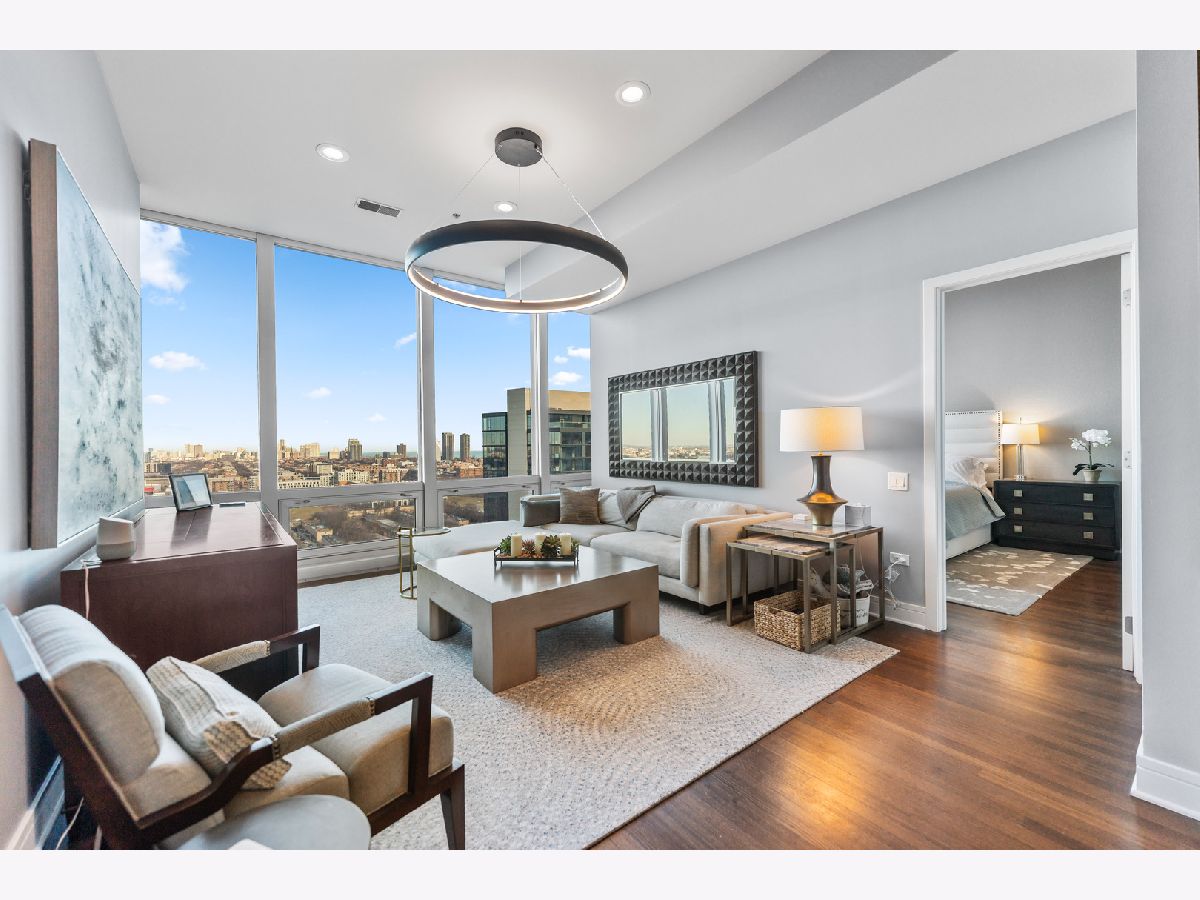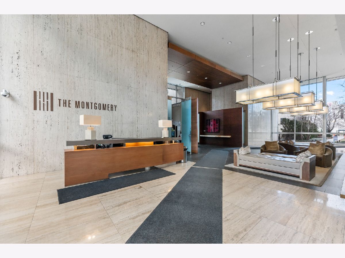 This exquisite 3-bedroom, 2.1-bath residence at The Montgomery offers refined modern luxury with expansive north-facing city views and glimpses of Lake Michigan beyond. Exceptionally high ceilings, floor-to-ceiling windows, and solid concrete construction create a remarkably quiet, light-filled living environment. Since 2017, the seller has made significant improvements throughout the home. The fully renovated kitchen features all-new custom cabinetry, appliances, and fixtures, the removal of a hallway wall to enhance flow, and a dramatic waterfall countertop. Built-in dining cabinetry with integrated lighting adds both function and architectural interest. Additional updates include refinished and re-stained hardwood floors, wood flooring added to all three bedrooms, glass transom to 3rd bedroom, new designer lighting throughout and extensive custom storage. The spacious primary suite is a true retreat with amazing North views, offering generous custom closets by Closet Works and a spa-like renovated bath with a fully tiled walk-in shower. The second bedroom, with floor-to-ceiling windows, is well-sized and privately situated. The fully enclosed third bedroom-currently styled as a den- maintains natural light while providing privacy, along with a very large closet and excellent storage. The second full bath has been fully updated including flooring, along with the updated powder room and in-unit laundry to complete the unit. The Montgomery is one of River North's most distinguished full-service luxury buildings, known for its architectural pedigree, high service level, and exceptional management with long-term door and maintenance staff. Amenities include 24-hour door staff, on-site management and maintenance, fitness center, party room, bike room, additional storage, and beautifully maintained common areas, including a landscaped "north lawn" with seating areas, grills, and fire pits. The building is pet-friendly, including large dogs, and features a private, secure dog run-one of the largest in the city. Ideally located to the Loop, Chicago Riverwalk, Michigan Avenue, Montgomery Park, and neighborhood favorites including East Bank Club, BIAN private club, Target, Mariano's, Whole Foods, AMC and premier dining-this is modernist luxury living at its finest. Attached garage parking available for $35,000.