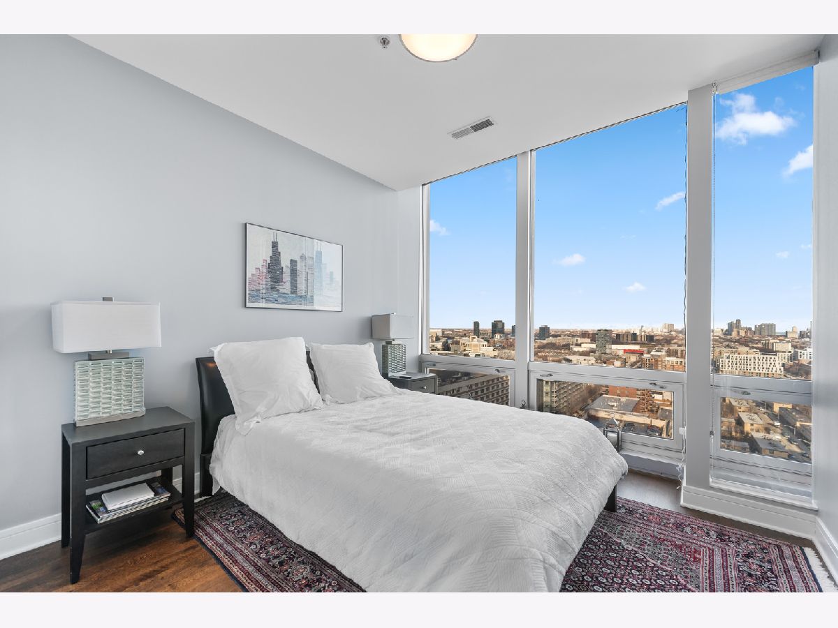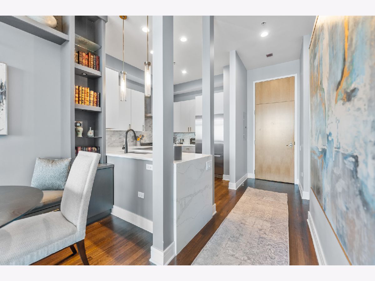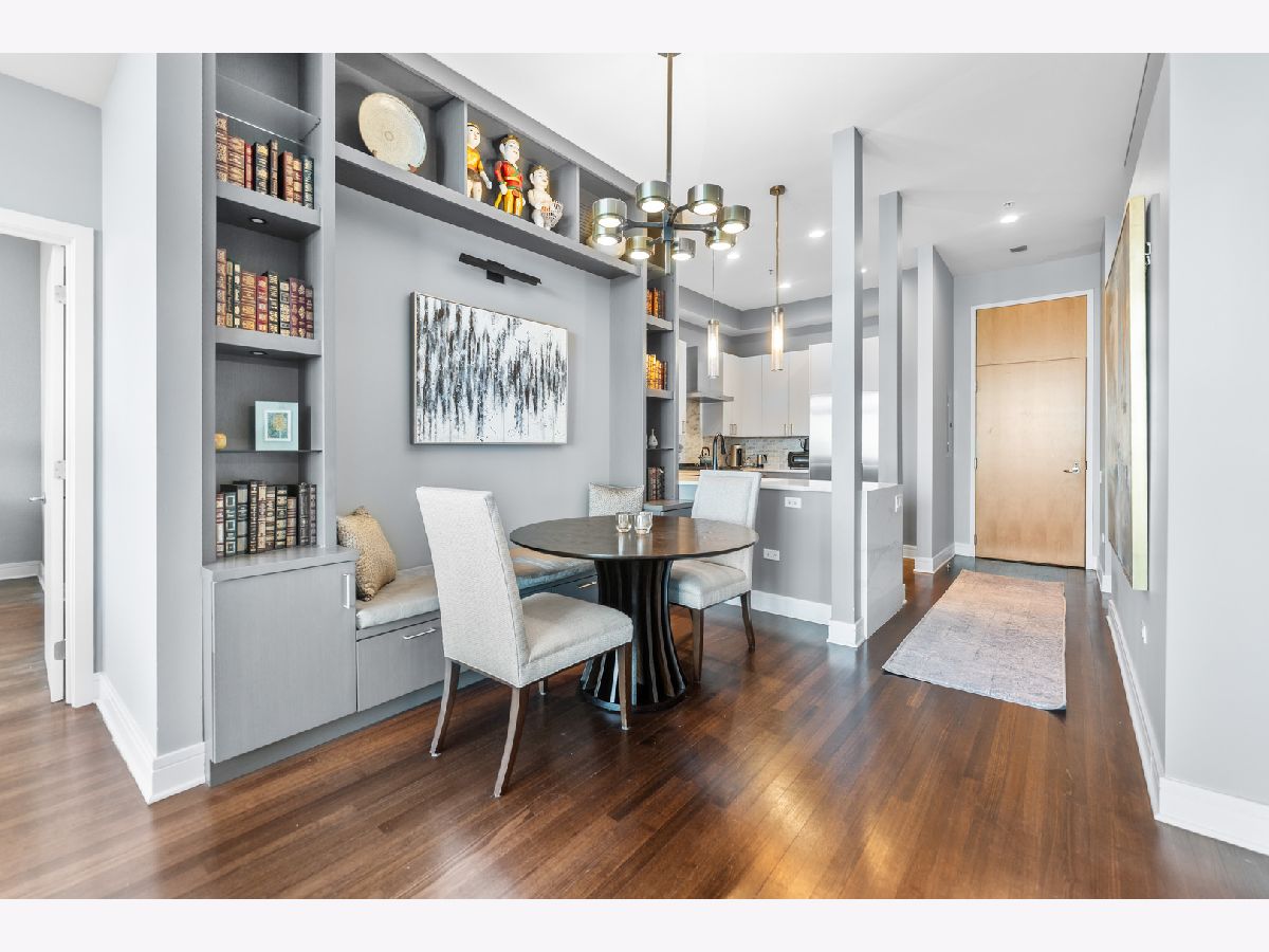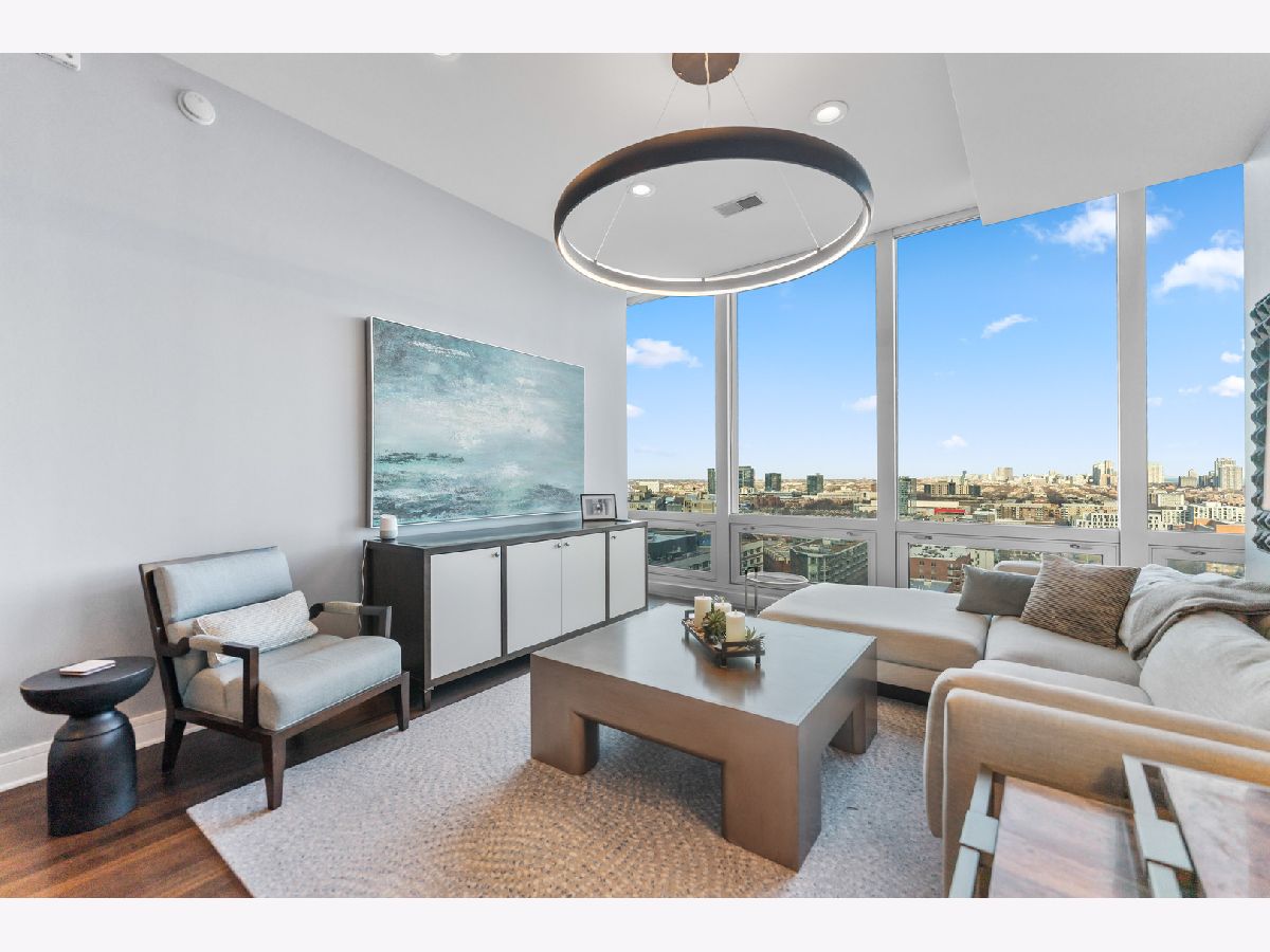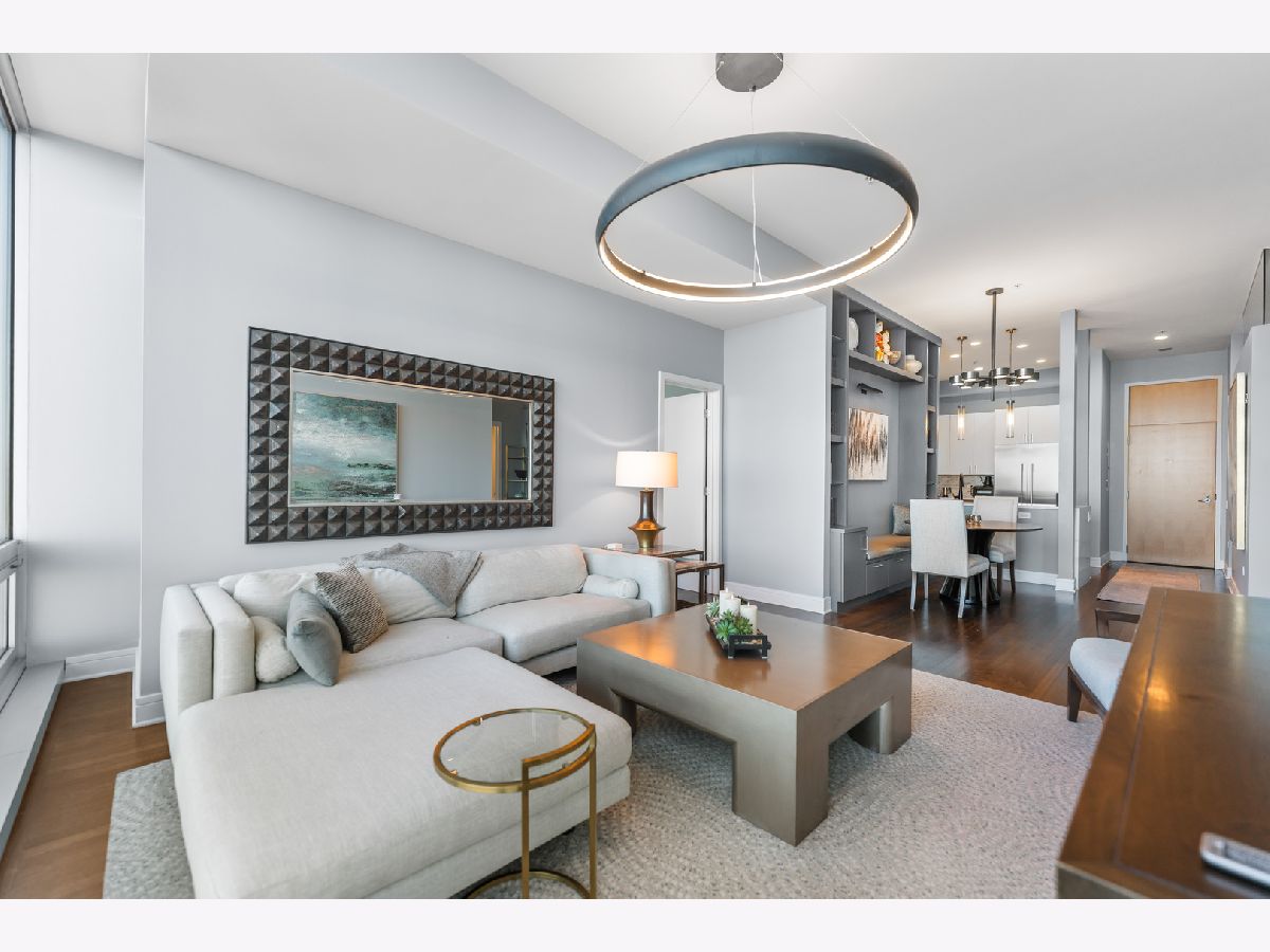This exquisite 3-bedroom, 2.1-bath residence at The Montgomery offers refined modern luxury with expansive north-facing city views and glimpses of Lake Michigan beyond. Exceptionally high ceilings, floor-to-ceiling windows, and solid concrete construction create a remarkably quiet, light-filled living environment. Since 2017, the seller has made significant improvements throughout the home. The fully renovated kitchen features all-new custom cabinetry, appliances, and fixtures, the removal of a hallway wall to enhance flow, and a dramatic waterfall countertop. Built-in dining cabinetry with integrated lighting adds both function and architectural interest. Additional updates include refinished and re-stained hardwood floors, wood flooring added to all three bedrooms, glass transom to 3rd bedroom, new designer lighting throughout and extensive custom storage. The spacious primary suite is a true retreat with amazing North views, offering generous custom closets by Closet Works and a spa-like renovated bath with a fully tiled walk-in shower. The second bedroom, with floor-to-ceiling windows, is well-sized and privately situated. The fully enclosed third bedroom-currently styled as a den- maintains natural light while providing privacy, along with a very large closet and excellent storage. The second full bath has been fully updated including flooring, along with the updated powder room and in-unit laundry to complete the unit. The Montgomery is one of River North's most distinguished full-service luxury buildings, known for its architectural pedigree, high service level, and exceptional management with long-term door and maintenance staff. Amenities include 24-hour door staff, on-site management and maintenance, fitness center, party room, bike room, additional storage, and beautifully maintained common areas, including a landscaped "north lawn" with seating areas, grills, and fire pits. The building is pet-friendly, including large dogs, and features a private, secure dog run-one of the largest in the city. Ideally located to the Loop, Chicago Riverwalk, Michigan Avenue, Montgomery Park, and neighborhood favorites including East Bank Club, BIAN private club, Target, Mariano's, Whole Foods, AMC and premier dining-this is modernist luxury living at its finest. Attached garage parking available for $35,000.