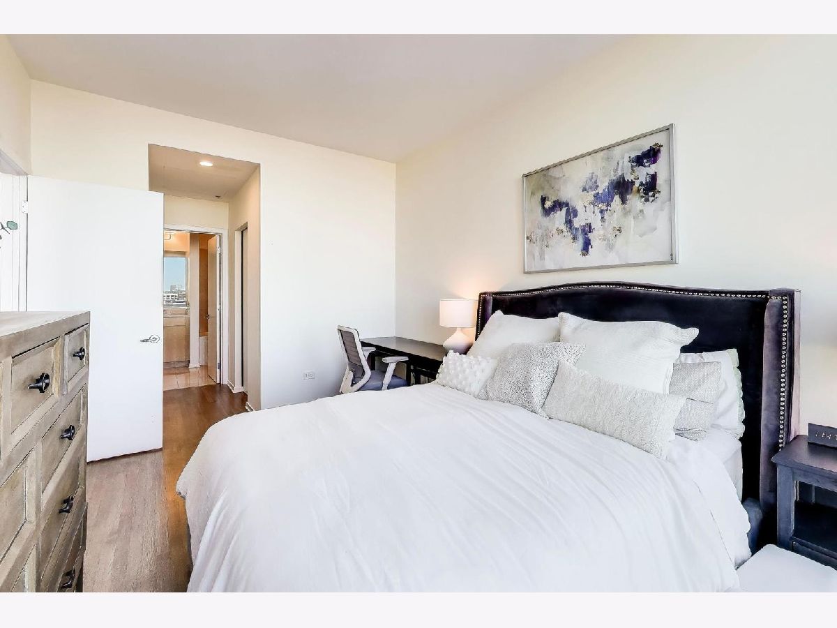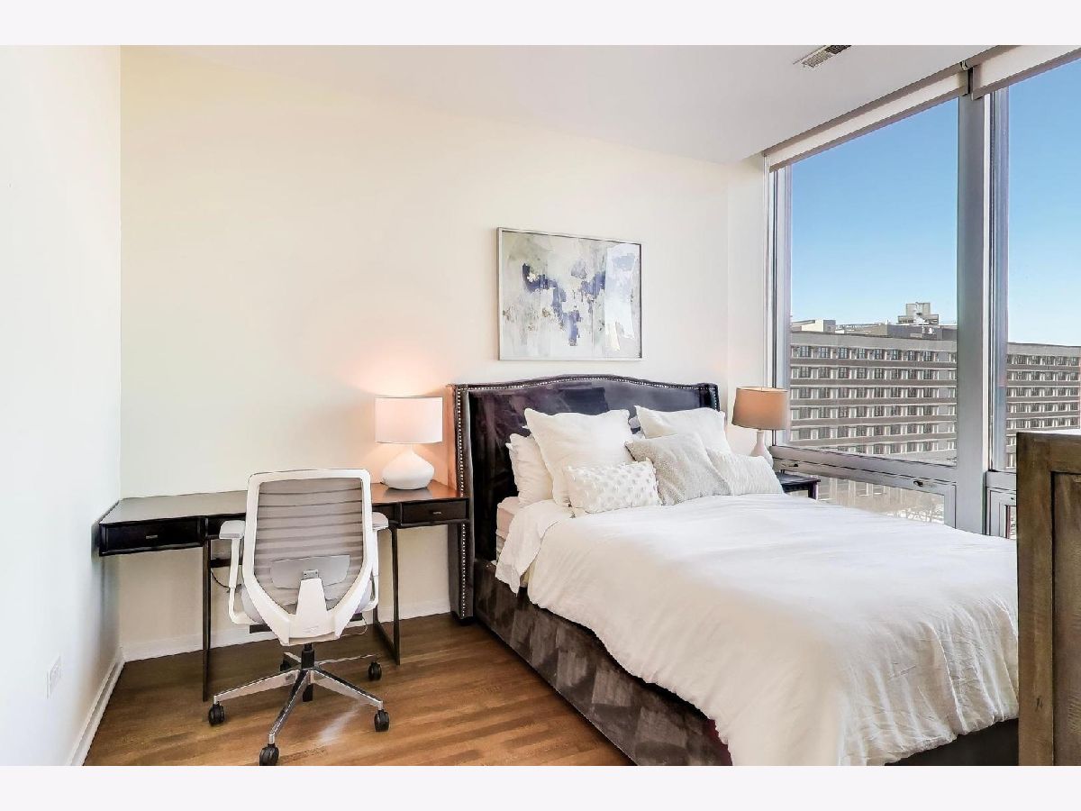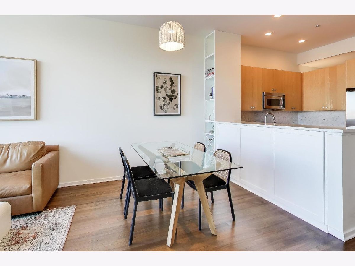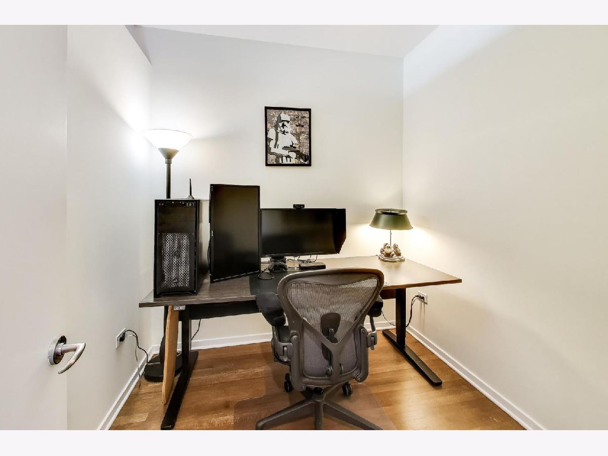 Premier 2 bed/1.1 bath condo in River North's highly sought after Montgomery. This home has been lived in delicately. Gleaming refinished hardwood floors throughout, refreshed lighting, & window treatments. Light abounds through the floor-to-ceiling windows. Masterful kitchen update with Bosch/Kitchen-Aid/Jenn-Air appliances, white quartz counters, marble backsplash custom builtin wine rack and additional storage cabinets. A primary suite with two customized closets and proper marble bathroom. Scaled vanity, linen closet and soaking tub. A second bedroom that is the perfect work from home space, den/ nursery or guests suite with custom built-ins. The Montgomery is a full-service amenity building w/24-hour door-staff, on-site management, state-of-the-art gym, in-unit package delivery service, dry-cleaner, rear patio w/fire pits & grilling stations, private dog run, & roof top deck, with incredible views of the city and an herb garden In-unit laundry and an additional storage locker included.Deeded parking is an additional $35k.