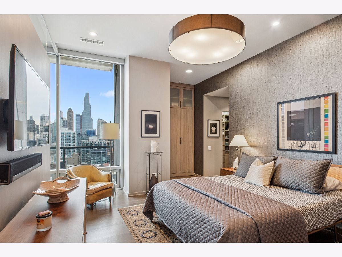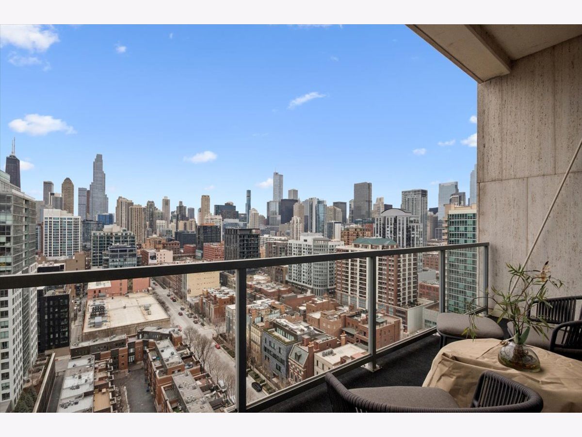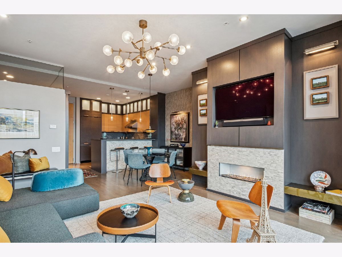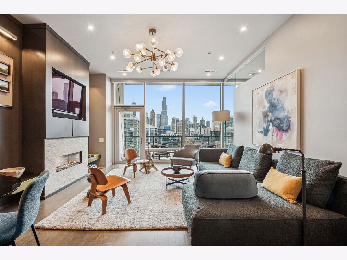 This stunning home at the iconic Minoru Yamasaki-designed "Montgomery" is a 2BR 2BA condominium in the quieter section of River North. The Unit boasts a rare and exclusive East-facing balcony with breathtaking skyline views at sunrise and sunset, visible through floor-to-ceiling windows. This unit has been extensively renovated and professionally designed. White oak floors grace the beautiful space and lead to a custom-designed media wall, gas fireplace, and TV niche with Sonos speakers. Warm, custom lighting illuminates the home, welcoming you after a long day of enjoying the heart of River North. The exquisitely renovated kitchen charms with sleek soapstone countertops and backsplash, custom cabinets, stainless steel Thermador appliances and hood, and a wood-paneled fridge. A custom bar and wine fridge, tastefully hidden in a stylish cabinet, punctuates this chef's kitchen. The spacious primary suite features two walk-in closets and a stunning floor to ceiling built-in wardrobe, along with a luxurious spa-like bath with a six foot soaking tub, separate shower, double vanity and large linen closet. A guest bedroom and bath complete this elegant Unit, along with more than ample custom closets and storage. There are absolutely NO common shared walls, creating a quiet and private living space. The Unit includes TWO parking spaces on the most desirable Level 2 of the heated garage! The "Montgomery" is an extremely well managed building with substantial reserves. In addition to the roof-top space, spectacular for viewing July 4 fireworks and the Air and Water Show, owners can enjoy the "North Lawn" outfitted with lounge areas, table seating, fire pits, and BBQ grills. Assessments include owner-controlled heat and air conditioning, cable TV and all but a small monthly electric bill. Visit this warm and inviting home in close proximity and with easy access to everything the City has to offer!