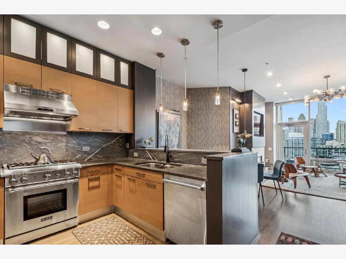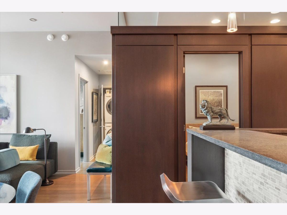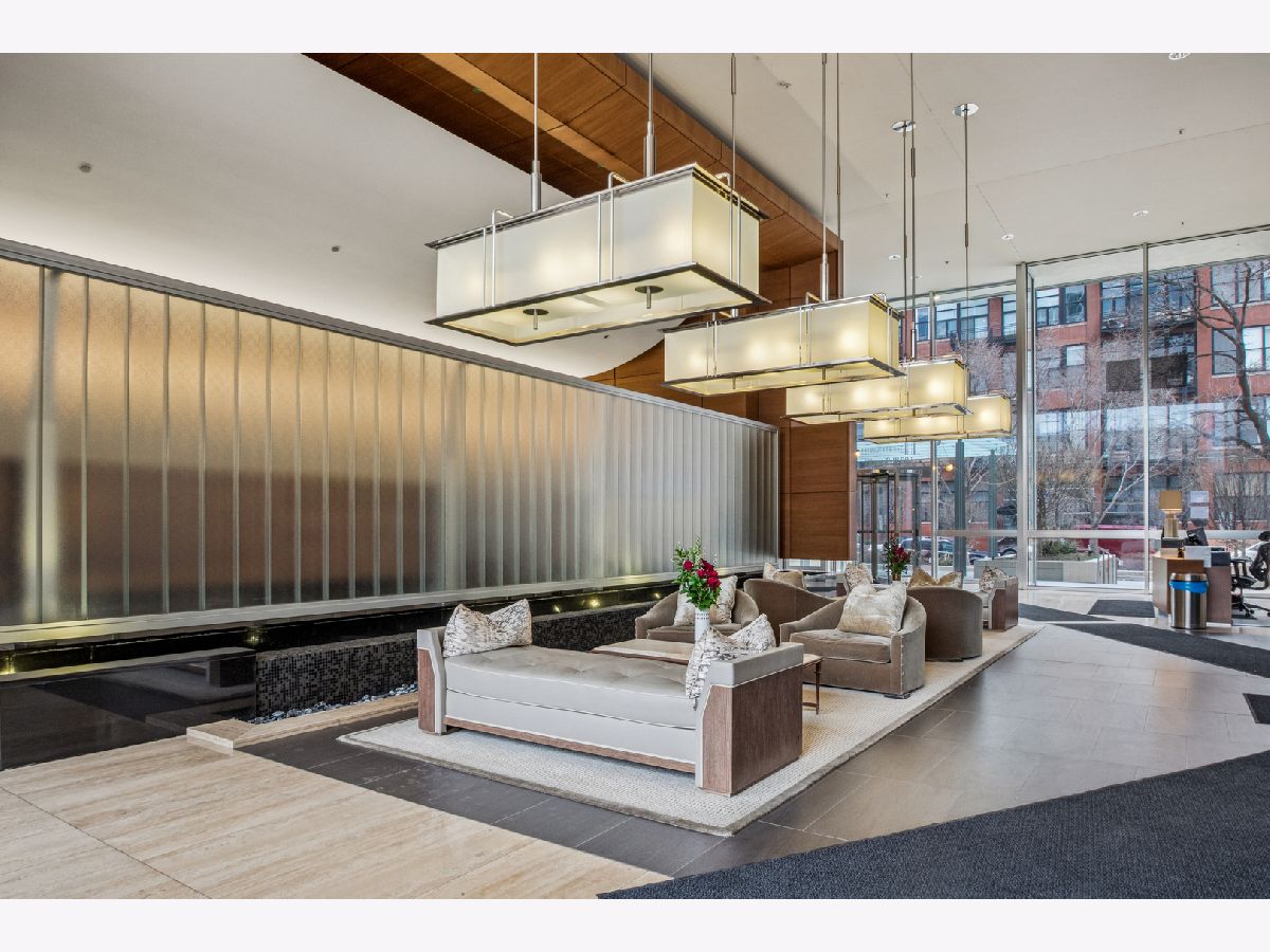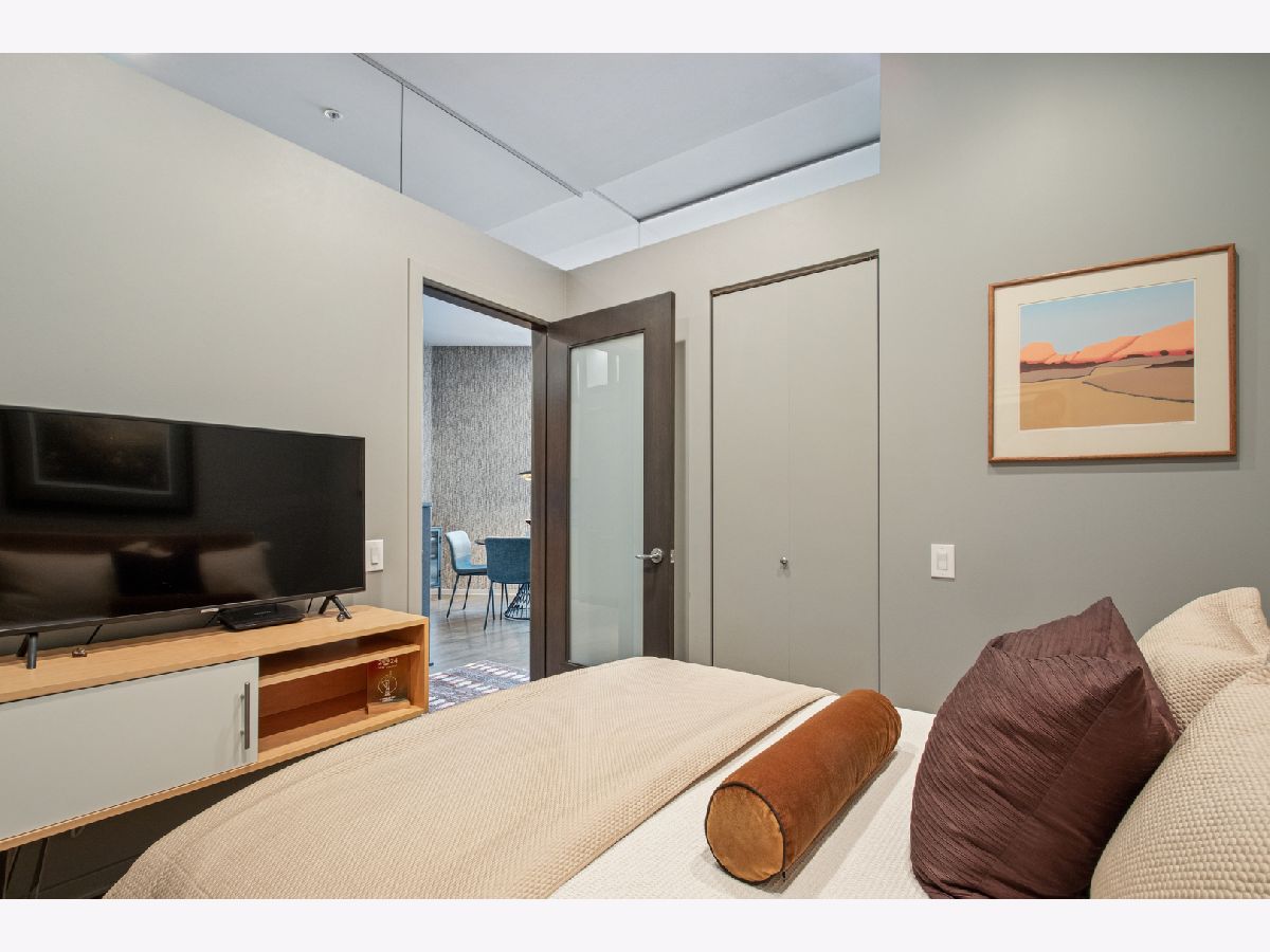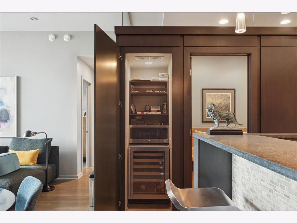 This stunning home at the iconic Minoru Yamasaki-designed "Montgomery" is a 2BR 2BA condominium in the quieter section of River North. The Unit boasts a rare and exclusive East-facing balcony with breathtaking skyline views at sunrise and sunset, visible through floor-to-ceiling windows. This unit has been extensively renovated and professionally designed. White oak floors grace the beautiful space and lead to a custom-designed media wall, gas fireplace, and TV niche with Sonos speakers. Warm, custom lighting illuminates the home, welcoming you after a long day of enjoying the heart of River North. The exquisitely renovated kitchen charms with sleek soapstone countertops and backsplash, custom cabinets, stainless steel Thermador appliances and hood, and a wood-paneled fridge. A custom bar and wine fridge, tastefully hidden in a stylish cabinet, punctuates this chef's kitchen. The spacious primary suite features two walk-in closets and a stunning floor to ceiling built-in wardrobe, along with a luxurious spa-like bath with a six foot soaking tub, separate shower, double vanity and large linen closet. A guest bedroom and bath complete this elegant Unit, along with more than ample custom closets and storage. There are absolutely NO common shared walls, creating a quiet and private living space. The Unit includes TWO parking spaces on the most desirable Level 2 of the heated garage! The "Montgomery" is an extremely well managed building with substantial reserves. In addition to the roof-top space, spectacular for viewing July 4 fireworks and the Air and Water Show, owners can enjoy the "North Lawn" outfitted with lounge areas, table seating, fire pits, and BBQ grills. Assessments include owner-controlled heat and air conditioning, cable TV and all but a small monthly electric bill. Visit this warm and inviting home in close proximity and with easy access to everything the City has to offer!
