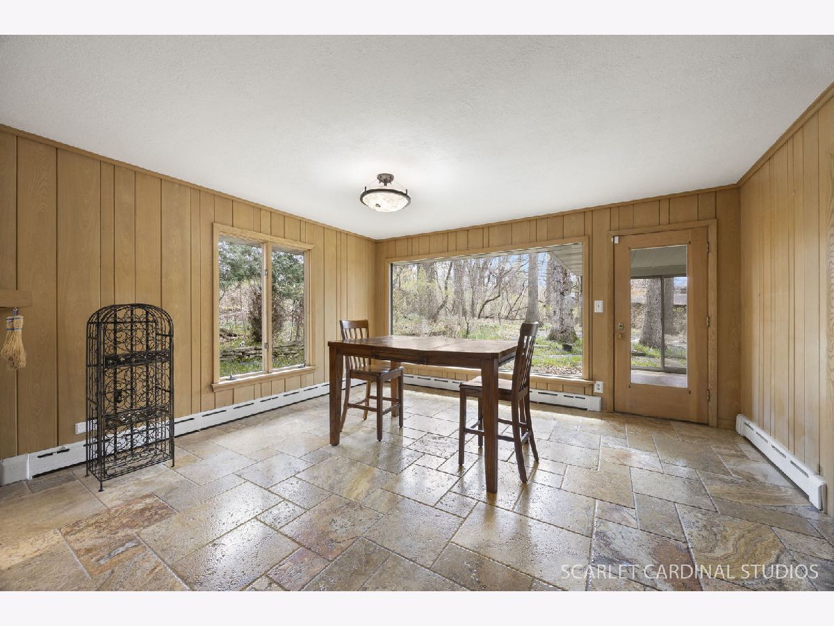 Location, location, location - without sacrificing privacy. Experience tranquility in this exceptional home set on a secluded, mature wooded half acre lot. Located 2 minutes from the Fox River walking/bike path and I-90. 25 minutes to O'Hare Airport and Woodfield Mall, the property sits elevated on a gentle hill, offering picturesque views of the professionally landscaped grounds. Both the front and backyard provide a peaceful, private retreat landscaping highlighted by a stunning, illuminated water fountain, creating a peaceful and picturesque setting day and night. Upon entering this solidly built beautiful home, you're welcomed by a spacious living room featuring a huge picture window. From there, you flow into the inviting family room and dining area surrounded by extra-large picture windows and a wood burning fireplace. The kitchen offers a charm with solid wood cabinets. There are plenty of storage areas as well as stainless steel appliances. The kitchen has an eating area with a large picture window overlooking the secluded rear yard, patio and custom fountain. Travertine and oak flooring add warmth and character throughout the home. A recently updated three season room offers an additional space to relax and enjoy the surrounding views. The main level primary bedroom provides generous space with walk in closet and is complemented by a newly renovated bathroom with a huge walk in shower, custom double sink vanity and a heated floor. This five bedroom home features two full baths that have been remodeled with high-end finishes. There are additional 1/2 baths located in the home. Upstairs, you'll find three sizable bedrooms with walk-in closets, along with a loft area. The second-floor bathroom has been remodeled and customized with an oversized champagne bubble bathtub. The finished basement includes a versatile living area, a large utility room, and a convenient half bath located off the laundry room. Another storage feature is the extra clean crawlspace. The home includes numerous updates, making it a comfortable and inviting place to relax and take in the scenery. Enjoy the surrounding nature year round-whether birdwatching or spotting deer that occasionally wander through the yard. The expanded two car garage provides extra storage. Just a short drive to downtown Dundee where you'll find shopping, dining and a quaint town. This home makes you feel like you're away on vacation, but you're really minutes away from everything.