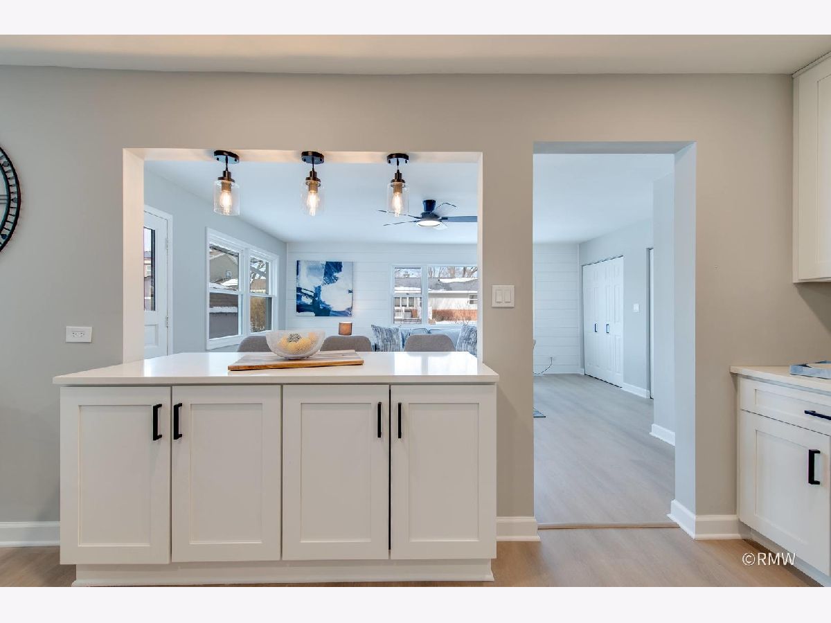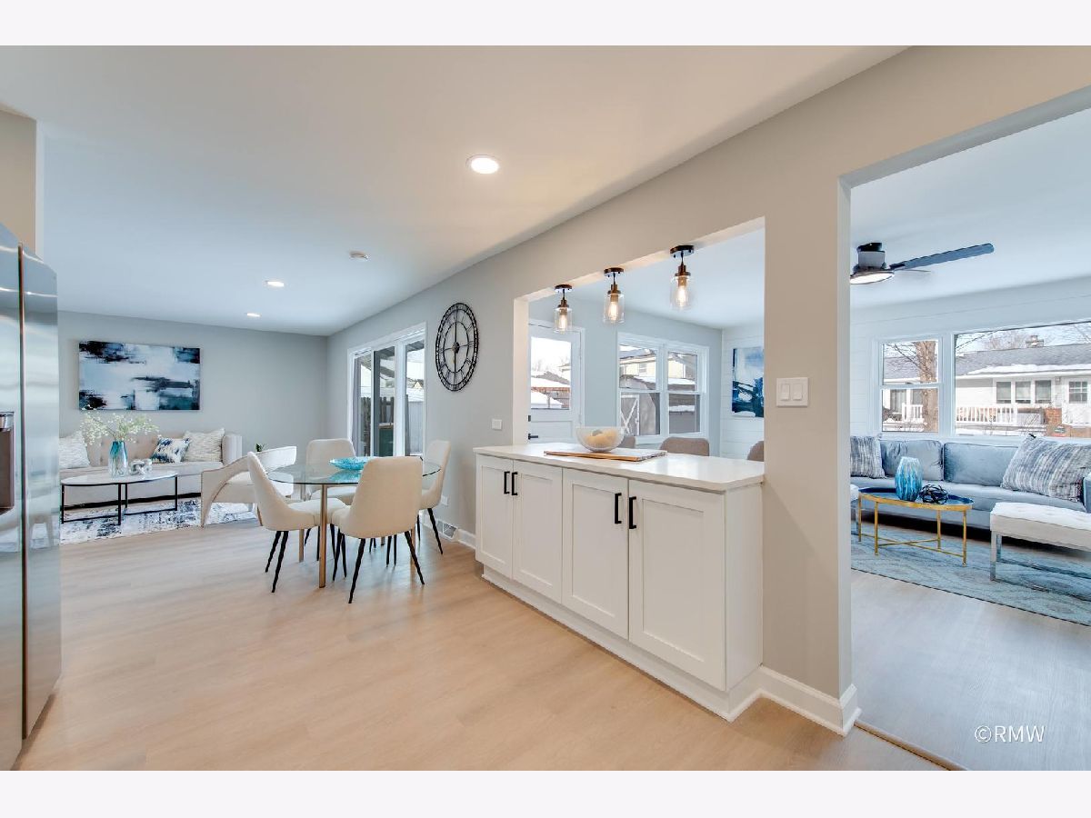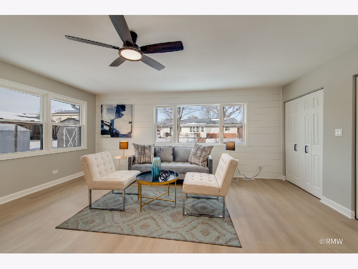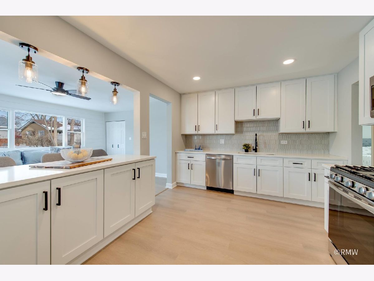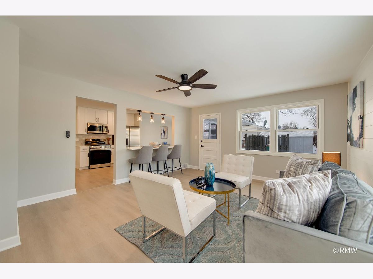 Absolutely stunning ranch home in a highly sought-after neighborhood just blocks from Busse Woods, area schools, and a vibrant new shopping area with a sky bridge. This beautifully updated home features an exceptional open-concept floor plan with the kitchen as the true centerpiece, seamlessly connecting the living and dining areas to the family room-perfect for both entertaining and everyday living. The expansive kitchen boasts 42" custom shaker cabinets, elegant Calacatta Marfil quartz countertops, stainless steel appliances, a gorgeous picket mosaic tile backsplash, a massive stainless-steel undermounted sink, and a generous breakfast bar accented by stylish pendant lighting. The inviting family room showcases a striking shiplap accent wall with built-in closets, offering abundant storage along with a convenient laundry area. Both bathrooms are thoughtfully designed with beautiful vanities and elegant tile finishes. All bedrooms are generously sized, with two featuring ceiling fans for added comfort. This home is light, bright, and modern, highlighted by a neutral color palette, oversized windows, and an impressive three-panel sliding glass door that floods the space with natural light. The front and backyard offer open, usable space complete with a patio, large storage sheds and huge concrete driveway. Truly turnkey and priced to move-this exceptional home will not last long!