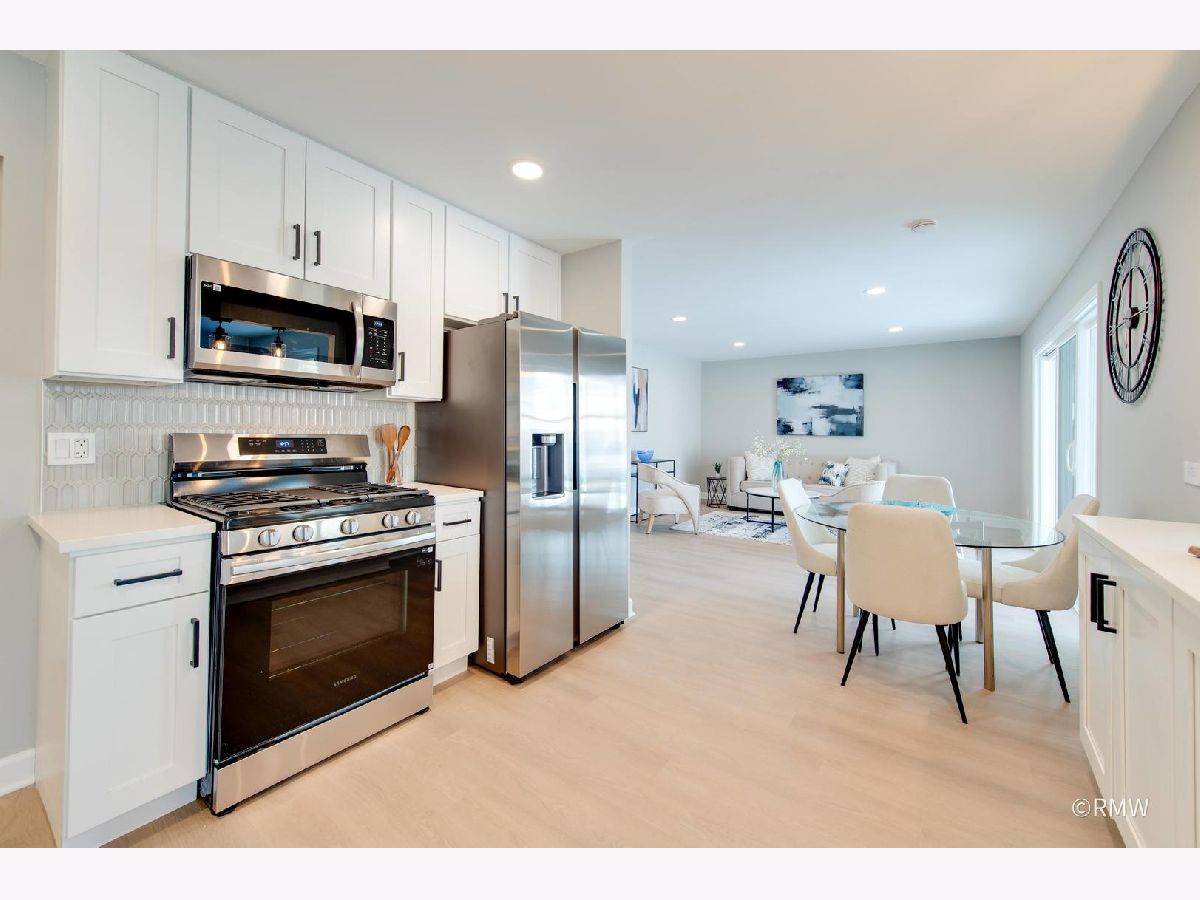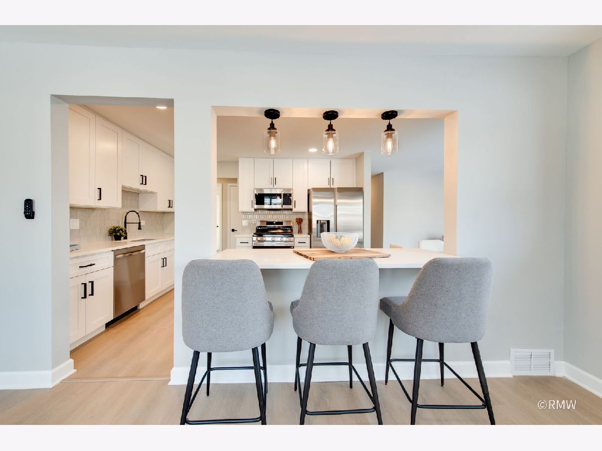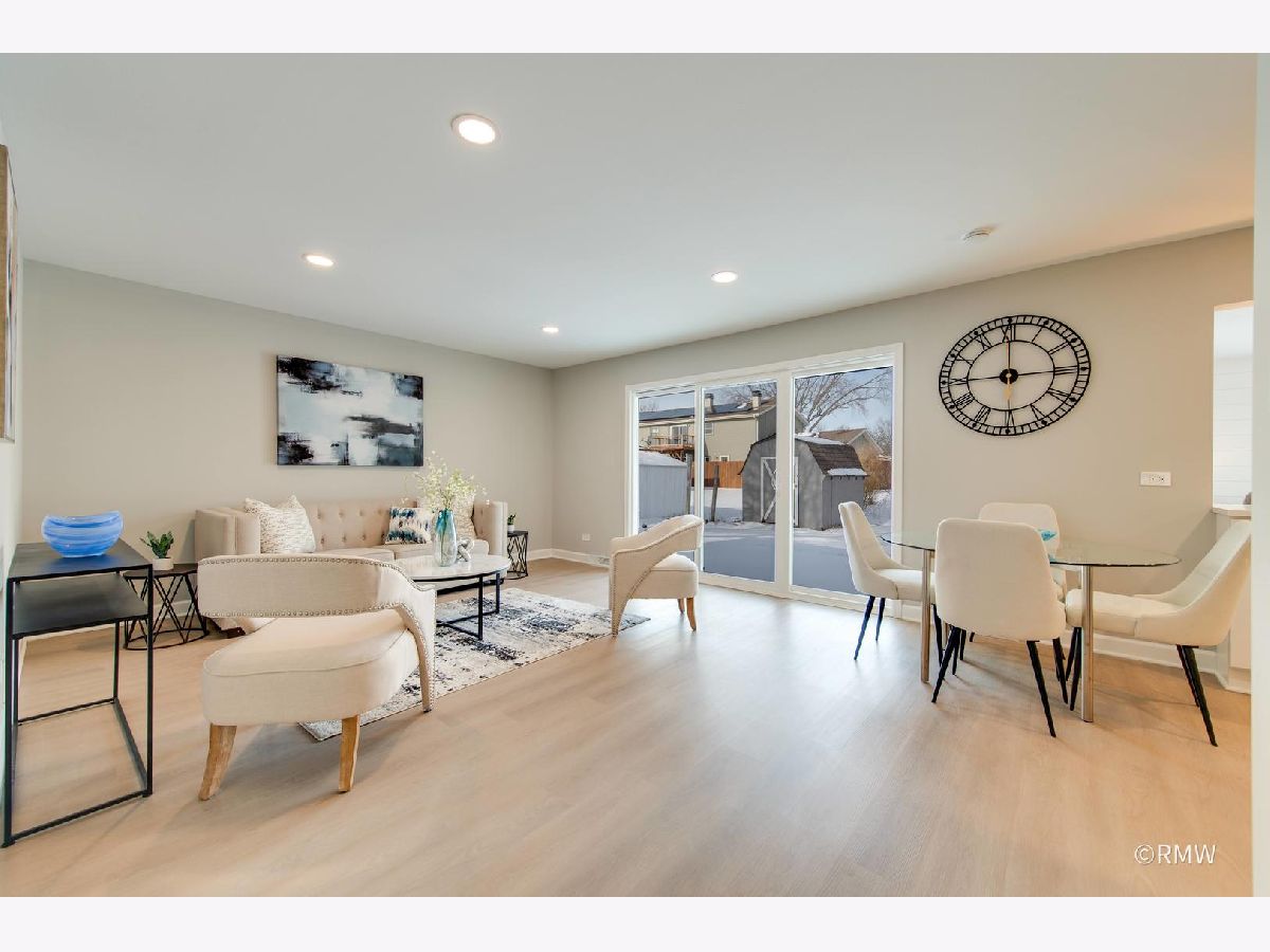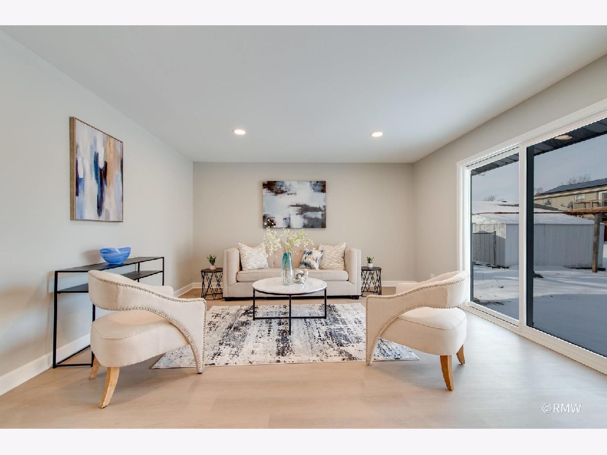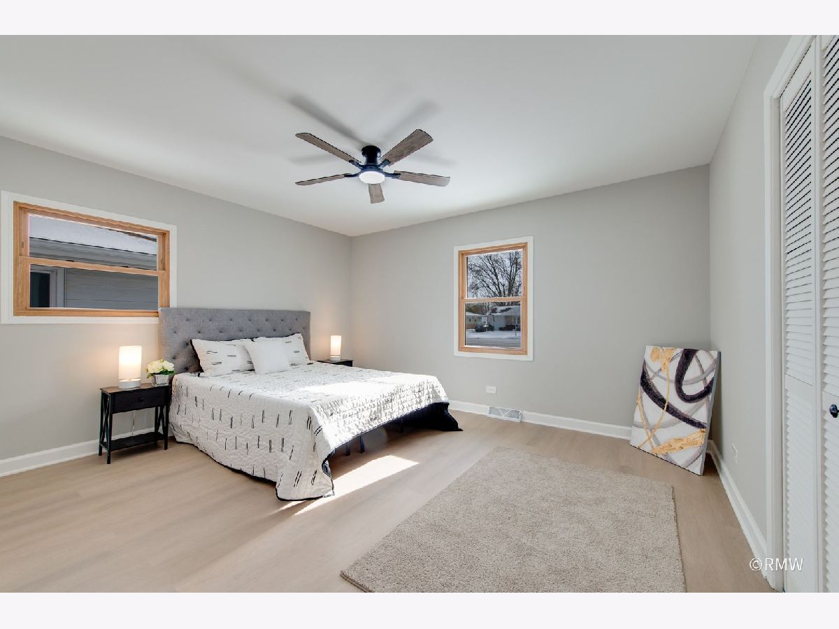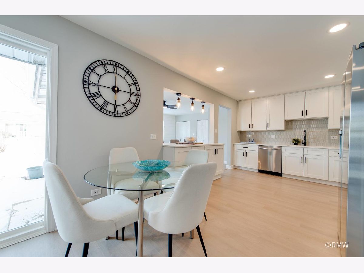 Absolutely stunning ranch home in a highly sought-after neighborhood just blocks from Busse Woods, area schools, and a vibrant new shopping area with a sky bridge. This beautifully updated home features an exceptional open-concept floor plan with the kitchen as the true centerpiece, seamlessly connecting the living and dining areas to the family room-perfect for both entertaining and everyday living. The expansive kitchen boasts 42" custom shaker cabinets, elegant Calacatta Marfil quartz countertops, stainless steel appliances, a gorgeous picket mosaic tile backsplash, a massive stainless-steel undermounted sink, and a generous breakfast bar accented by stylish pendant lighting. The inviting family room showcases a striking shiplap accent wall with built-in closets, offering abundant storage along with a convenient laundry area. Both bathrooms are thoughtfully designed with beautiful vanities and elegant tile finishes. All bedrooms are generously sized, with two featuring ceiling fans for added comfort. This home is light, bright, and modern, highlighted by a neutral color palette, oversized windows, and an impressive three-panel sliding glass door that floods the space with natural light. The front and backyard offer open, usable space complete with a patio, large storage sheds and huge concrete driveway. Truly turnkey and priced to move-this exceptional home will not last long!