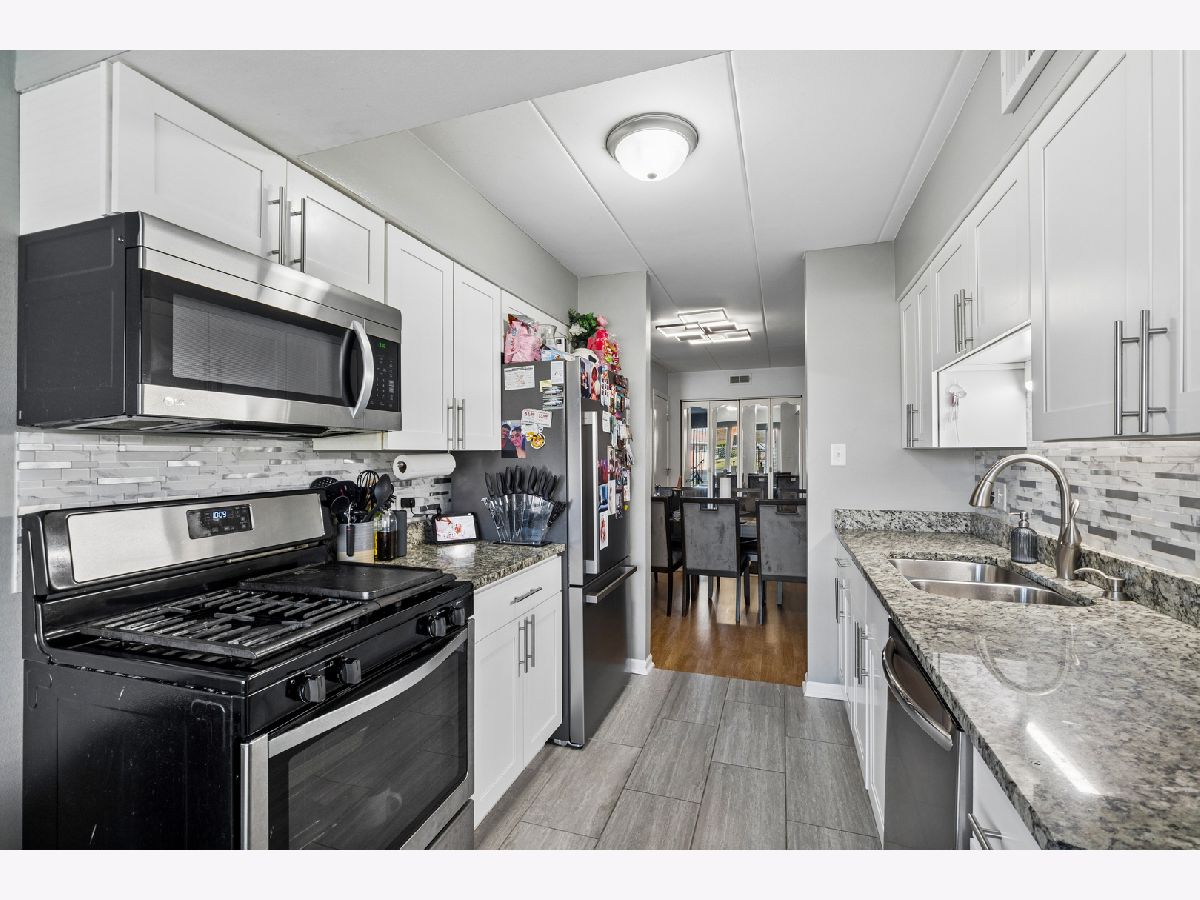 Just move into this updated 2 bedroom, 2 bath first floor condo! Remodeled kitchen boasts newer refrigerator and backsplash with granite counters and stainless steel appliances. Bay window streams in natural light adjacent to eating area and door going out to patio. Large living room has sliding patio doors and laminate wood flooring. Master bedroom has full private remodeled bath with shower and walk in closet. Second bedroom also boasts walk in closet. Main bath in hall has also been updated as well! In unit laundry includes new washer. Dedicated parking spot #171 and parking garage #71 with new insulated garage door! This condo is the perfect package!