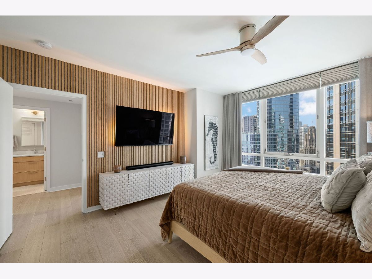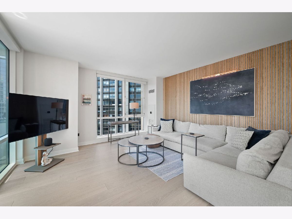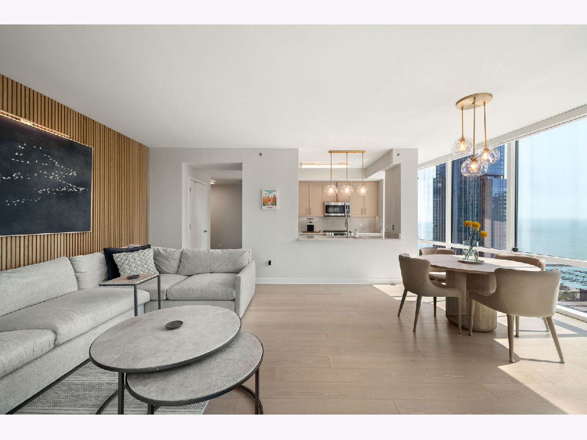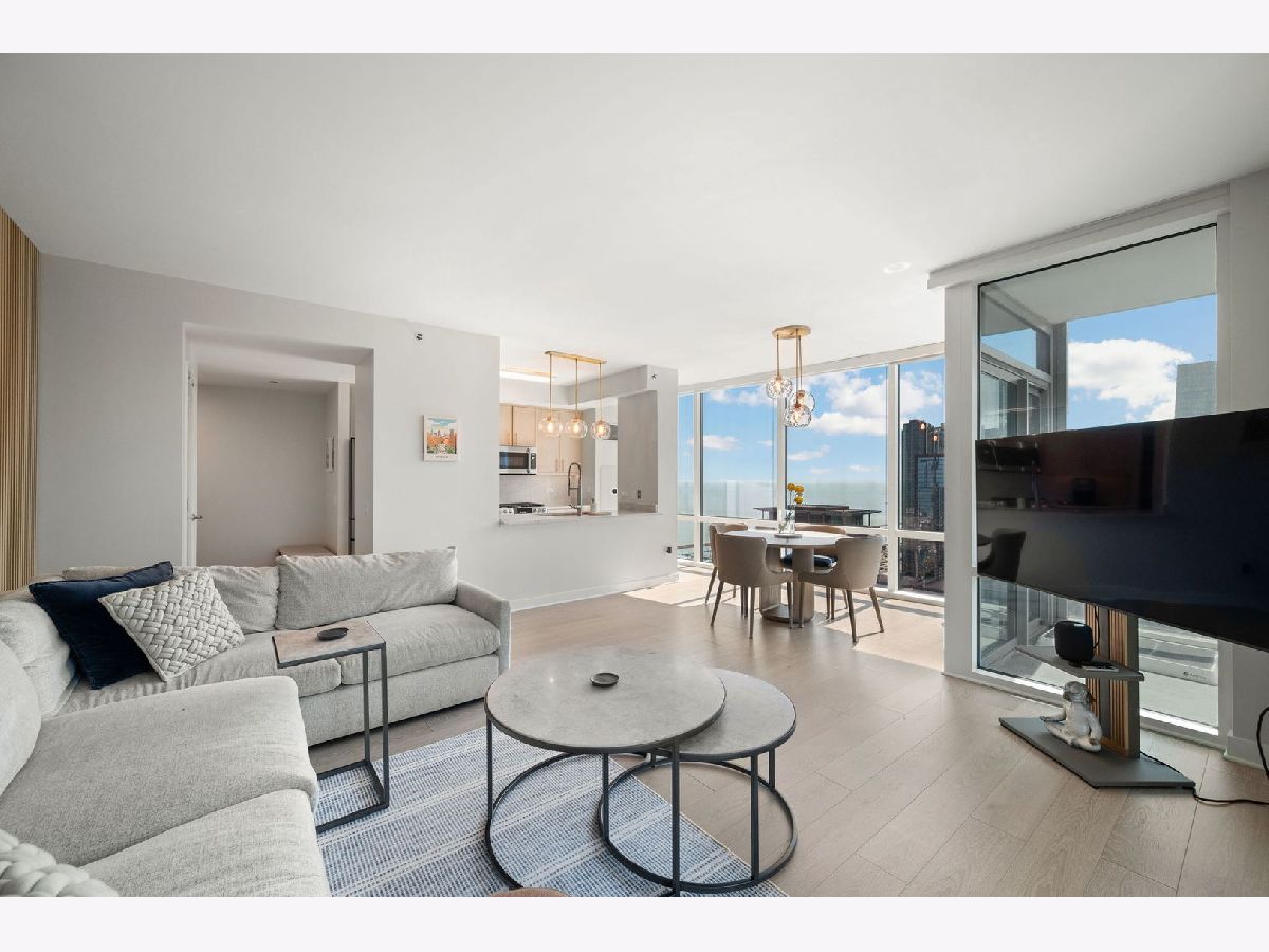 Totally renovated and reimagined 37th-floor residence at ParkView Condominiums, showcasing modern, fresh finishes throughout-truly no detail overlooked. From the moment you enter, you're welcomed by the smooth, seamless flow of wide-plank whitewashed flooring that carries throughout the home. A gracious gallery foyer provides the perfect space for an entry console or to showcase your favorite artwork. The chef's kitchen is a standout, featuring all-new cabinetry, a thoughtfully designed pantry, GE Cafe Series designer appliances, quartzite countertops, a chef's faucet, and under-cabinet lighting-perfectly blending style and functionality. The expansive corner living and dining area is flooded with natural light and framed by stunning south, east, and west exposures, offering breathtaking views of the lake and skyline. Floor-to-ceiling windows with automated roller shades complete this ideal space for both relaxing and entertaining. The thoughtfully designed layout places both bedrooms in a private wing of the home. The second bedroom includes a built-in Murphy bed, making it ideal for guests or a work-from-home setup. The spacious primary suite features a wall of windows with custom window treatments, a ceiling fan, and a fully built-out walk-in closet. The spa-inspired primary bath is finished in elegant stone and includes dual vanities, lighted mirrored medicine cabinets, a separate tiled shower, and a Jacuzzi tub, all complemented by a large window with an automated shade. This home has been fully customized with upgraded lighting and smart home automation throughout, offering a truly move-in-ready experience with exceptional attention to detail. ParkView Condominiums is a professionally managed, full-amenity building featuring 24-hour door staff, an exercise room, hospitality suite, conference room, bicycle storage, and an outdoor pool with sundeck. Ideally located adjacent to Bennett Park with a dog park, and just steps to the lakefront, Target, Whole Foods, and an abundance of shopping and dining options. Convenient to Northwestern Medical Campus. Non-smoking building. Deeded parking available for an additional $40,000.
