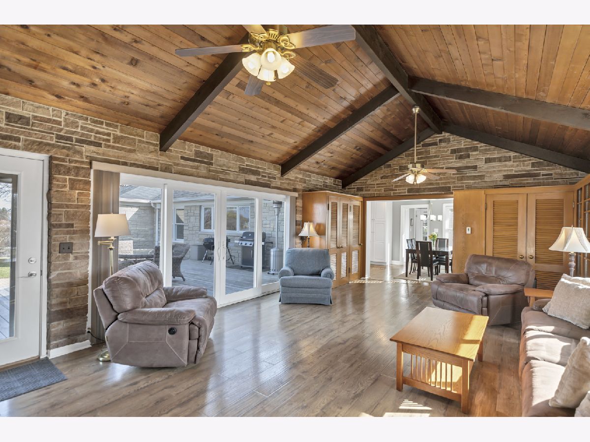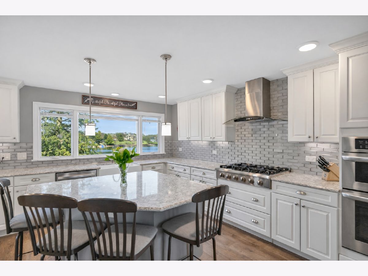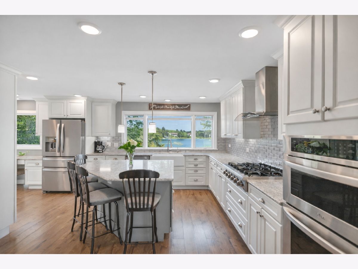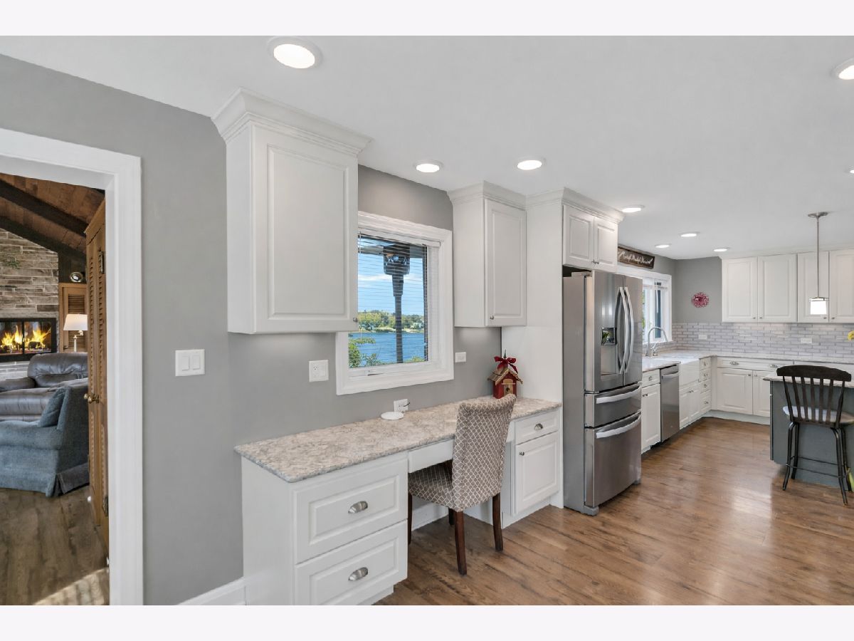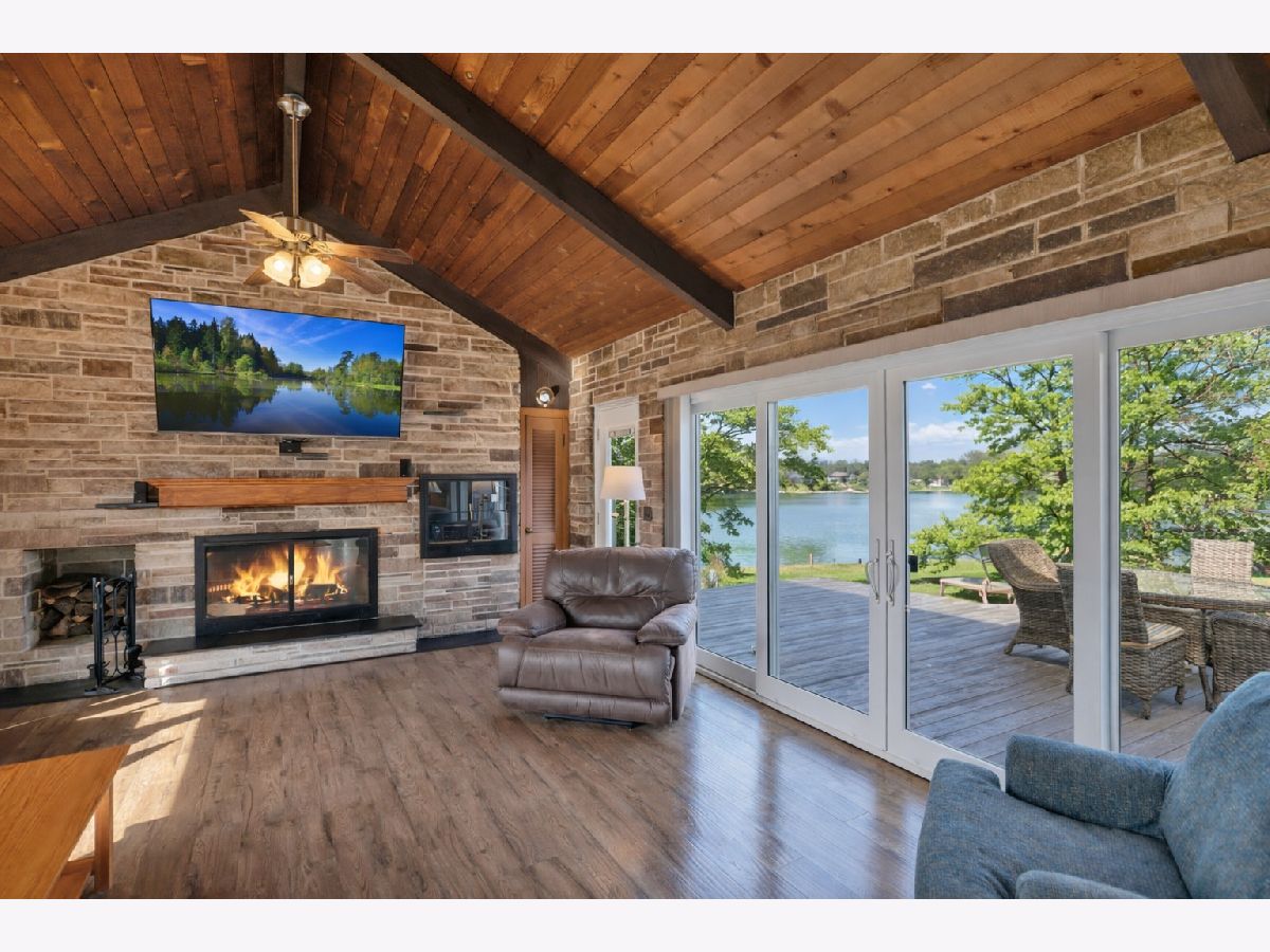 Once in a lifetime opportunity... this is an INCREDIBLE DEAL!! Serene waterfront ranch set on 3.22 private, tree-lined acres, offering a rare combination of privacy, space, and access to the Chain O'Lakes through the HOA marina just down the block. Perfectly positioned on crystal clear, tranquil, swimmable Weston Lake, this property delivers the lake lifestyle buyers dream about, with the ability to secure a boat slip annually through the HOA and breathtaking water views throughout the home. A long, private driveway welcomes you in with ample parking and an attached, heated 2-car garage. This home blends modern updates with timeless design. Marvin windows, whole-home water filtration, water softener, and a Culligan reverse osmosis system servicing the kitchen sink and refrigerator add comfort, efficiency, and quality throughout. The home features two complete heating systems, including comfortable radiant heat and forced air gas heating, offering flexibility and year-round efficiency. Radiant heated floors are located in the great room, enhancing comfort in one of the home's most impressive spaces. Pergo flooring flows seamlessly throughout, adding durability and a clean, cohesive look. The living room is filled with natural light, featuring a subtle coffered ceiling, crown molding, and a wall of oversized picture windows with operable side panels that frame tranquil water views. The chef's kitchen is a true showpiece. Designed for both everyday living and entertaining, it offers upgraded white cabinetry, quartz countertops, a classic subway tile backsplash, stainless range hood, gas cooktop, and double oven. The oversized island with breakfast bar creates the perfect gathering space, while a kitchen desk and a custom floor-to-ceiling pantry with dedicated coffee and serving station add both function and style. A wall of windows above the sink captures peaceful water views and fills the space with natural light. The separate dining room flows effortlessly into the stunning vaulted great room, where soaring wood-planked ceilings with exposed beams and a dramatic floor-to-ceiling stone fireplace create warmth and architectural impact. A wall of glass doors opens to the deck and frames panoramic water views, seamlessly blending indoor and outdoor living. Step outside to the deck overlooking the water, leading down to a brick paver patio with fire pit, perfect for entertaining, relaxing, and enjoying the setting year-round. The primary suite offers a walk-in closet and a beautifully appointed ensuite with dual sinks, an elegant shaker-style vanity, and a floor-to-ceiling tiled shower with bench and built-in niches. A full hallway bath features an updated vanity with marble countertops, rich cabinetry, and designer finishes. Additional highlights include a spacious laundry room with cabinetry and sink, plus a finished basement rec room with abundant storage, workspace, and a second washer and dryer. Enjoy the best of both worlds with peaceful waterfront living and convenient access to everything McHenry has to offer. Just minutes from downtown McHenry and the vibrant Green Street district, you'll find local shopping, restaurants, and waterfront dining along the Fox River. Moraine Hills State Park offers miles of scenic trails, biking, kayaking, and nature preserves, while the Chain O'Lakes provides endless opportunities for boating and recreation. Easy access to Route 31 and nearby Metra stations makes commuting simple. This is more than a home. It's a lifestyle.